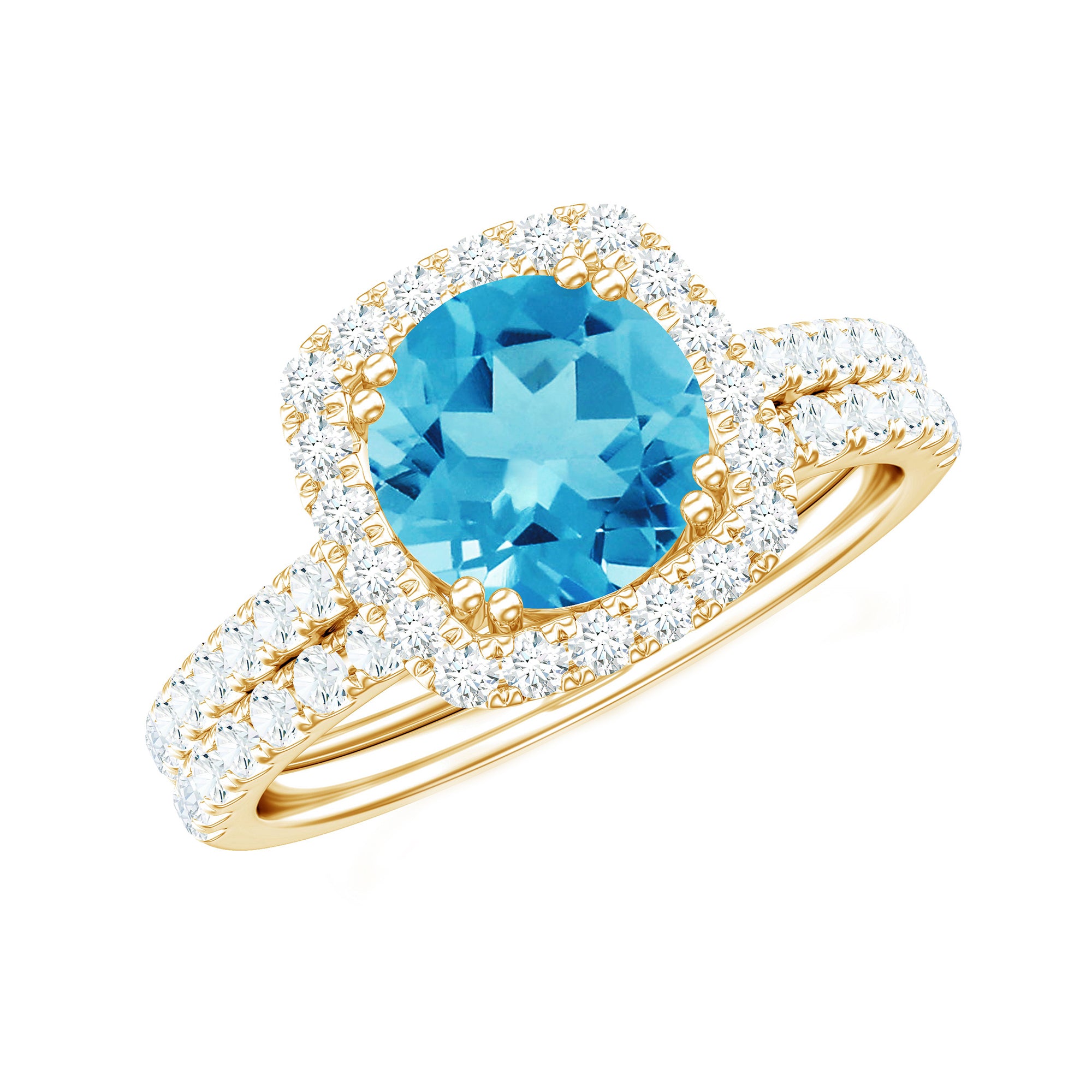 Adorn yourself with this elegant Swiss Blue Topaz and Moissanite Stackable Ring Set. Embellished with Round Cut Swiss Blue Topaz set at the center in a double prong setting encircled with round Moissanite and more moissanites are set as side stones and stackable band is studded with moissanite, composed in Gold metal.