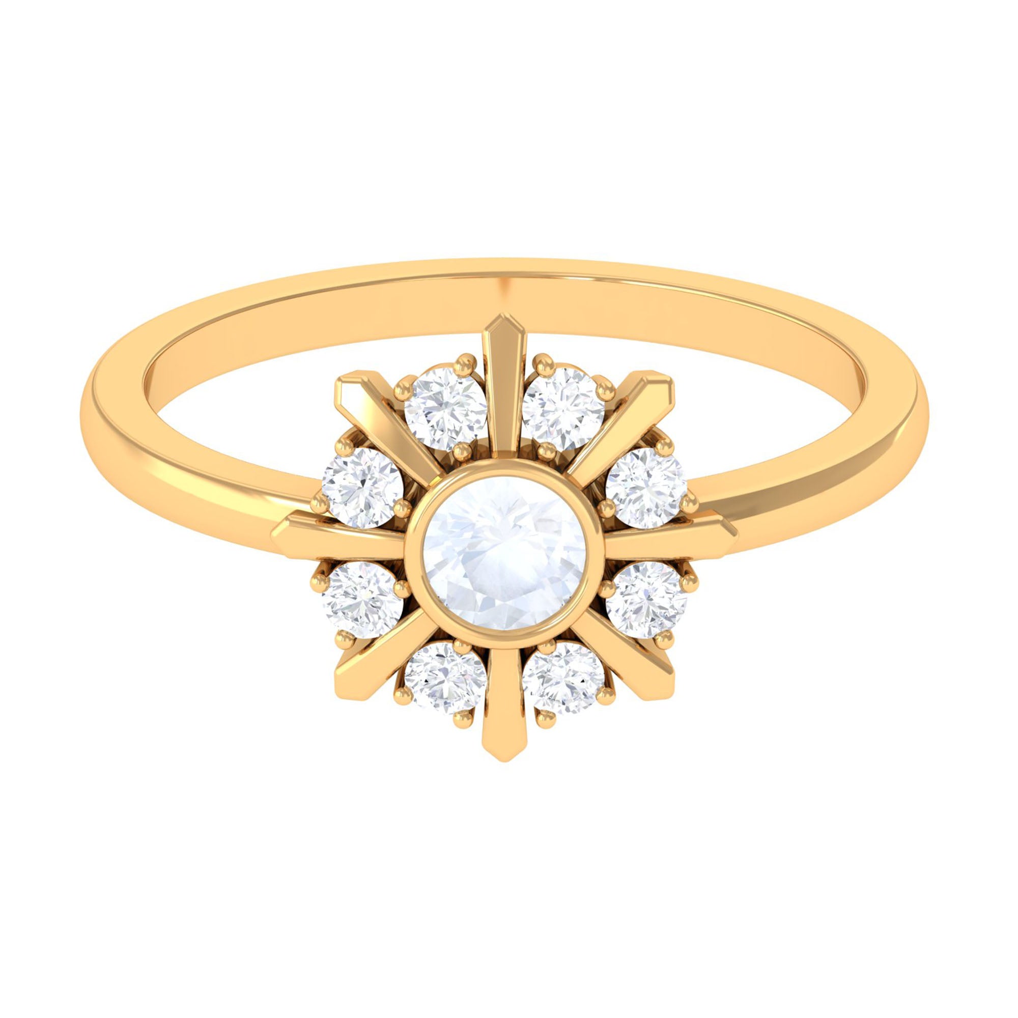Express your love with this Statement Ring towards your lady. This June Birthstone Ring is adorned with Round Shape Moonstone as a Solitaire in a Bezel Setting surrounded by Round Diamond in a prong setting. This Moonstone and Diamond Ring is mounted in Gold Metal.