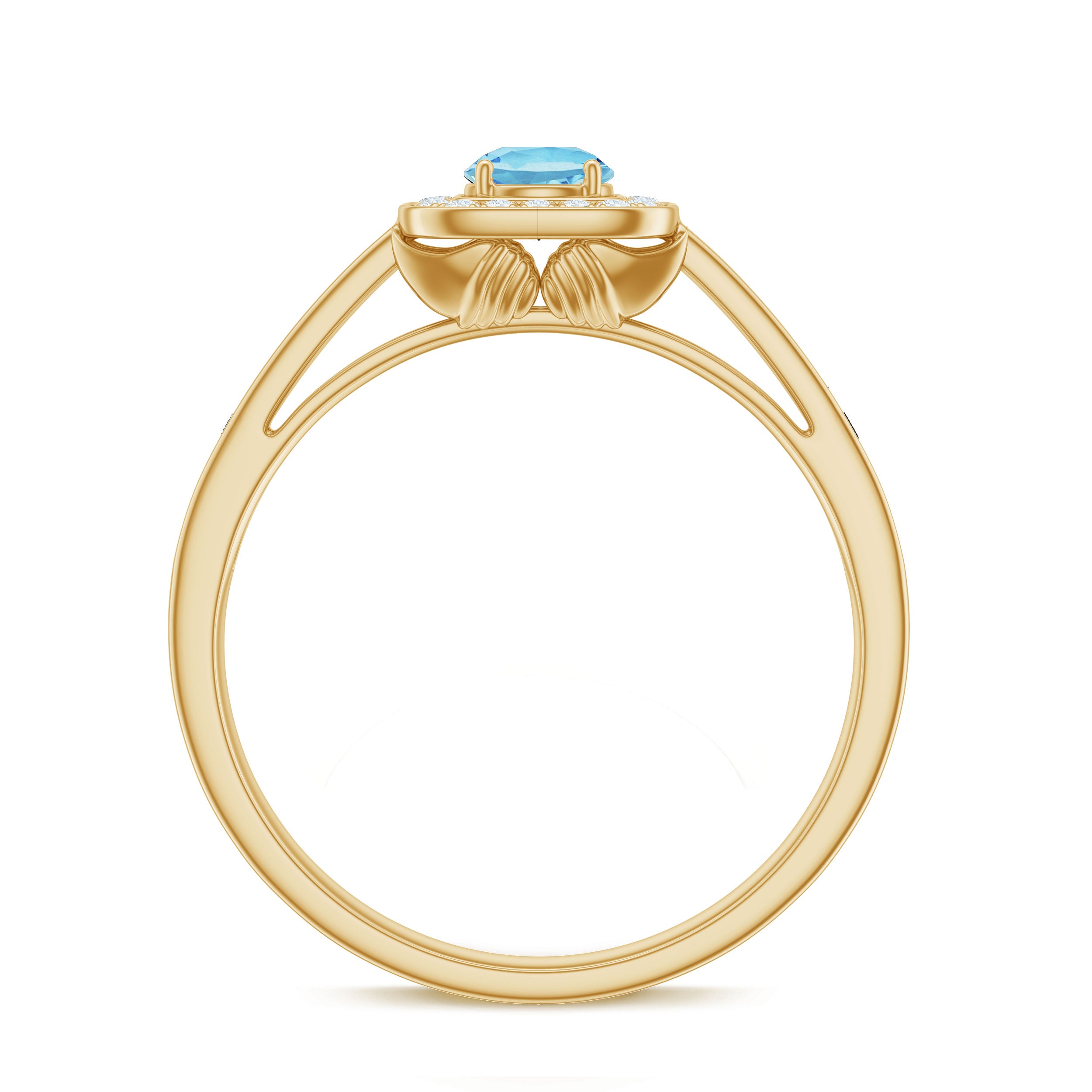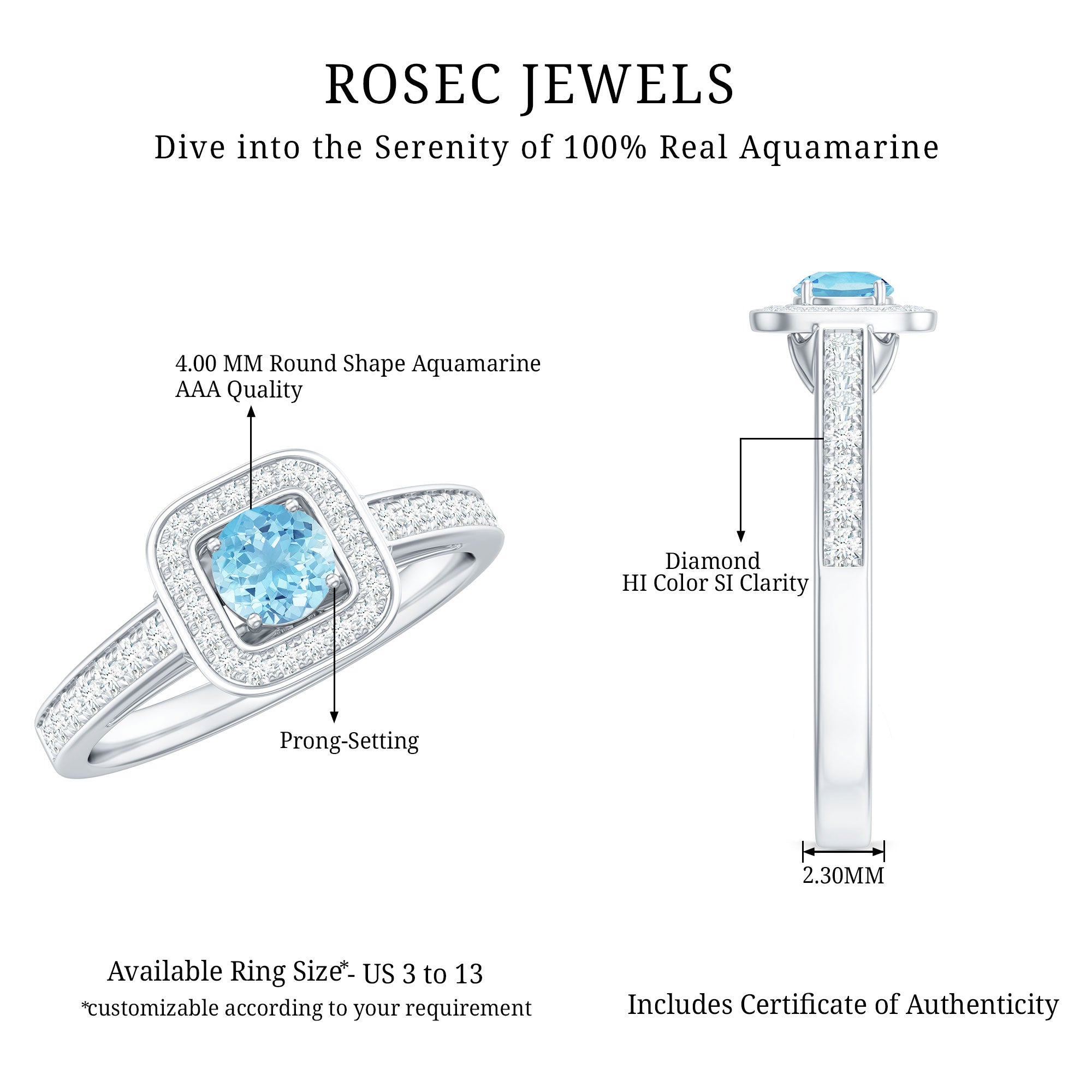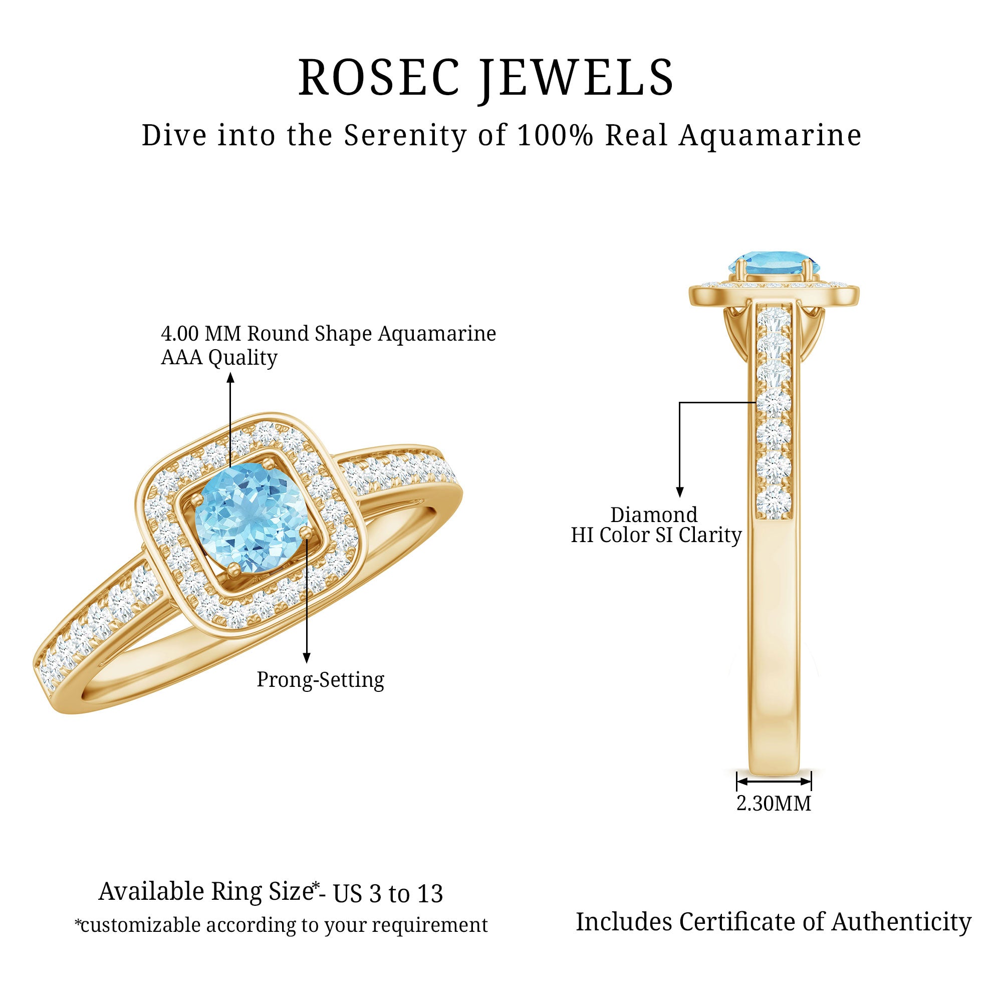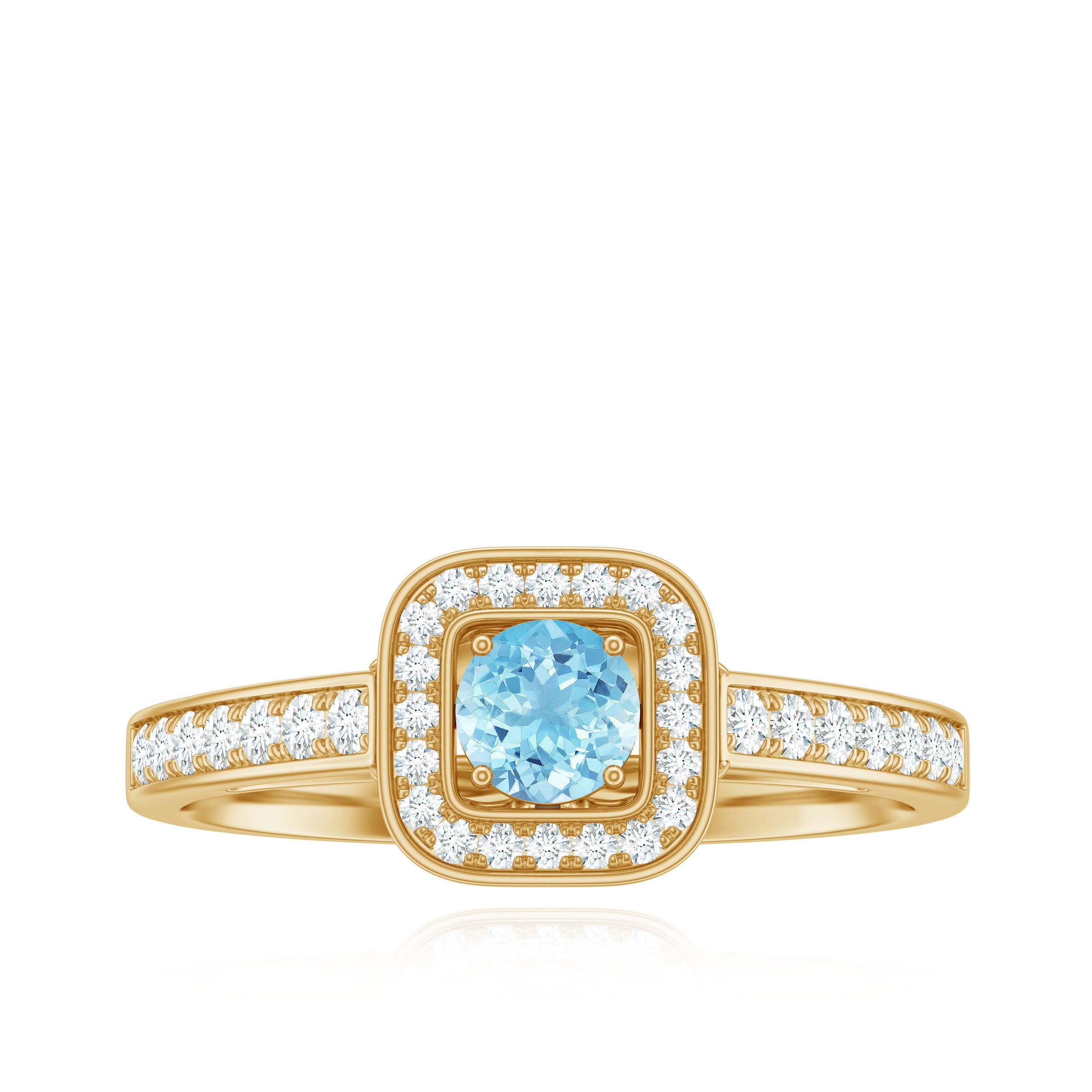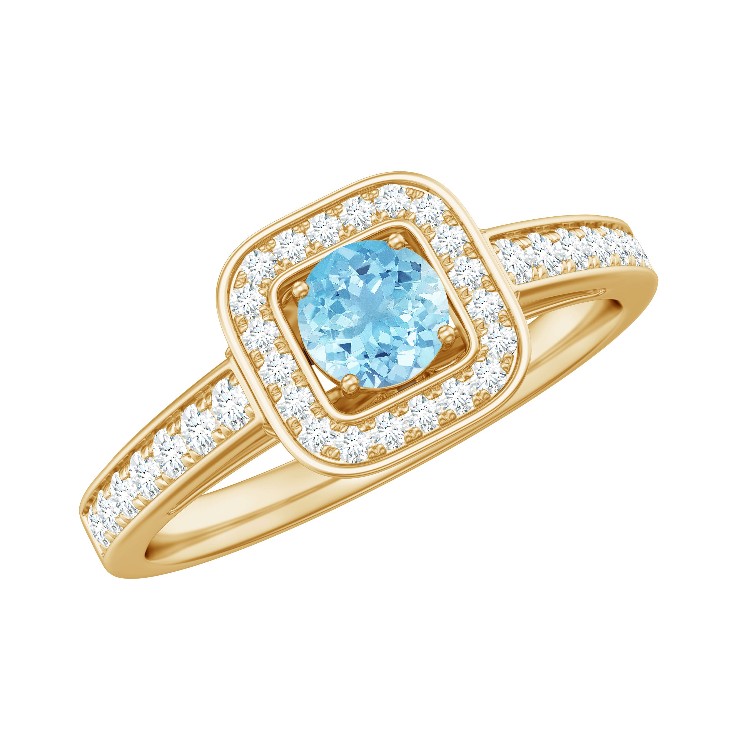 Adorn yourself on your special day with this beautiful Halo Promise Ring adorned with sparkling Round Shape Aquamarine in the center in a prong setting with Round Diamond in a halo and Side Stones. Gold Metal build makes this Aquamarine Promise Ring a charming choice for the big occasion.