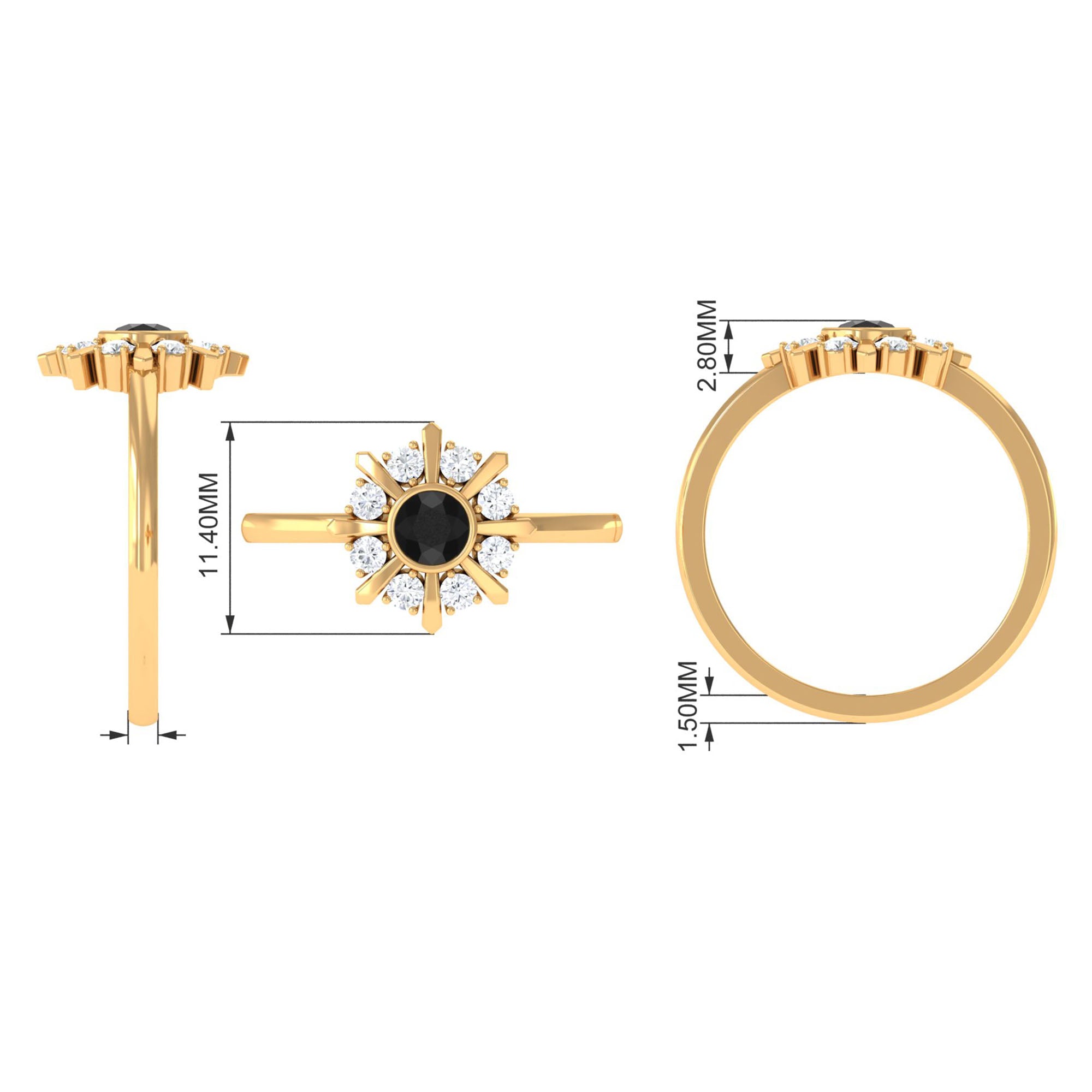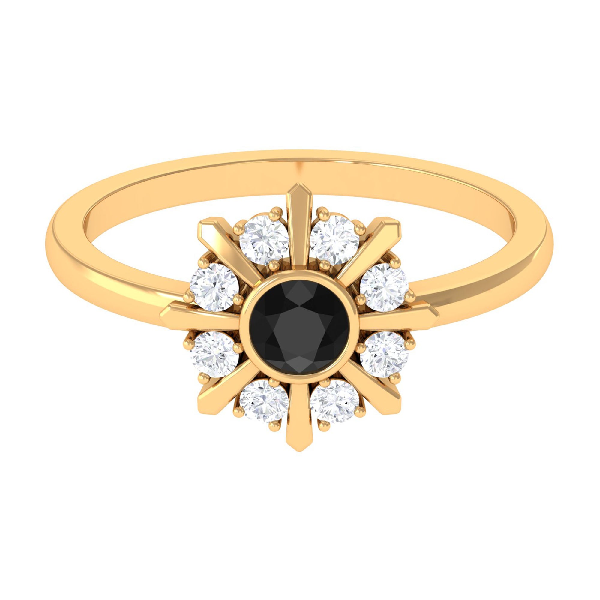 Captivating and alluring Black Spinel and Diamond Statement Ring is handcrafted to perfection in Gold for sumptuous appeal. Round Black Spinel is held in Bezel Setting for an enchanting look. The centrally placed Black Spinel effortlessly draws attention to its incredible radiance.