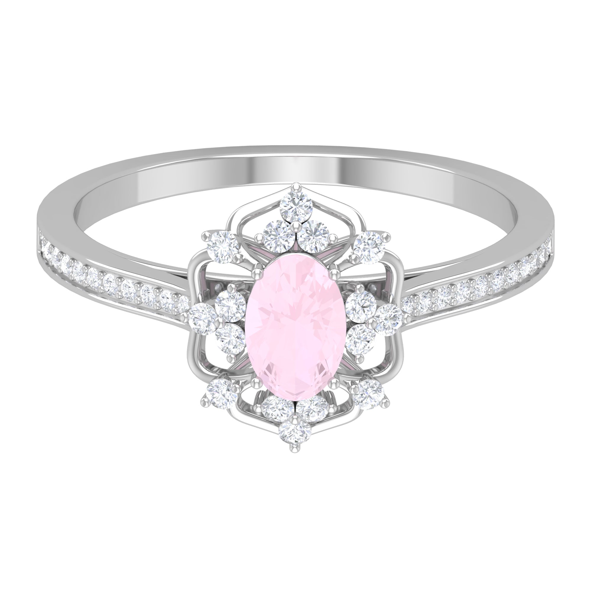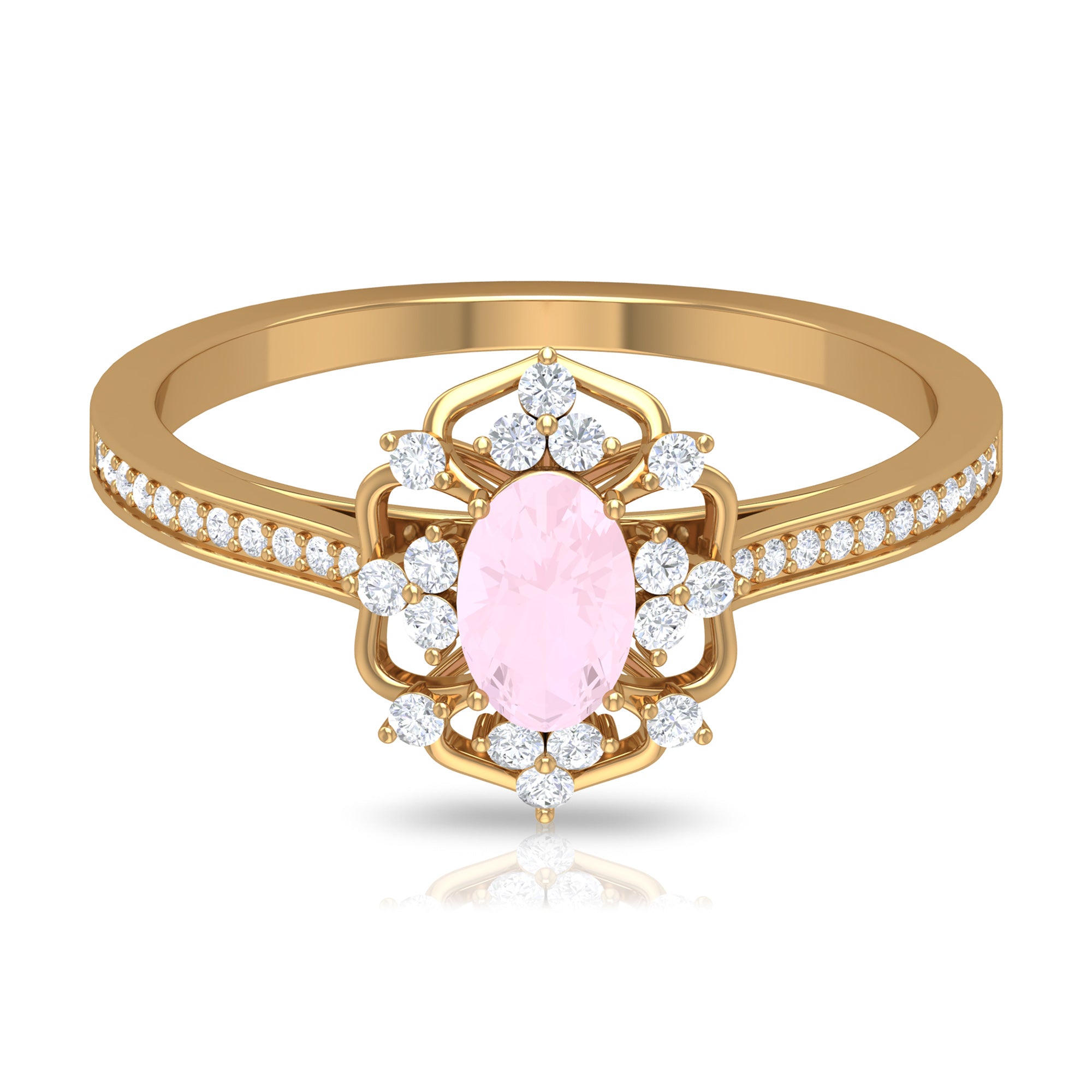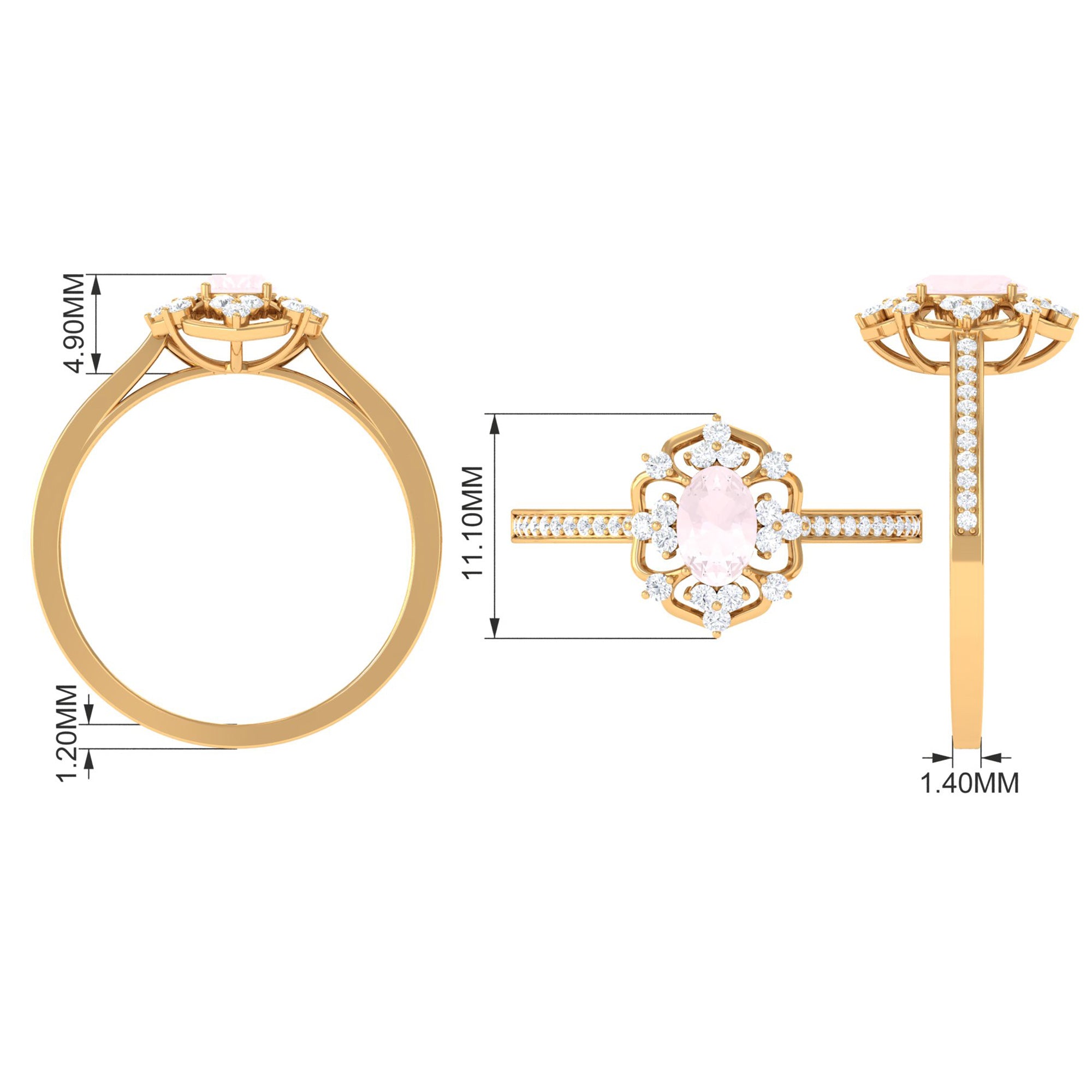 Intensify your look with this Engagement Ring is adorned with Oval Shape Rose Quartz set as a solitaire in a prong setting and Round Shape Diamond accent in a prong setting. This Estate Engagement Ring is mounted in solid gold.