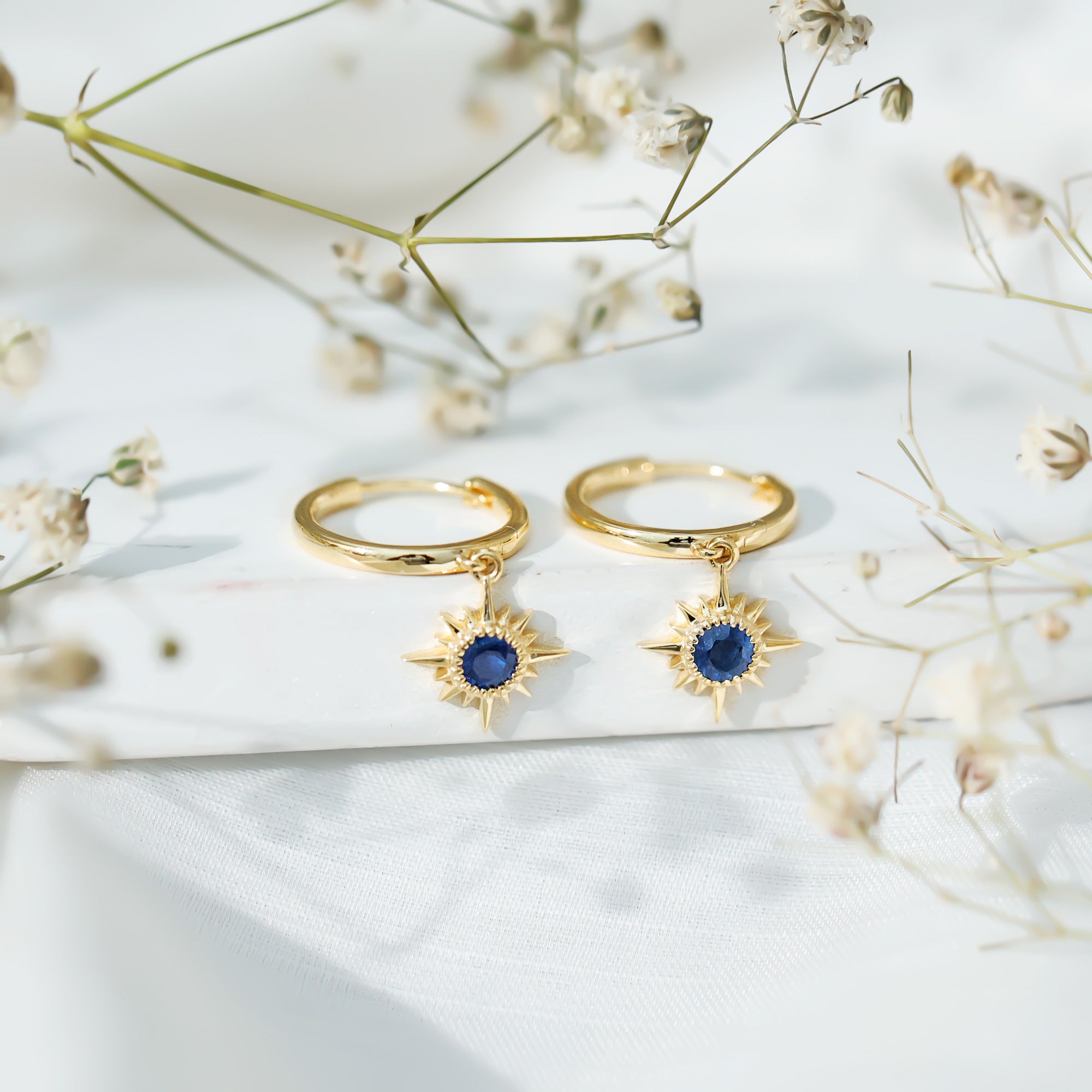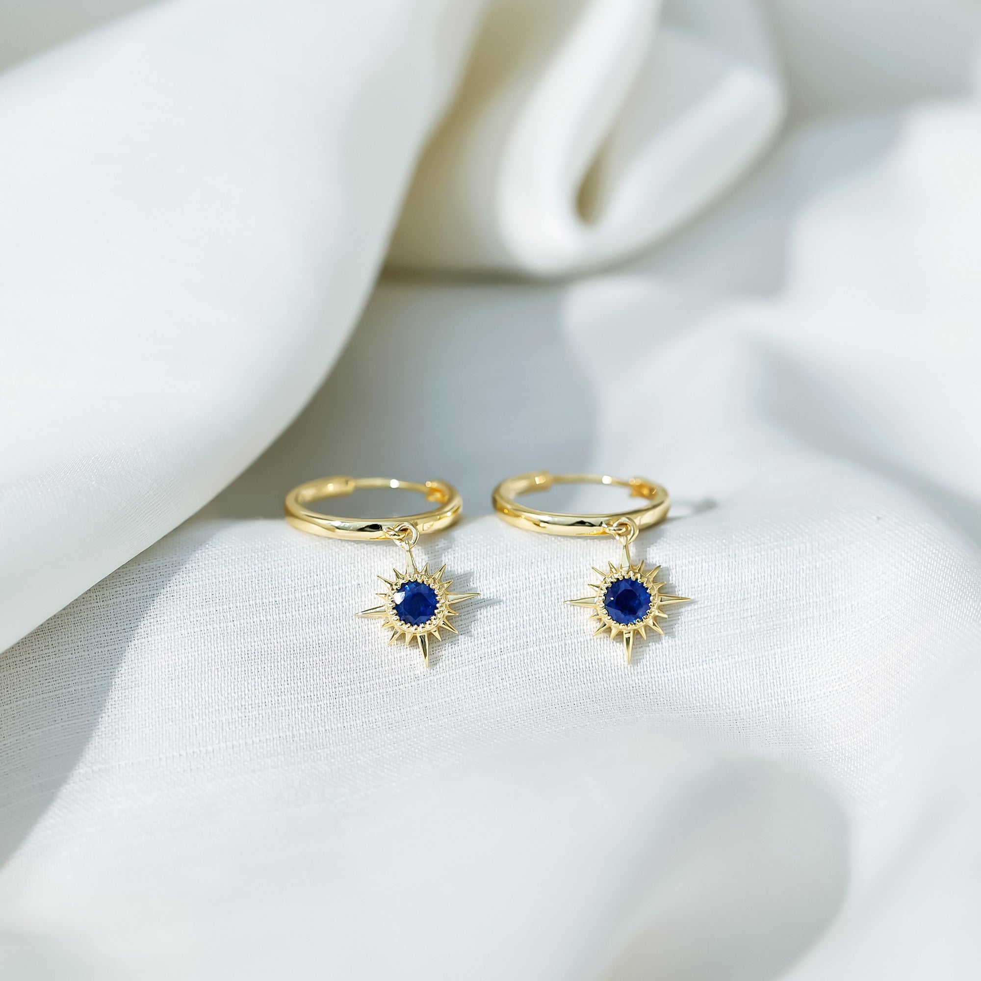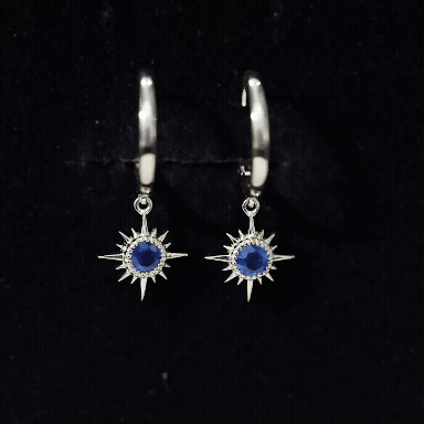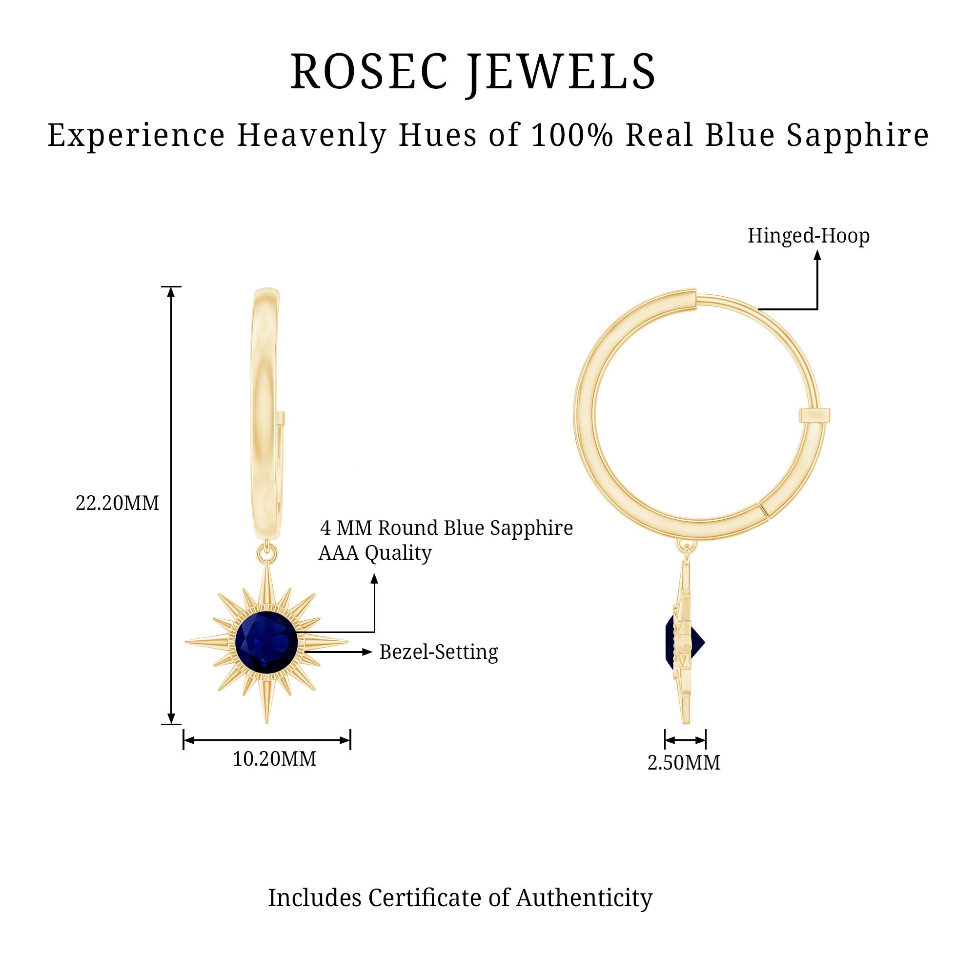 Flaunt with these beautiful Sunburst Drop Hoop Earrings adorned with Round Cut Blue Sapphire set in Milgrain Bezel Setting. These Stud Earrings are Composed of Solid Gold.