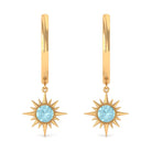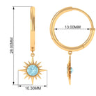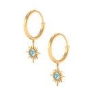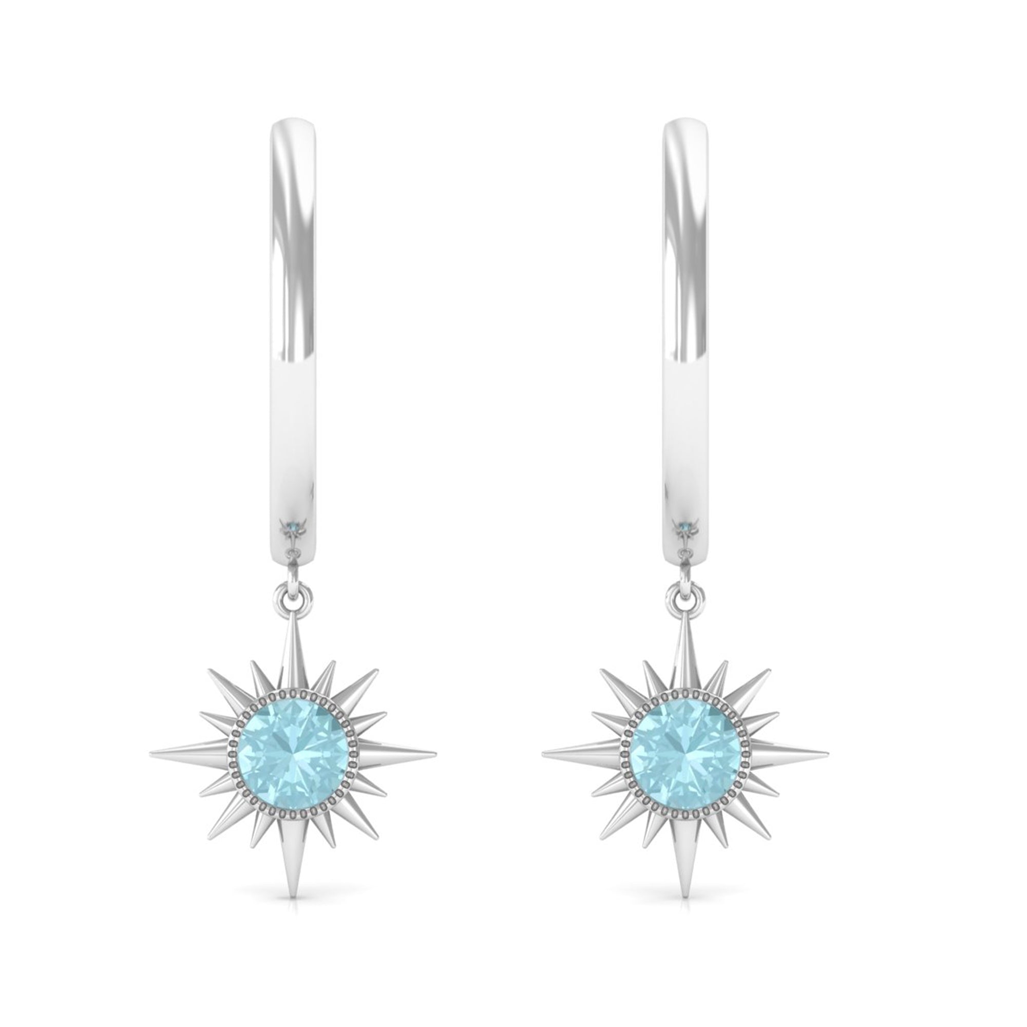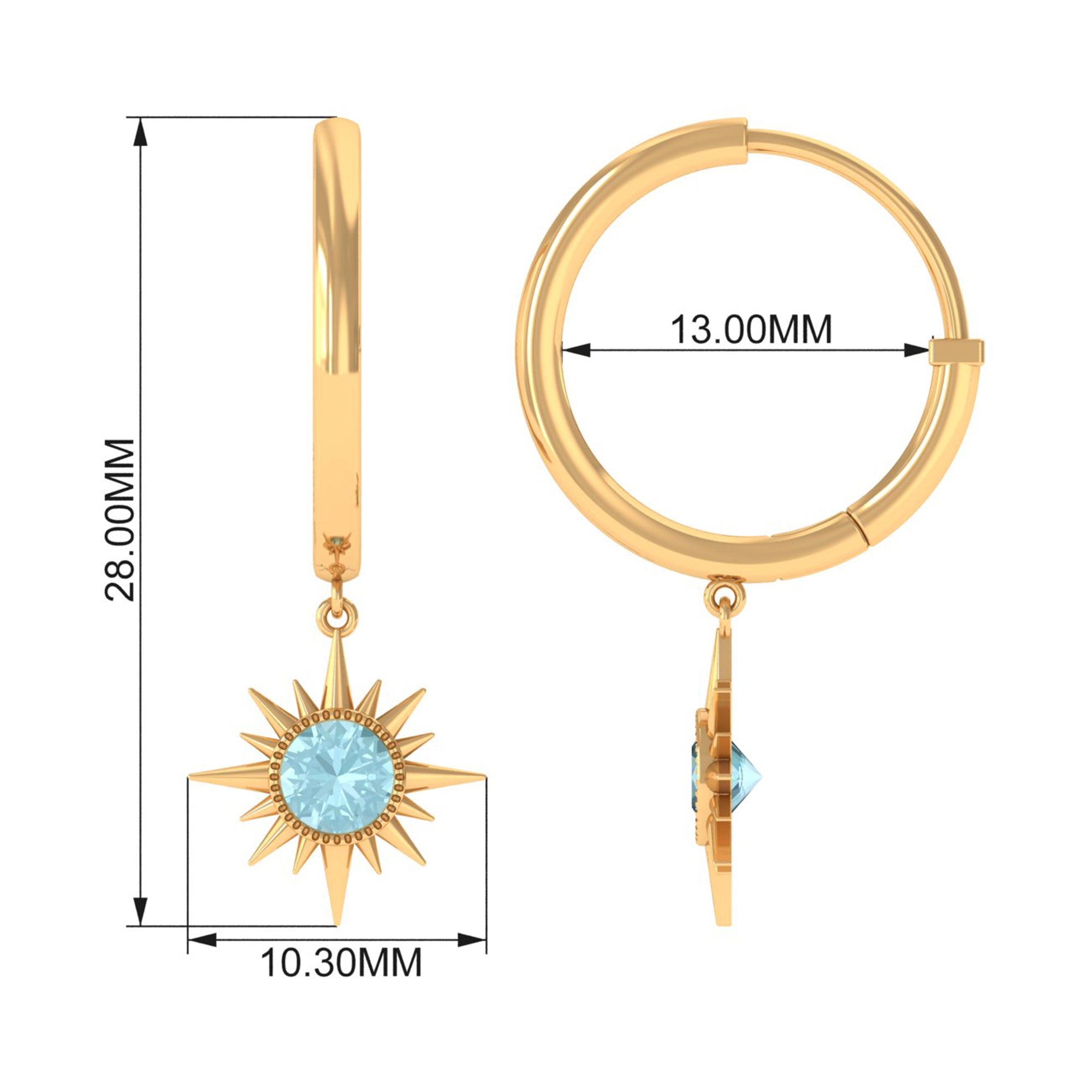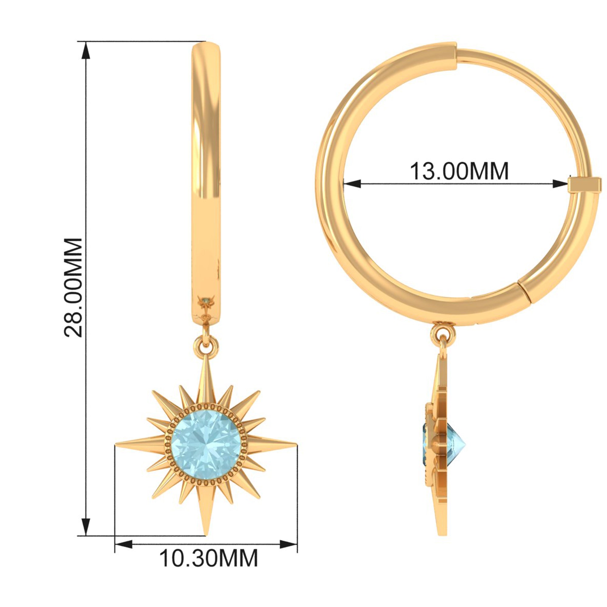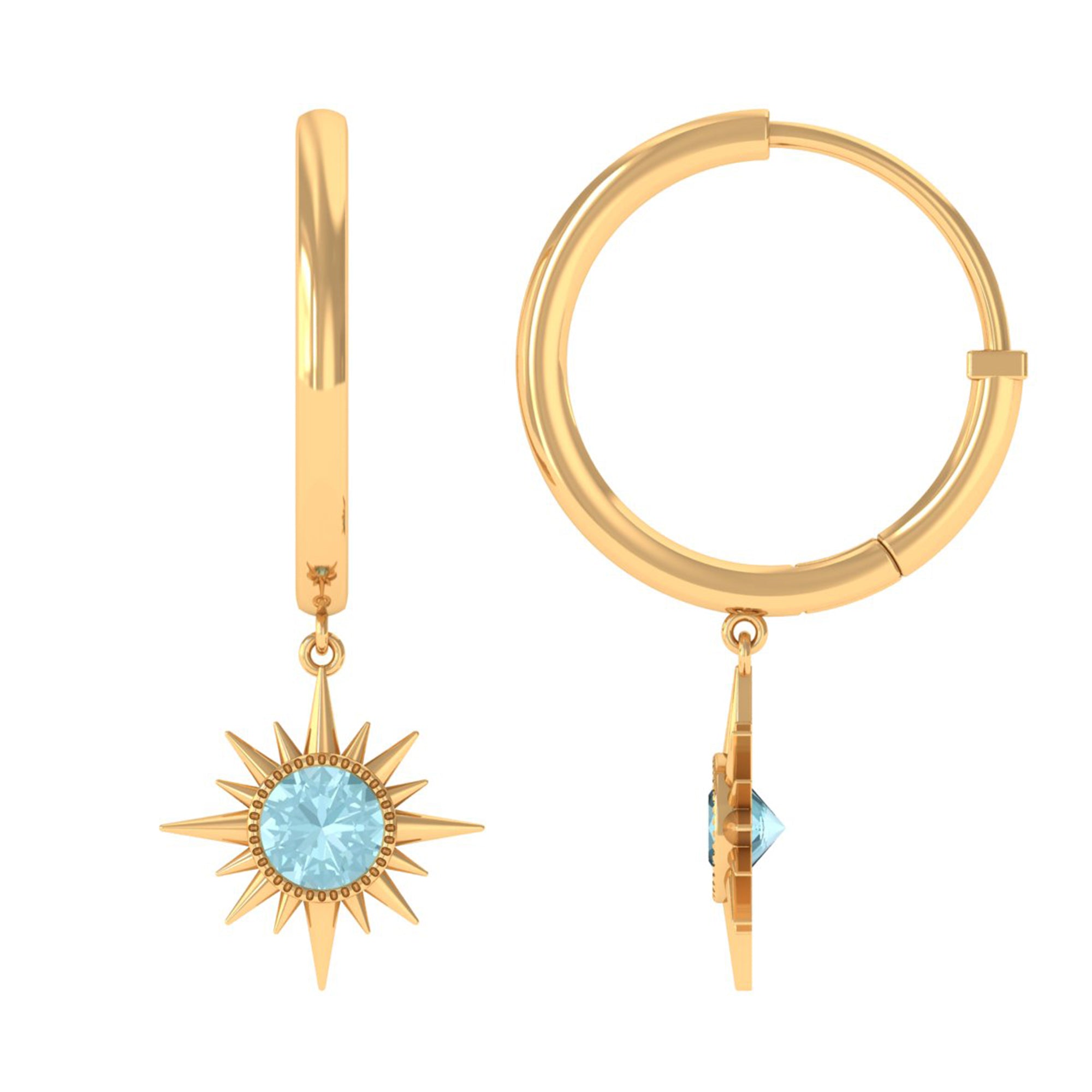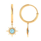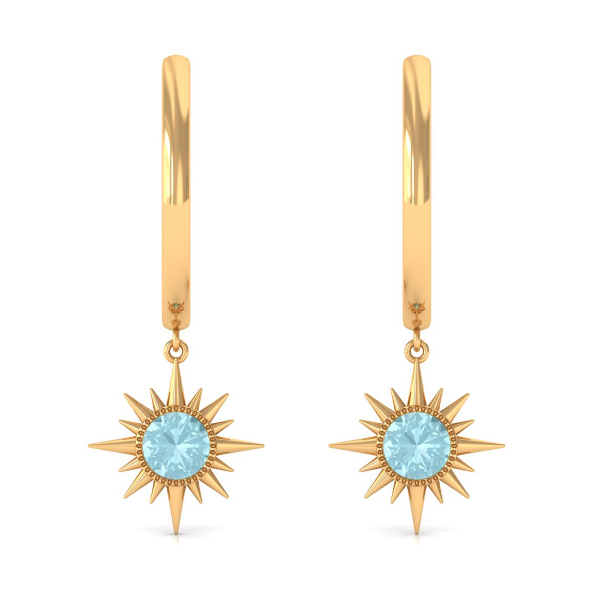 Flaunt with these beautiful Sunburst Drop Hoop Earrings adorned with Round Cut Sky Blue Topaz set in Milgrain Bezel Setting. These Stud Earrings are Composed of Solid Gold.