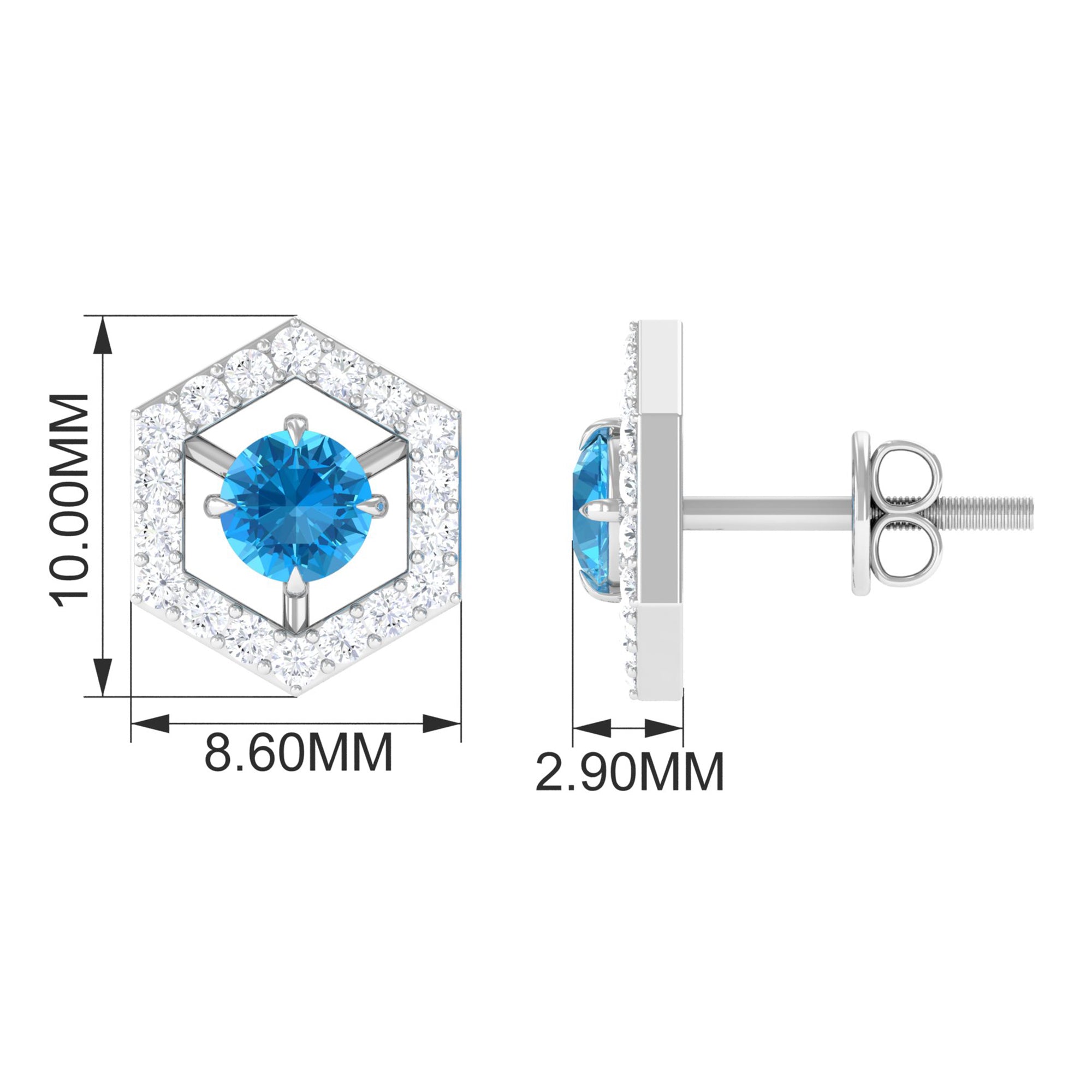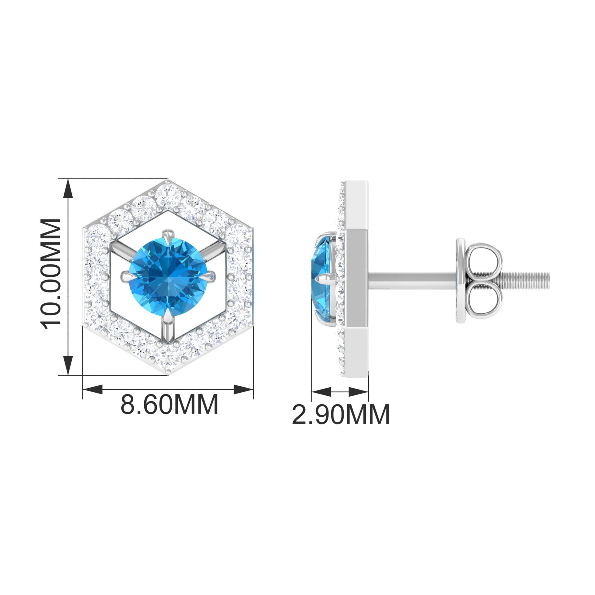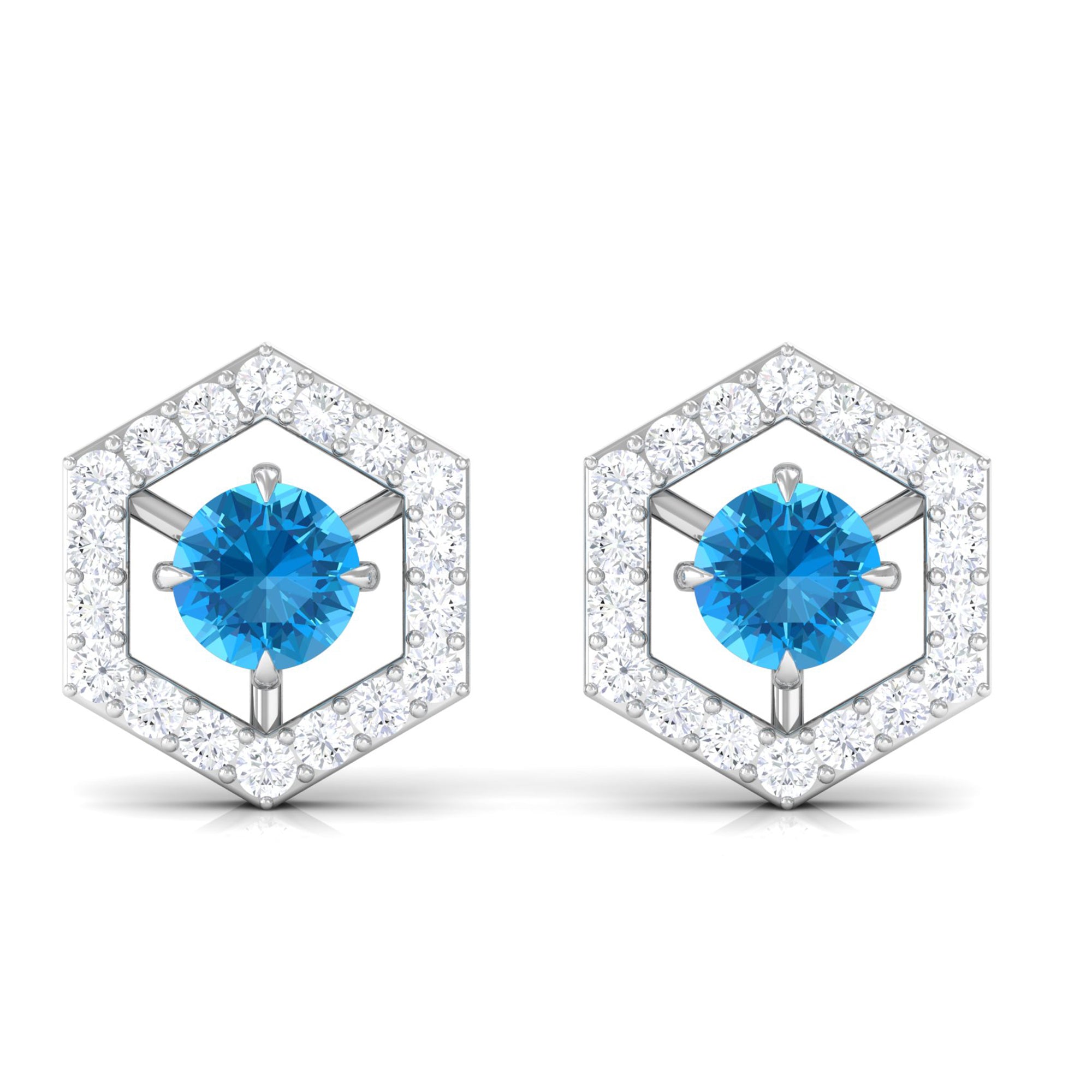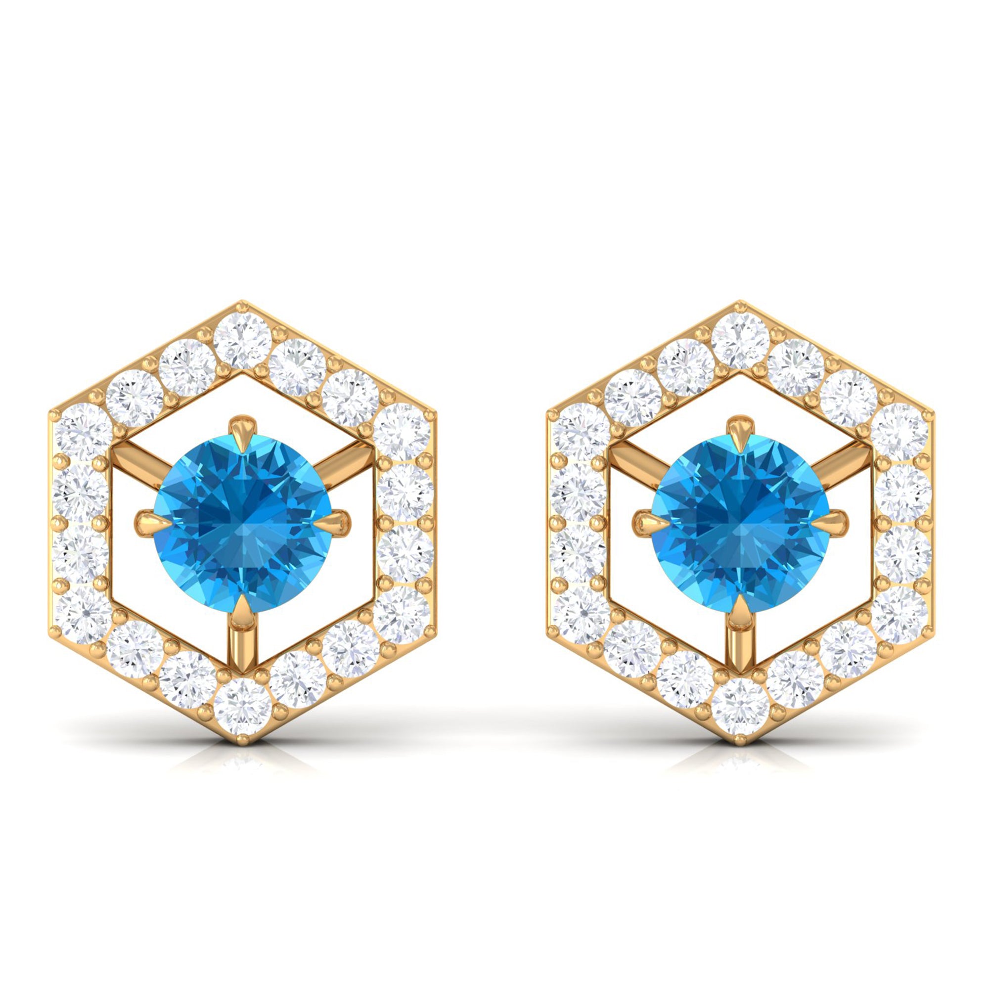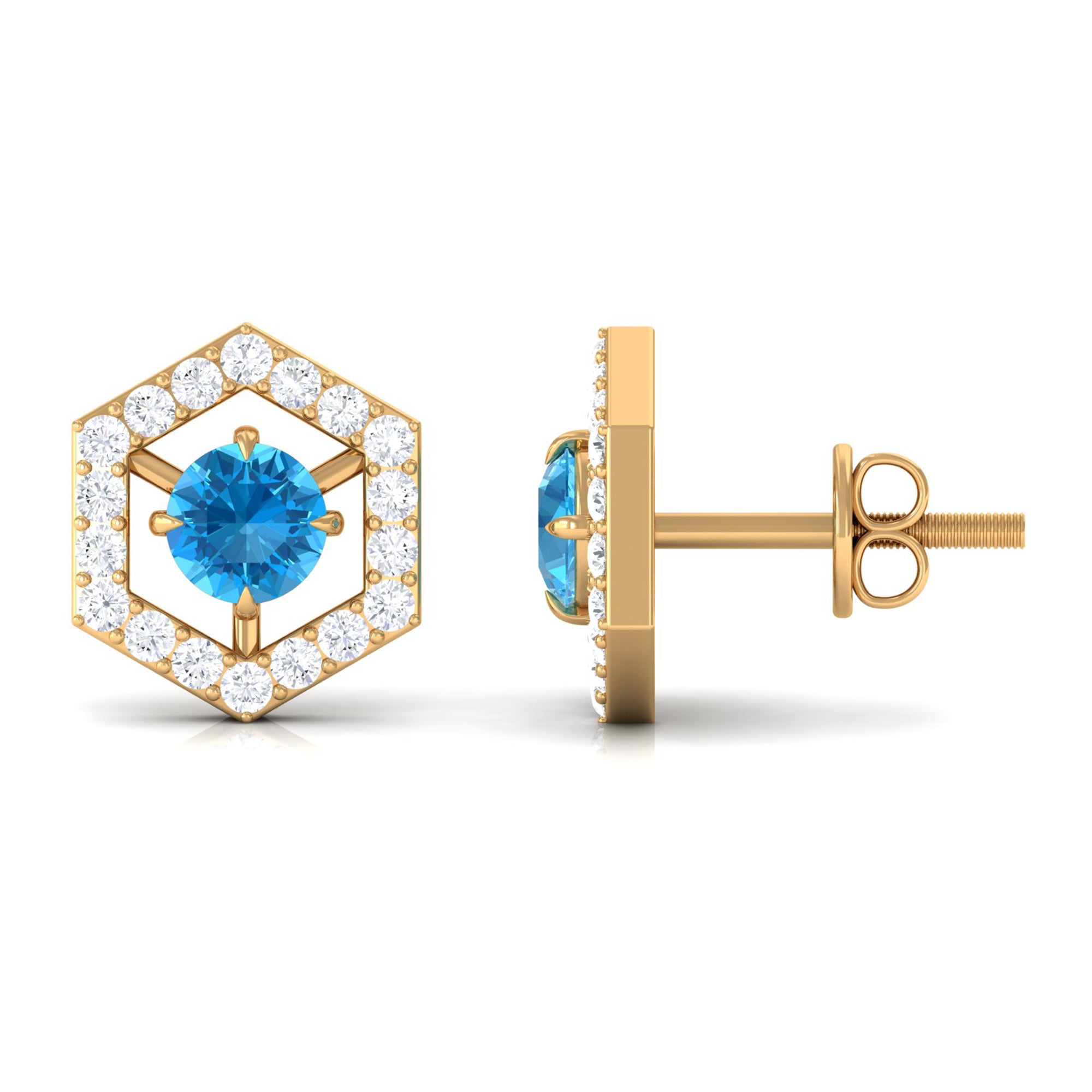 Feel unique with these Geometric Stud Earrings, adorned with Round Shape Swiss Blue Topaz Gemstone set as a center stone with Diamond Accent. These Minimal Stud Earrings are crafted in Solid Gold