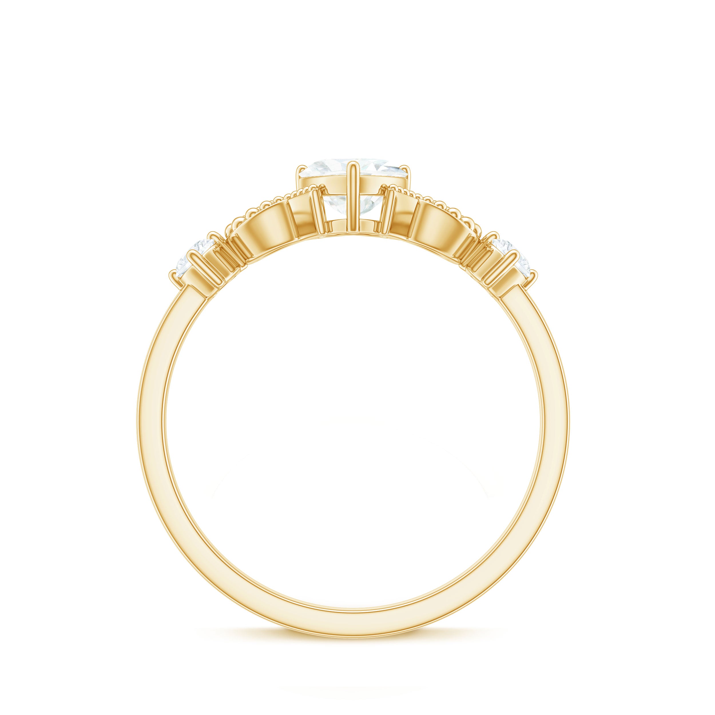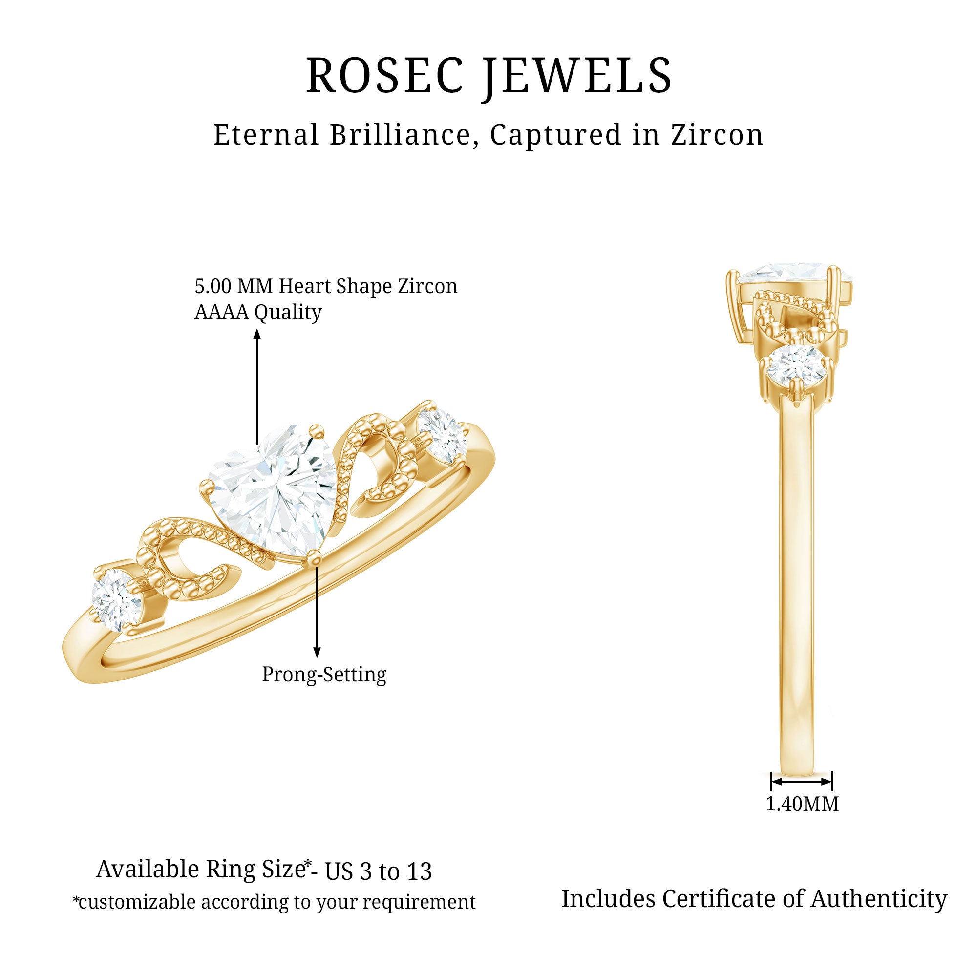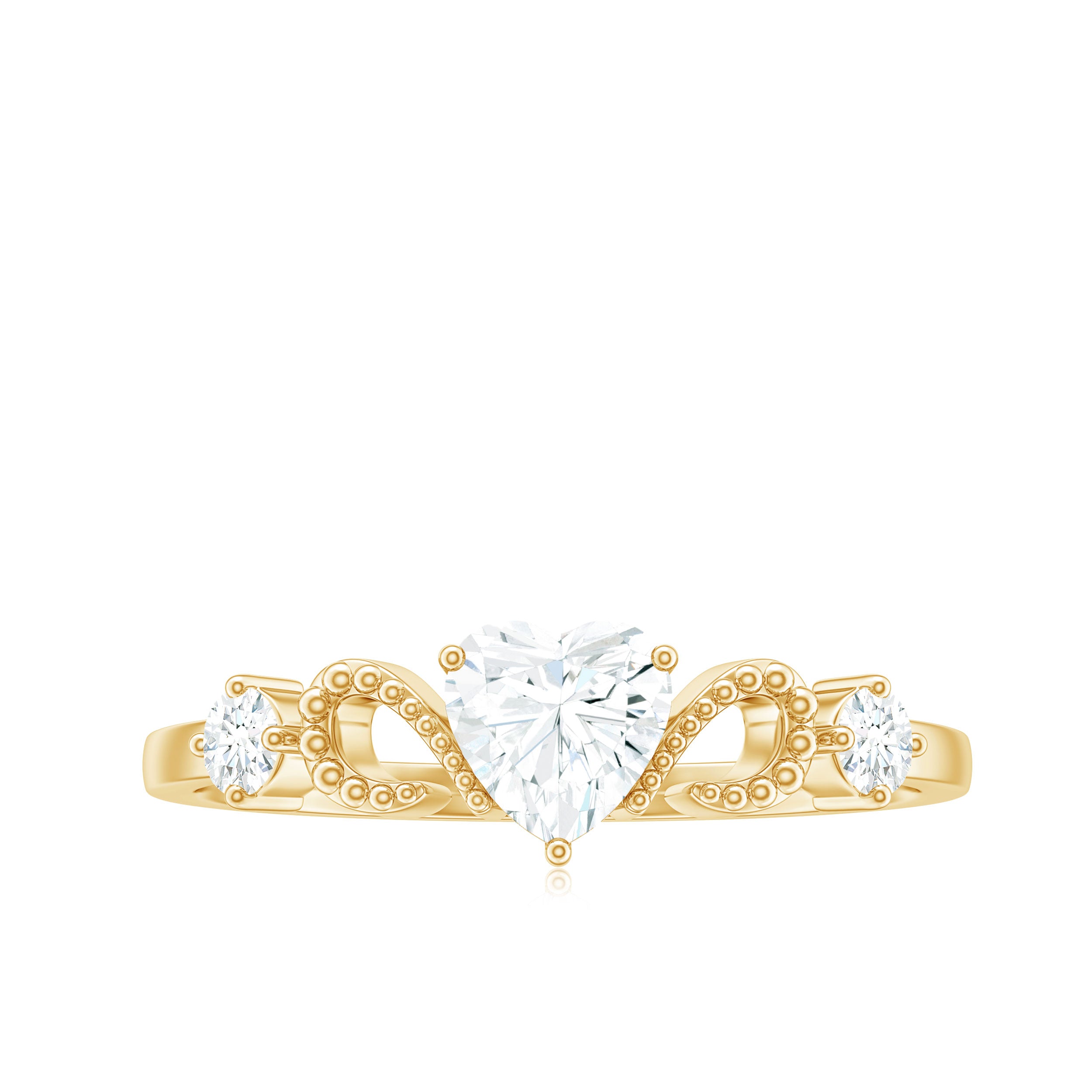 This delicate and timeless Simulated Diamond Jewelry is the perfect symbol of your love. The minimal style makes it perfect for everyday wear and easy to stack with other jewelry. Heavenly crafted in Gold with Heart and Round Shape Cubic Zirconia set in Prong Setting with gold beaded detail, makes a perfect CZ Heart Engagement Ring.