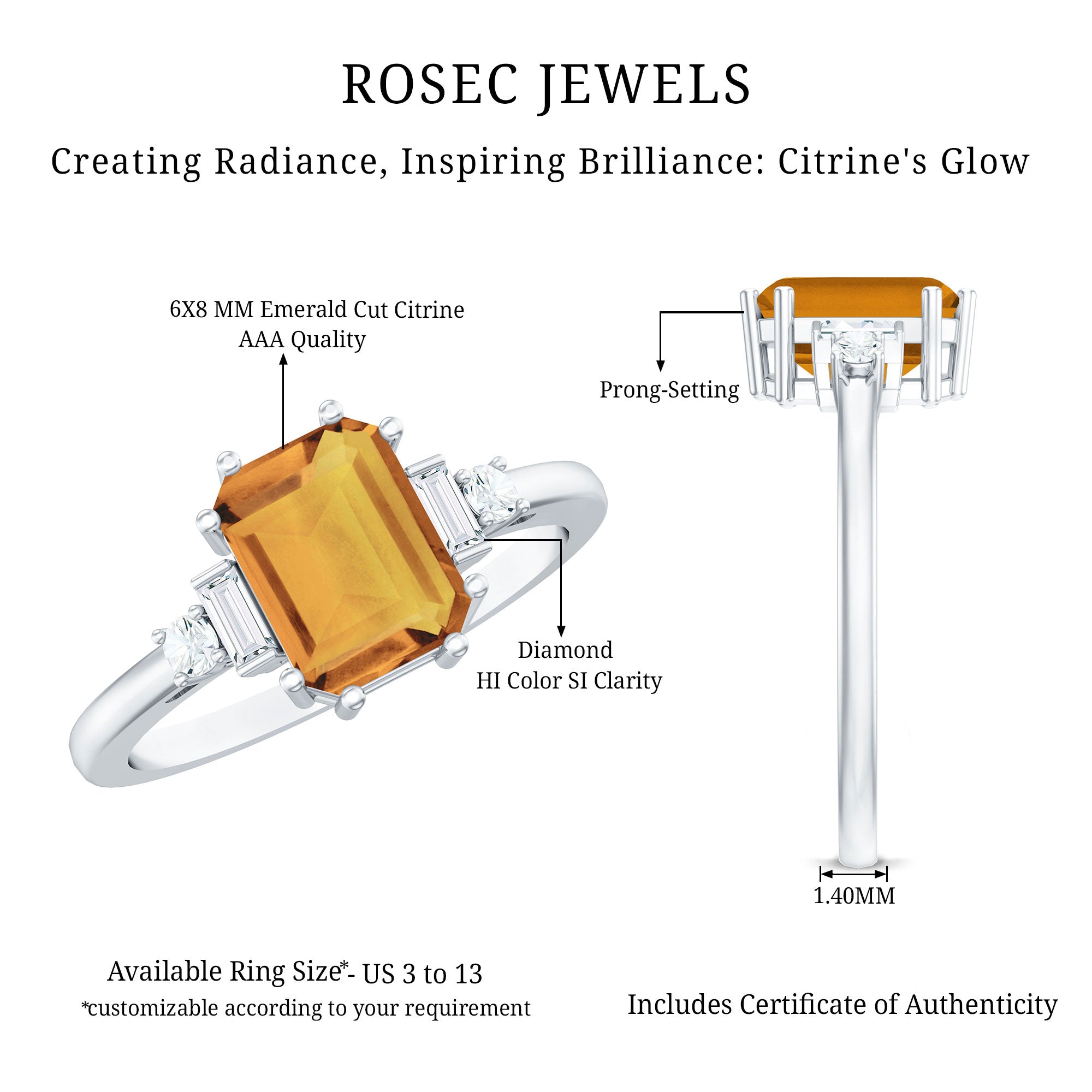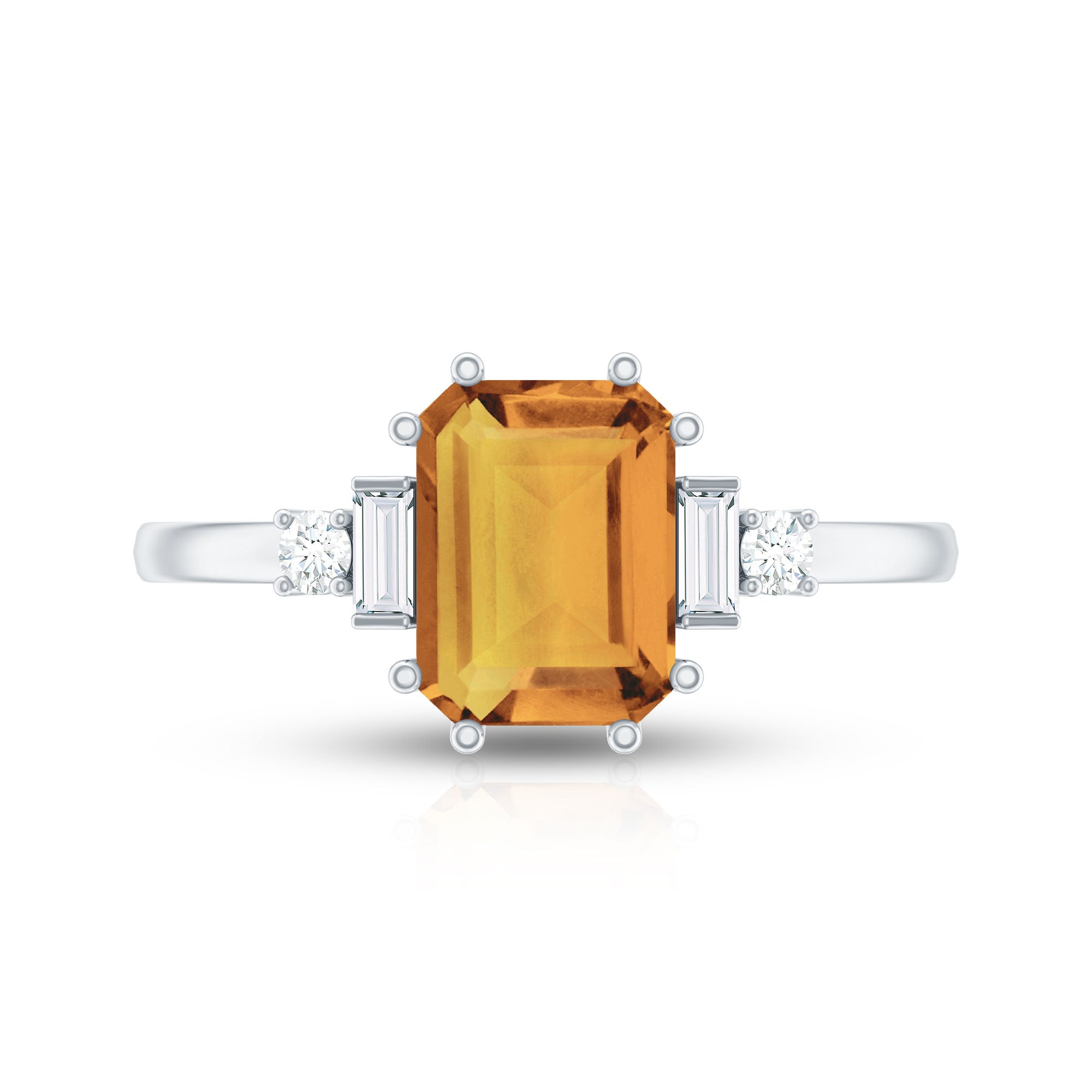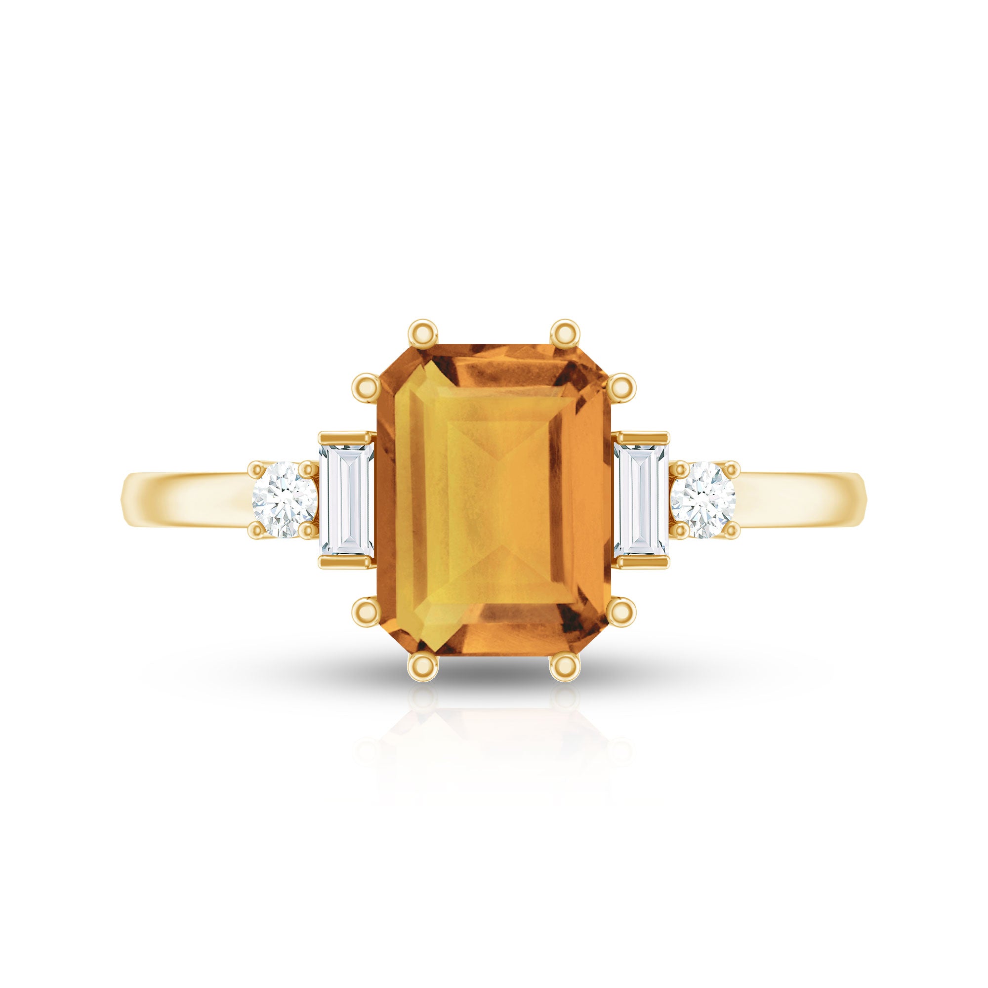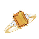Strike out a remarkable statement by wearing this elegant Solitaire Ring embellished with Octagon Cut Citrine in Prong Setting with Round and Baguette Cut Diamond Stones. This Citrine Ring will bring intense shine to your look.