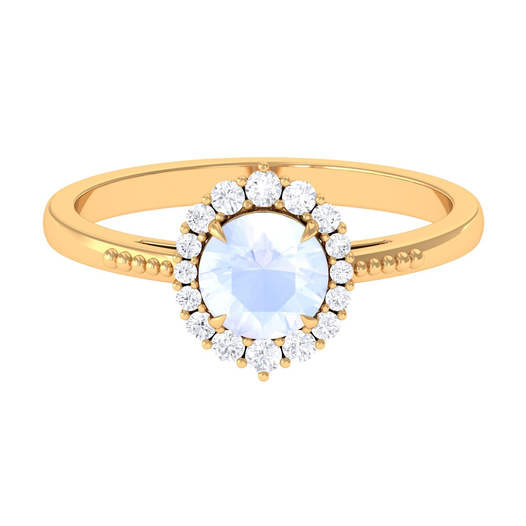 Moonstone Engagement Ring has an extraordinary sparkle because of its Blue hue, having Round Diamond Halo to add more charm to the wearer. This June Birthstone Ring is crafted in Gold for enchanting appeal. Make your special one feel elated with this perfect Moonstone Gold Ring.