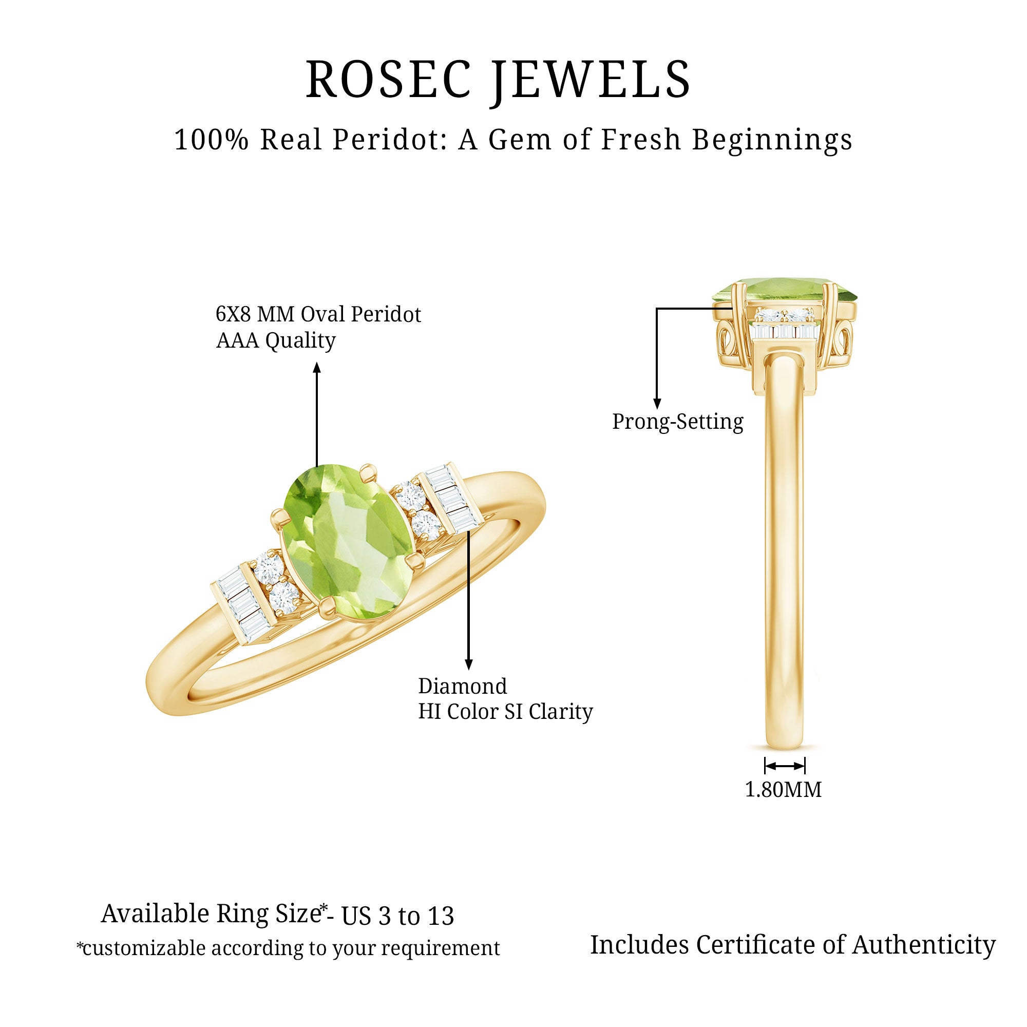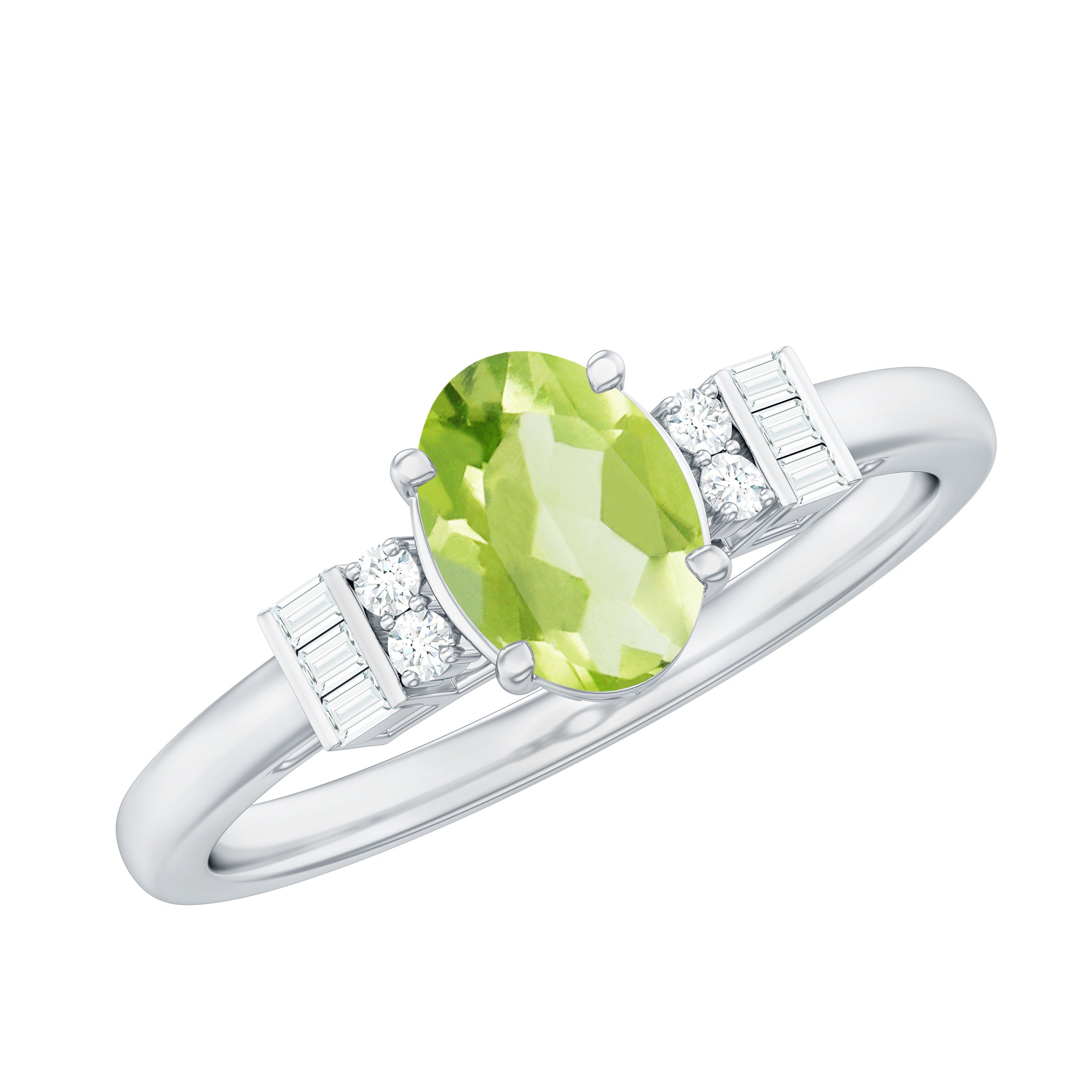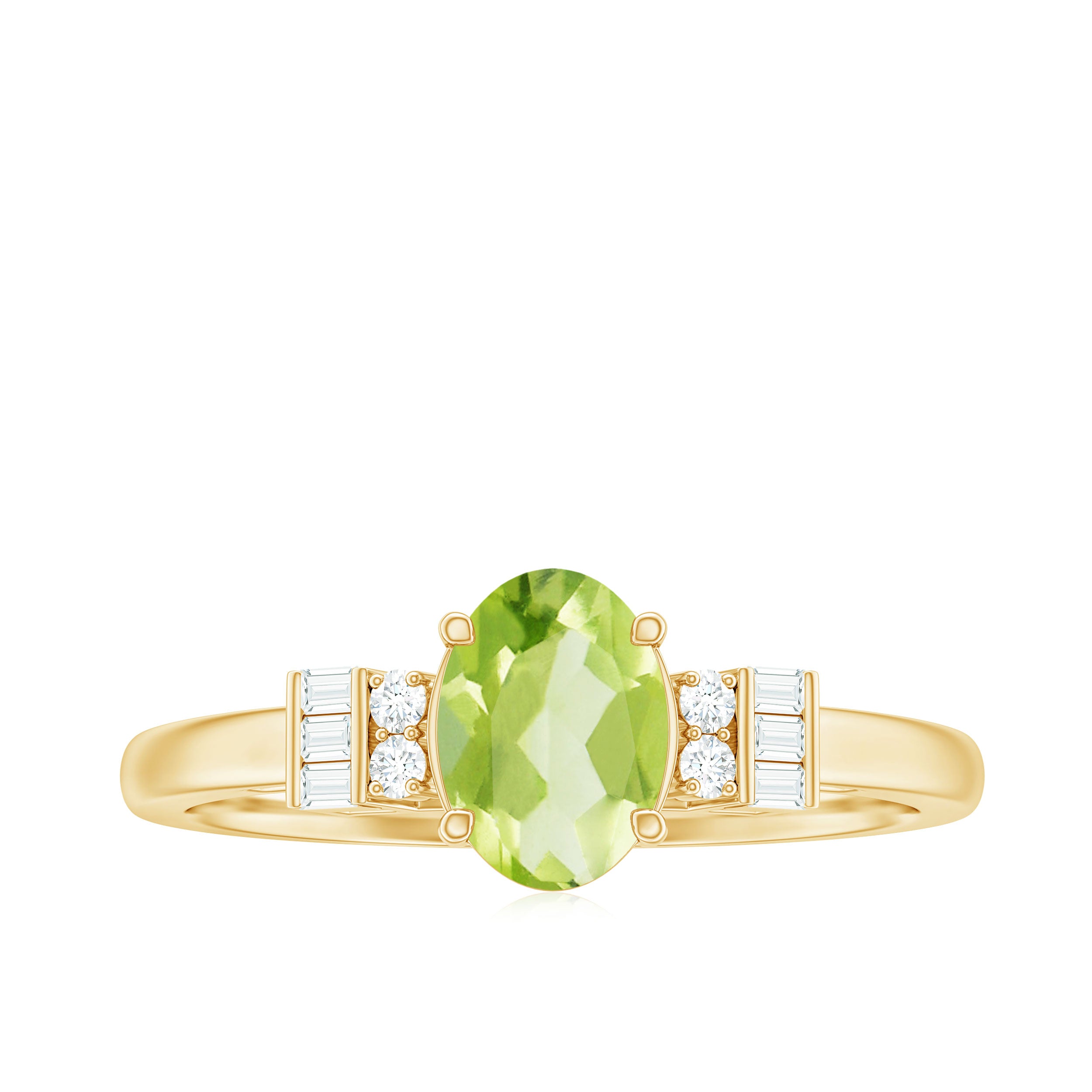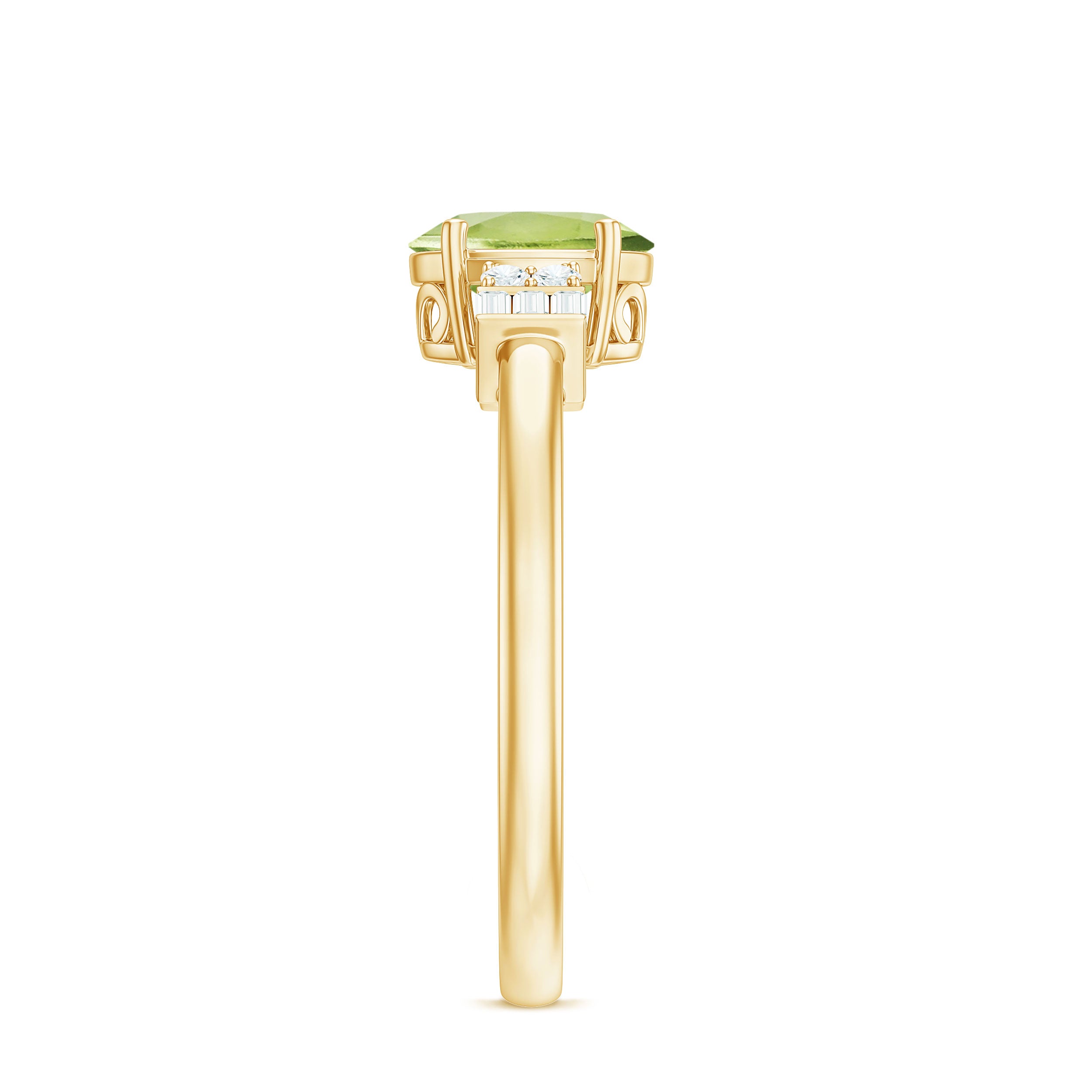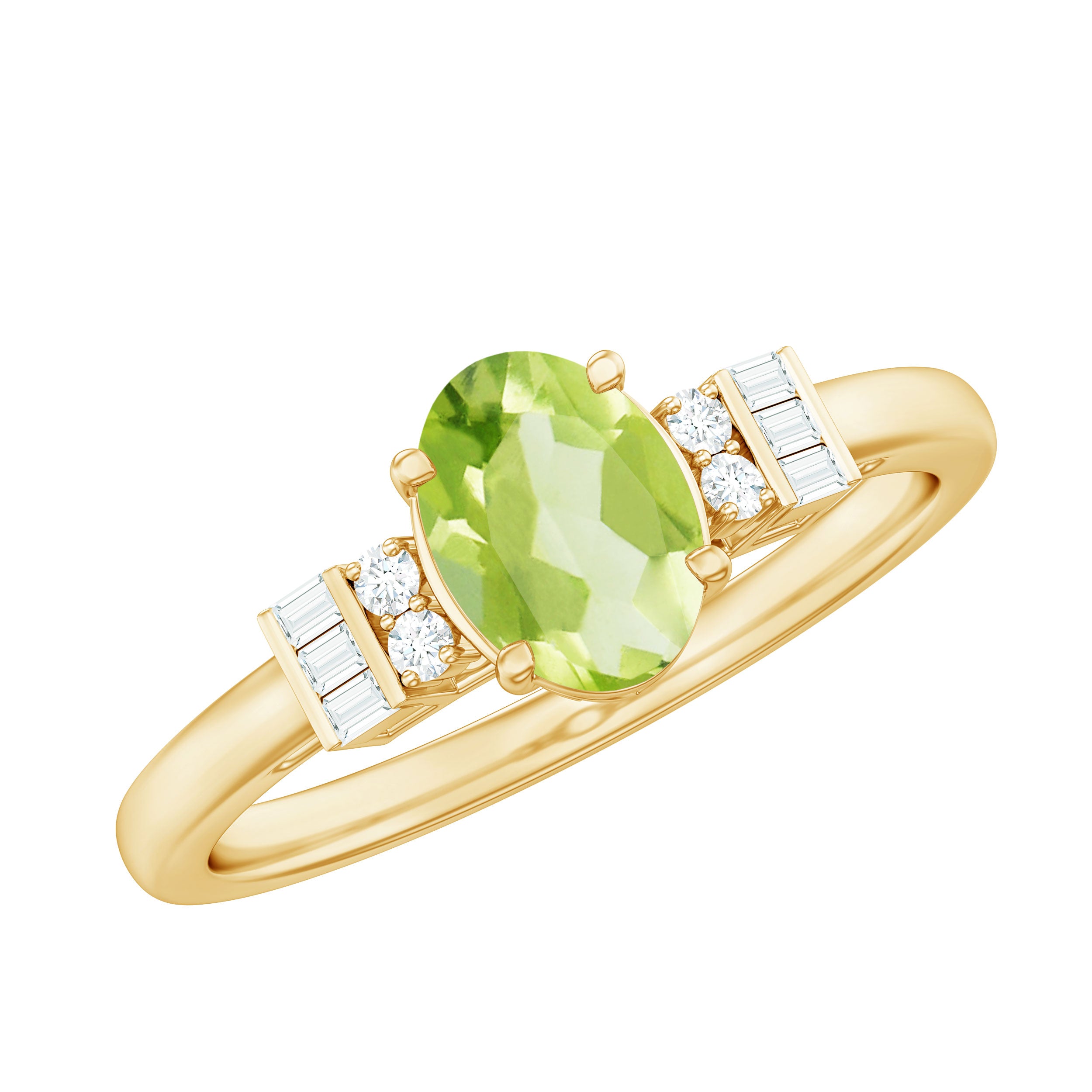 Graceful and divine, this Peridot Engagement Ring is a classic piece of fine jewelry, artistically crafted in Gold for a perfect and luxurious look. Oval Shape Peridot Ring has Baguette and Round Diamond embellishing the ring from sideways. Make your significant other extremely happy by presenting her with this Peridot Diamond Ring.