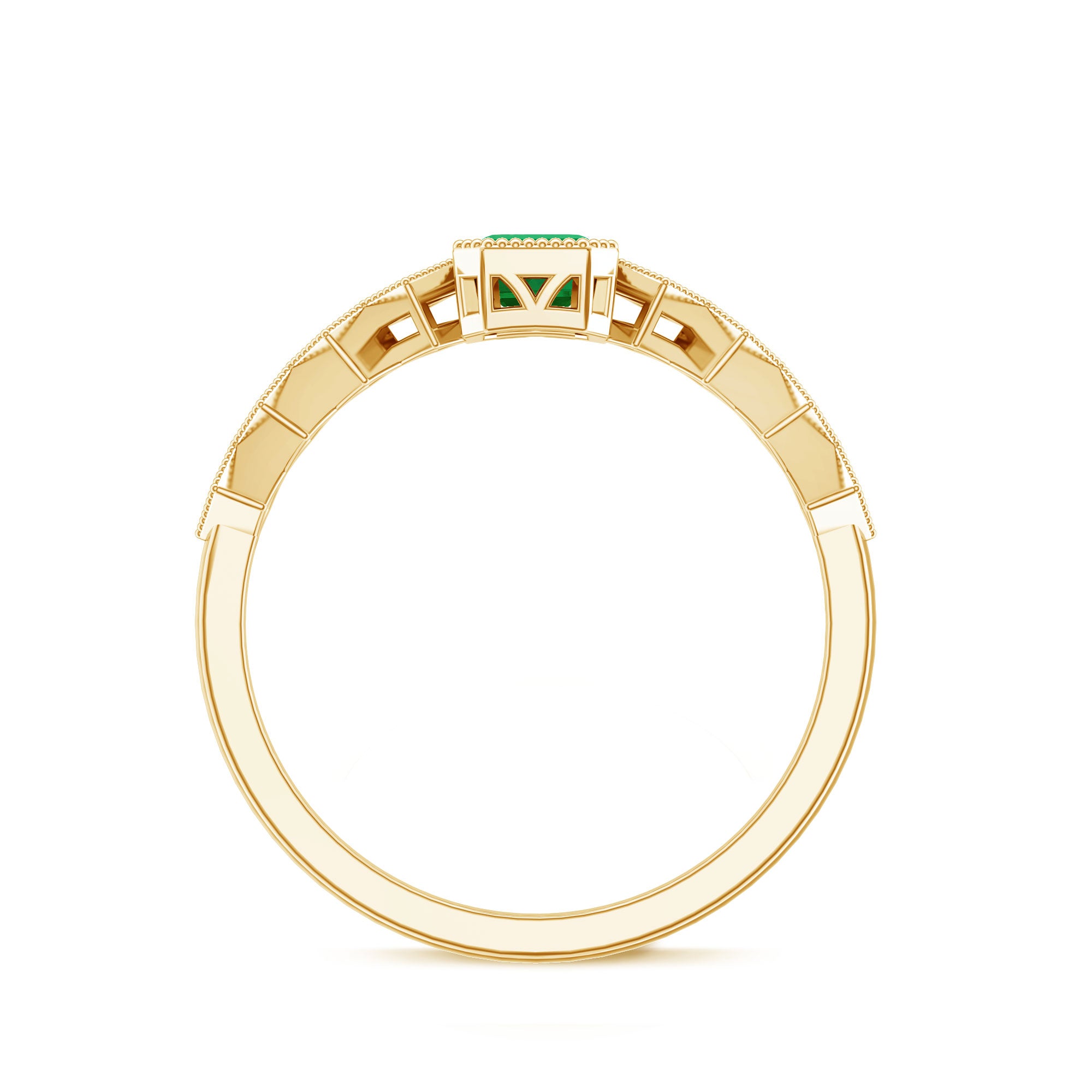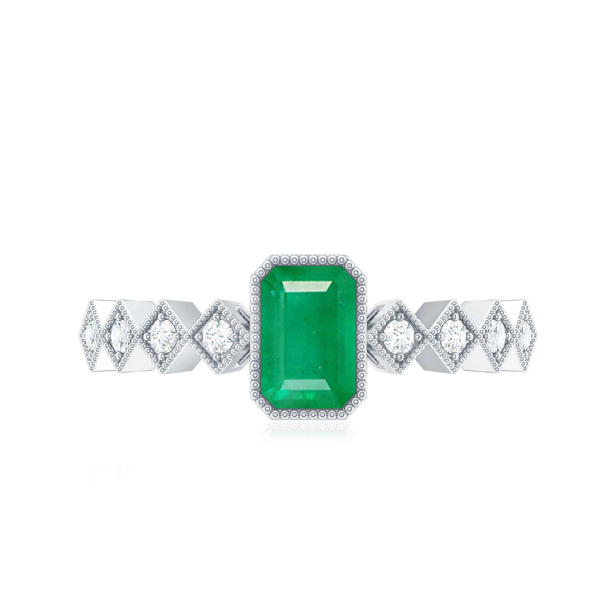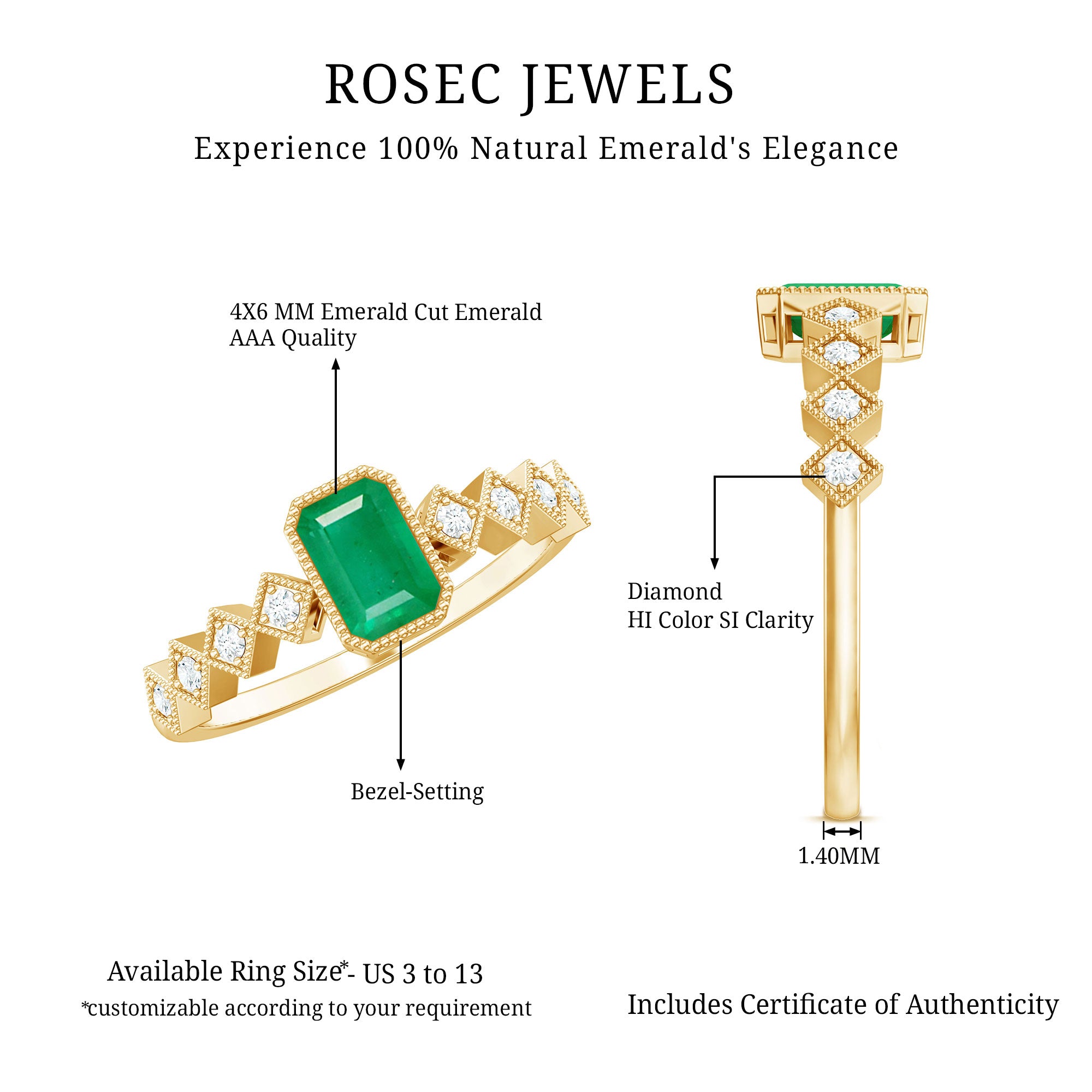 Discover the allure of timeless elegance with this Antique Looking Engagement Ring, where vintage sophistication meets modern romance. At its center, a captivating 4X6 mm Emerald Cut Emerald set in Bezel Setting draws every eye. Flanked by sparkling Diamond Side Stones, this Emerald Cut Engagement Ring shimmers with a refined brilliance, while intricate Beaded Detailing along the band and around the center stone adds an exquisite, handcrafted touch reminiscent of classic Art Deco design. Perfectly balancing bold geometry with delicate artistry, this ring embodies both strength and elegance, making this Emerald Cut Emerald Ring a meaningful symbol of devotion and everlasting love. Presented in a signature jewelry box and available in various ring sizes, this Bezel Set Engagement Ring is a keepsake of cherished moments, promises and shared dreams. Ideal for the bride who appreciates vintage-inspired sophistication with a contemporary flair, this Emerald Diamond Engagement Ring transforms every glance at your hand into a sparkling celebration of romance, commitment and beauty.