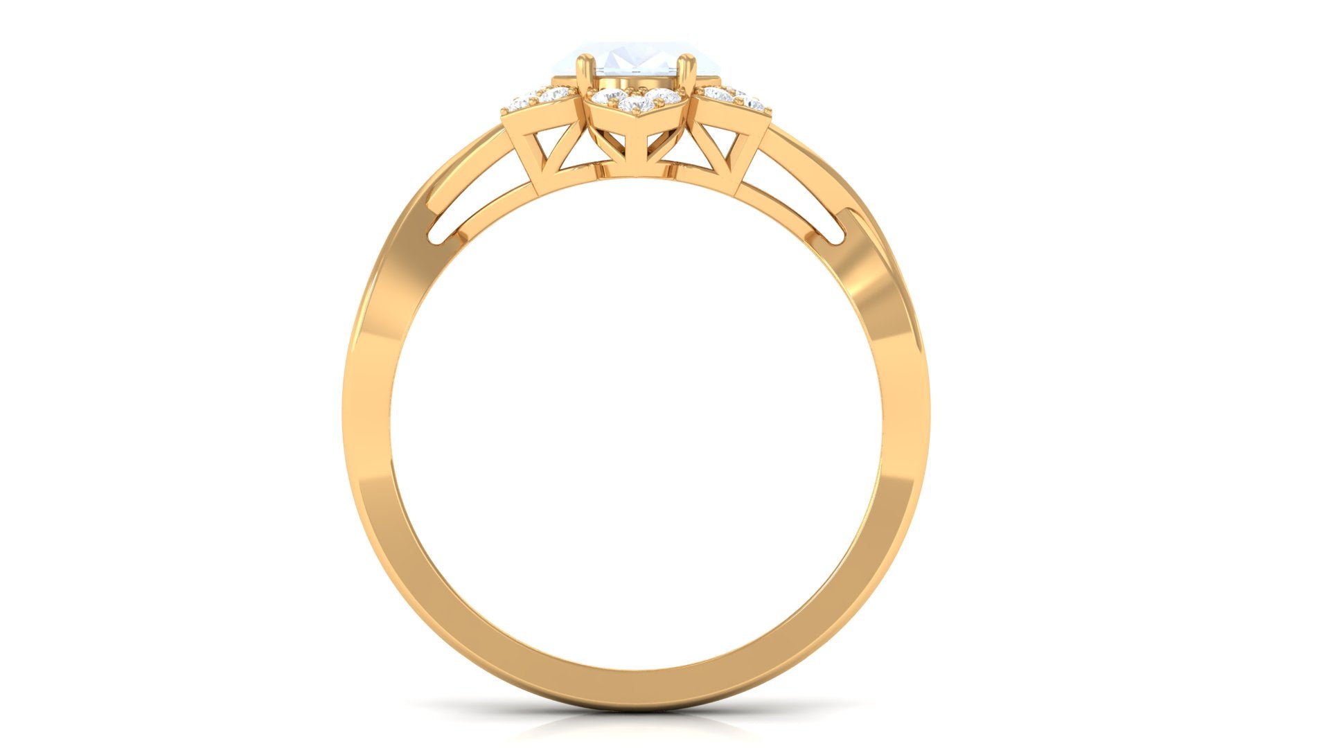 Make feel her special by giving her this Flower Halo Ring adorned with Oval Cut Moonstone as Solitaire set in Prong Setting with Diamond Accent and Crossover Shank, crafted in Gold Metal.