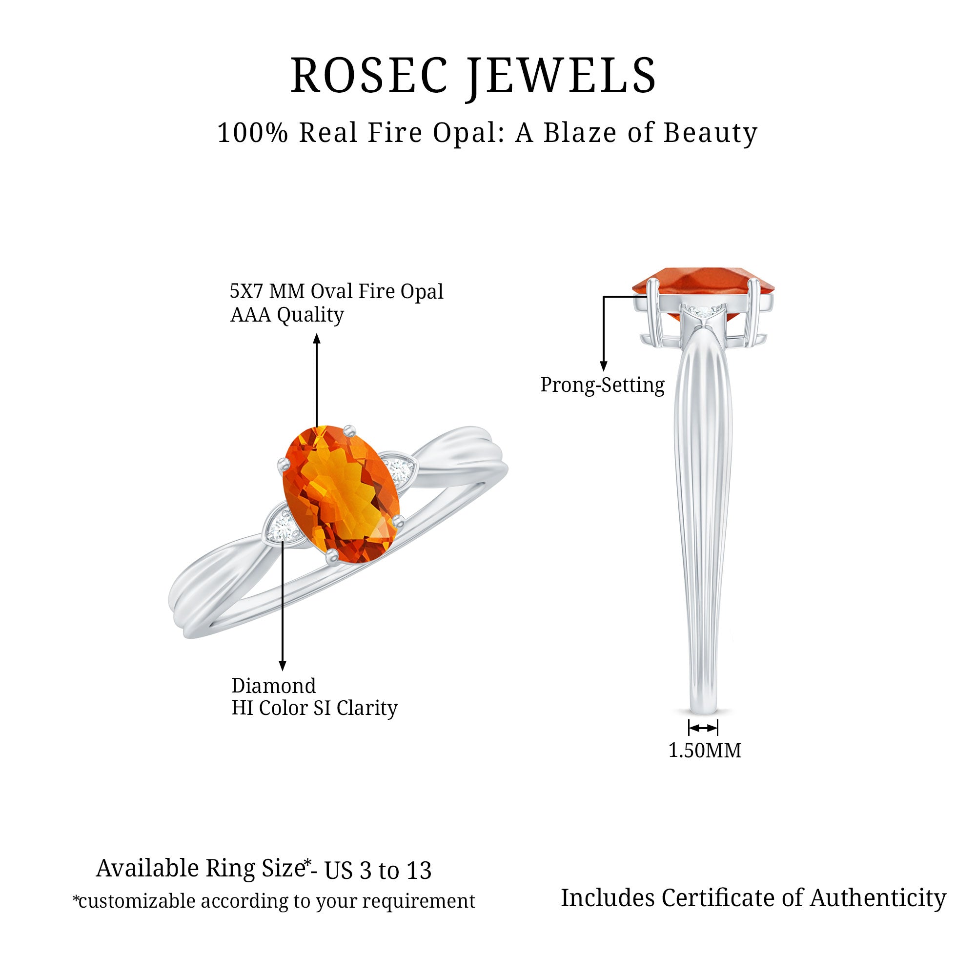 This Oval Fire Opal Solitaire is held in Prong Setting beautifully and Round Diamond are held in each side for captivating appeal. Simple Oval Engagement Ring is an alluring fine jewelry, your lovely lady will love this Solitaire Ring for sure.