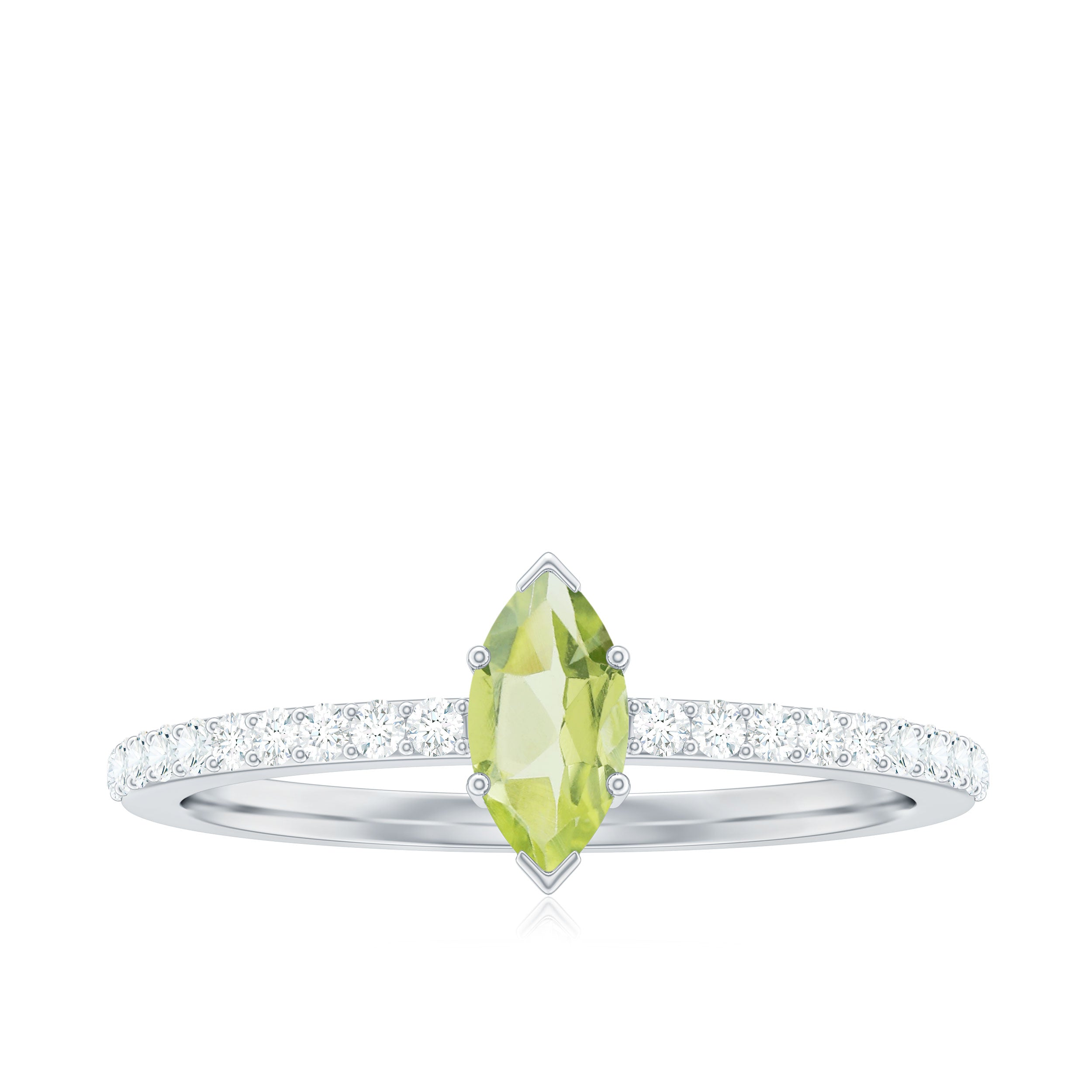 Propose to her with this alluring Promise Ring and make her fall in love with you. This Solitaire Ring is decorated with Marquise Cut Peridot in V Prong Setting with Diamond Stones studded over the intriguing shank. This Peridot and Diamond Ring will surely be the right choice for your lady love.
