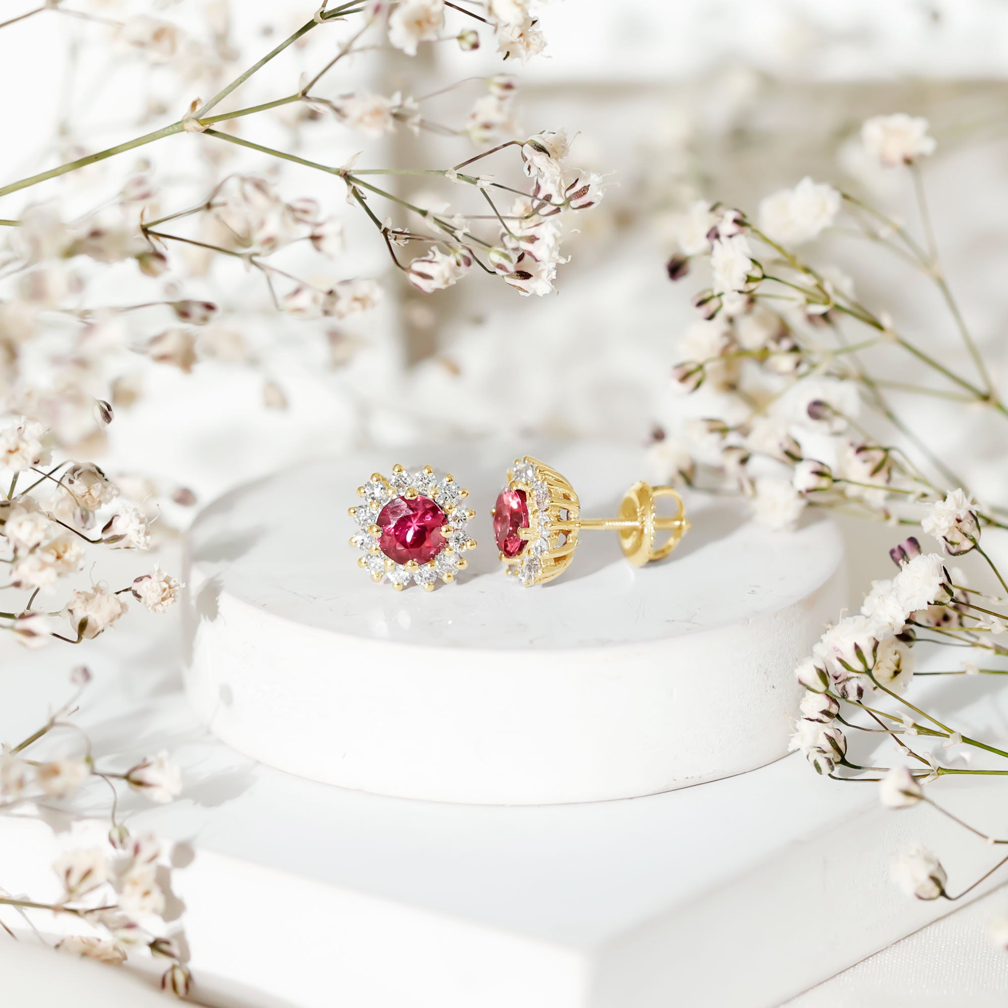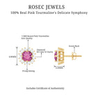 A Celebration without Gift is Incomplete, a Gift of Jewelry will bring smiles of delight on Mothers Day. Explore these Stud Earrings adorned with Round Shape Pink Tourmaline in Prong Setting with Halo Diamond, crafted in Solid Gold Metal.