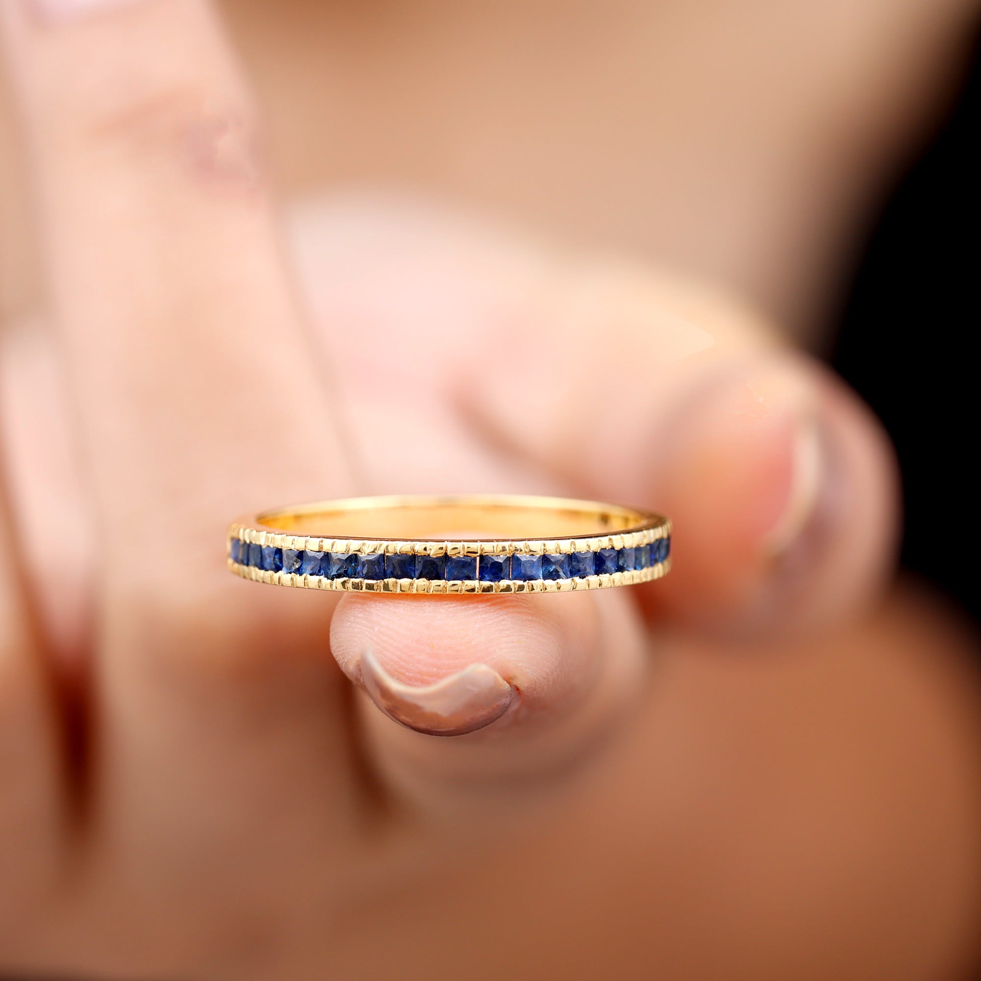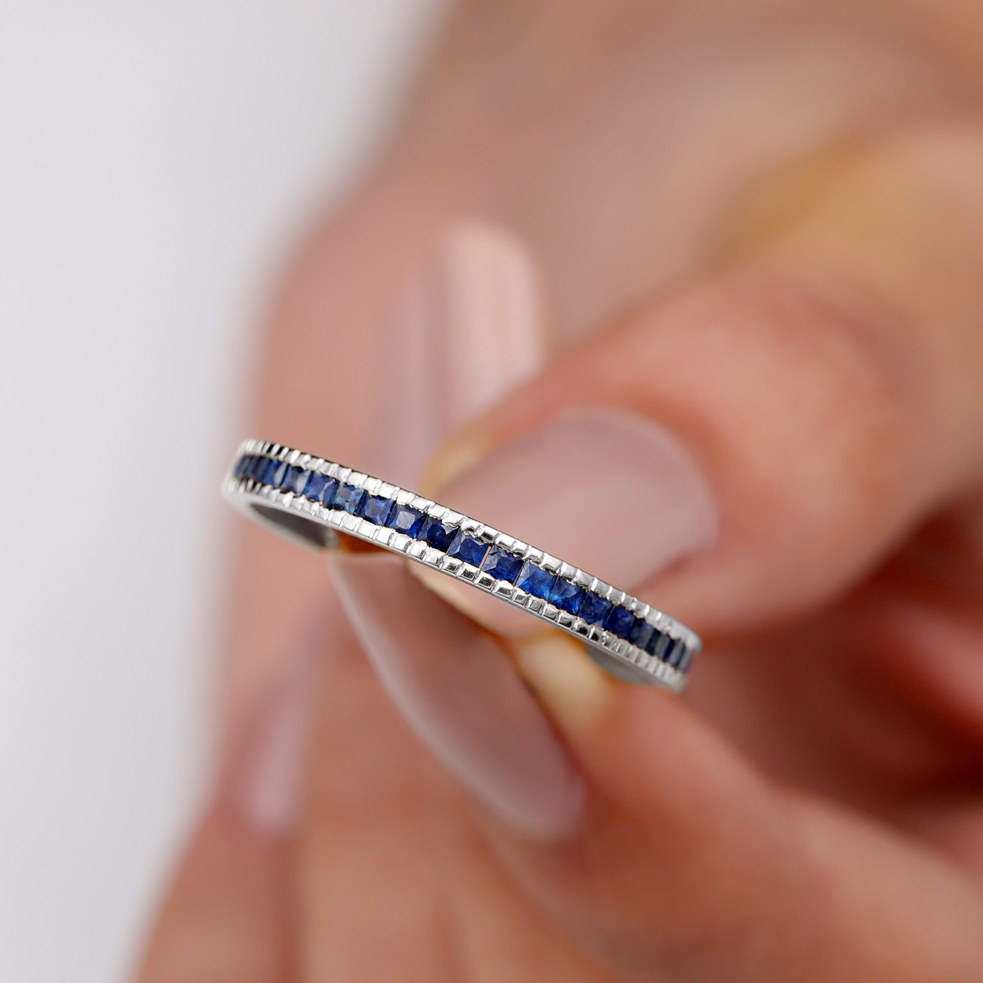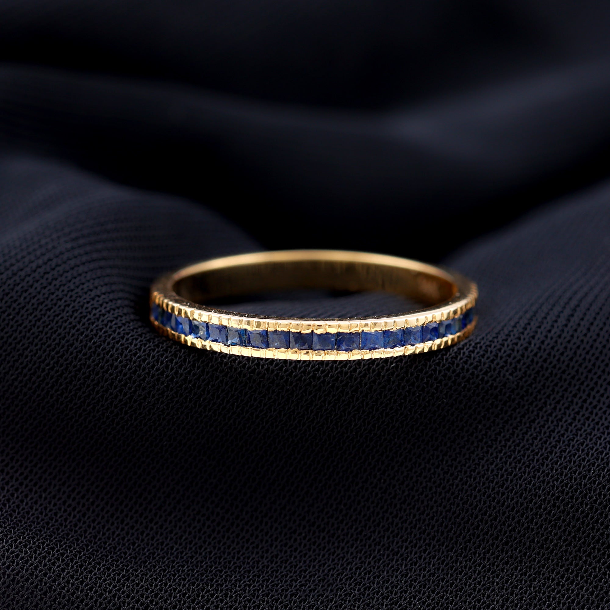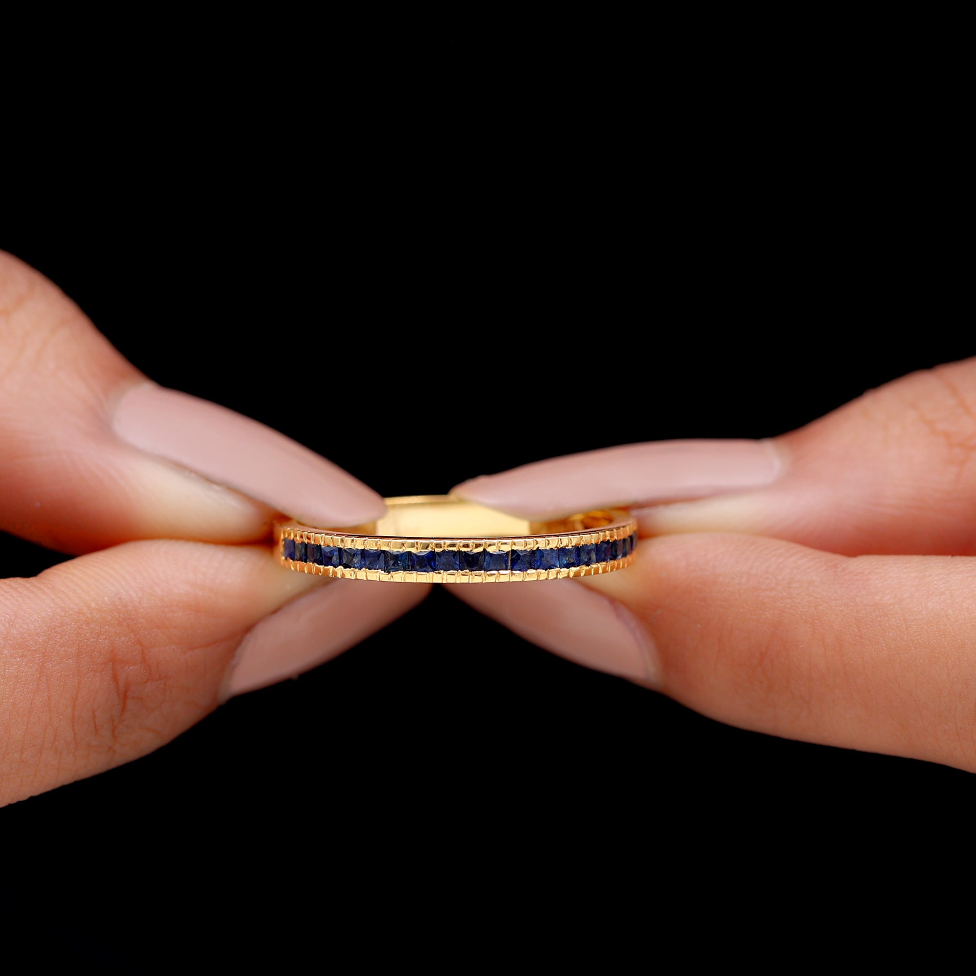 This Half Eternity Ring is a glamorous piece embellished with precious Princess Cut Blue Sapphire Gemstones in Milgrain Channel Setting, Crafted in gold for an opulent appeal.