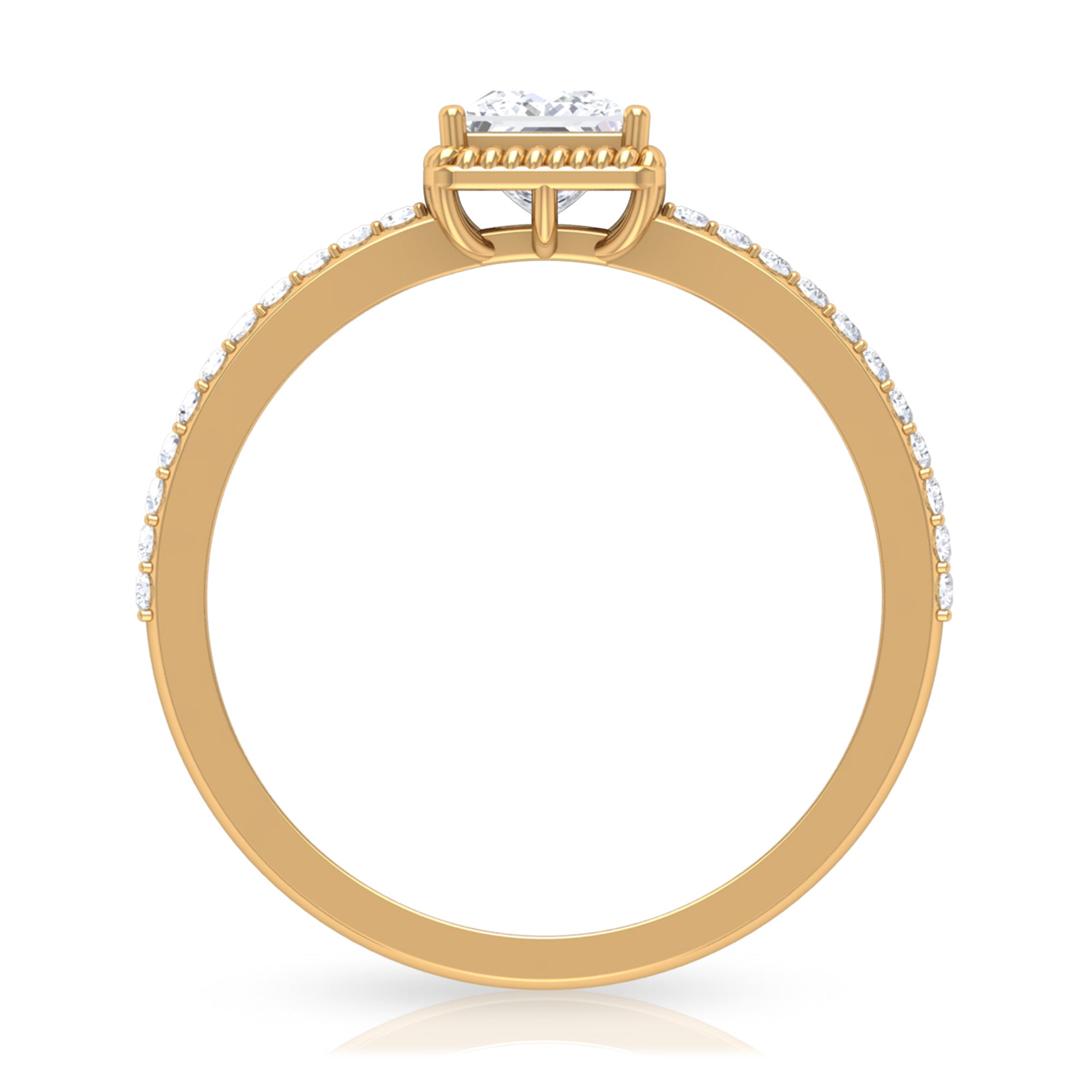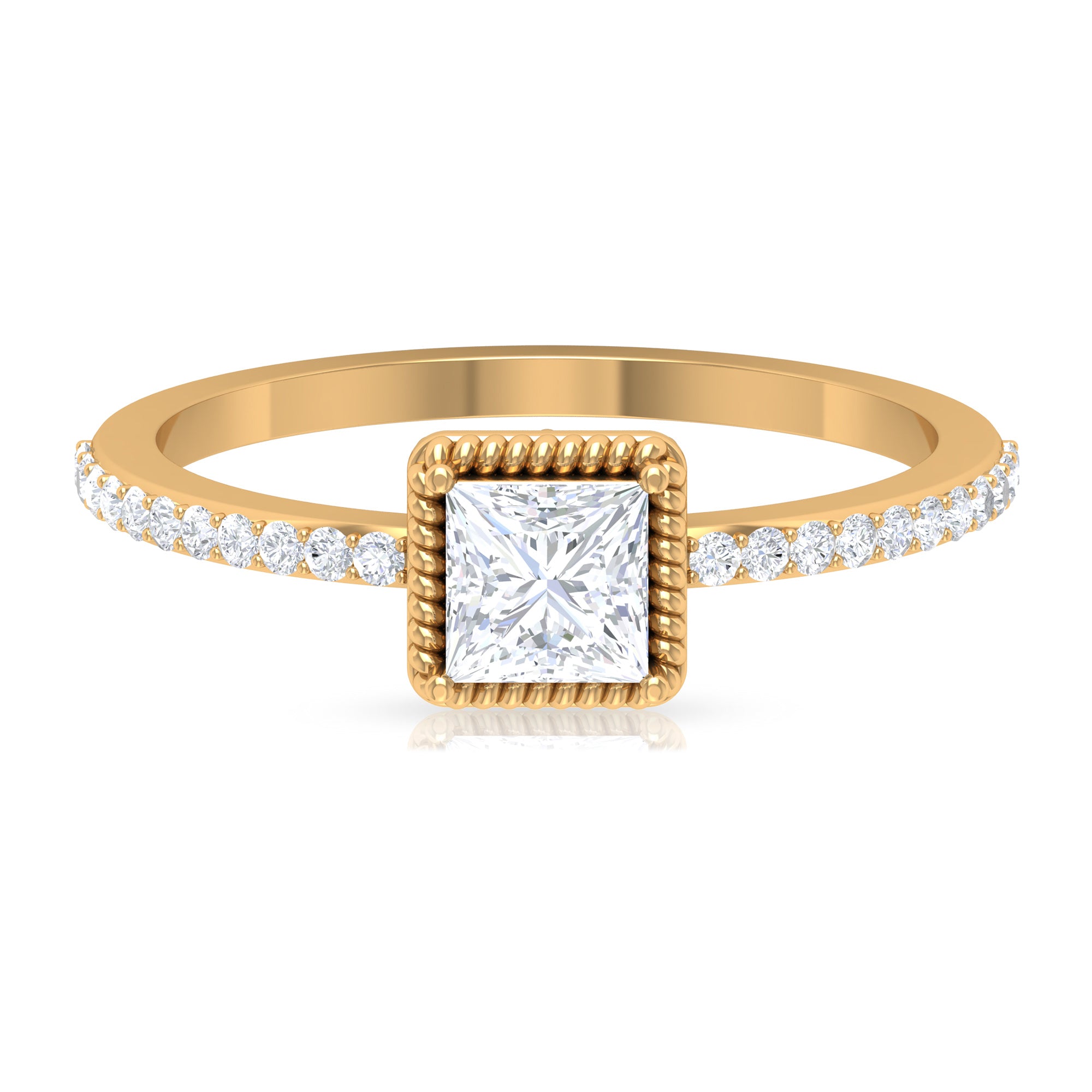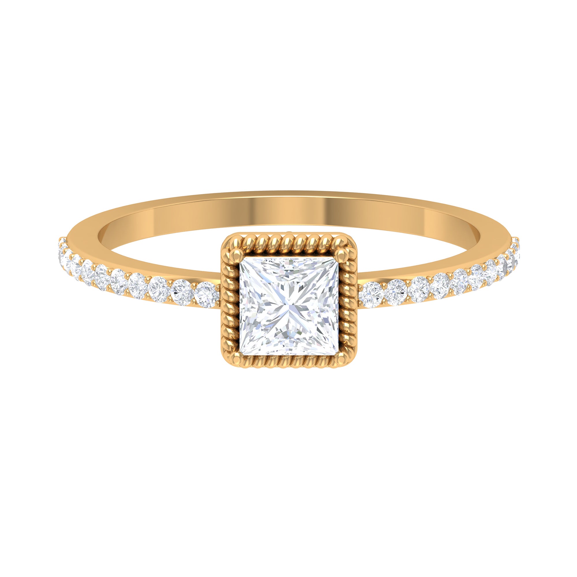 Flaunt in the parties with this Solitaire Ring. This Solitaire Ring is embellished with Princess Cut Zircon set in Peg Head Setting with Rope Frame and Zircon Side Stones, crafted in Gold Metal.