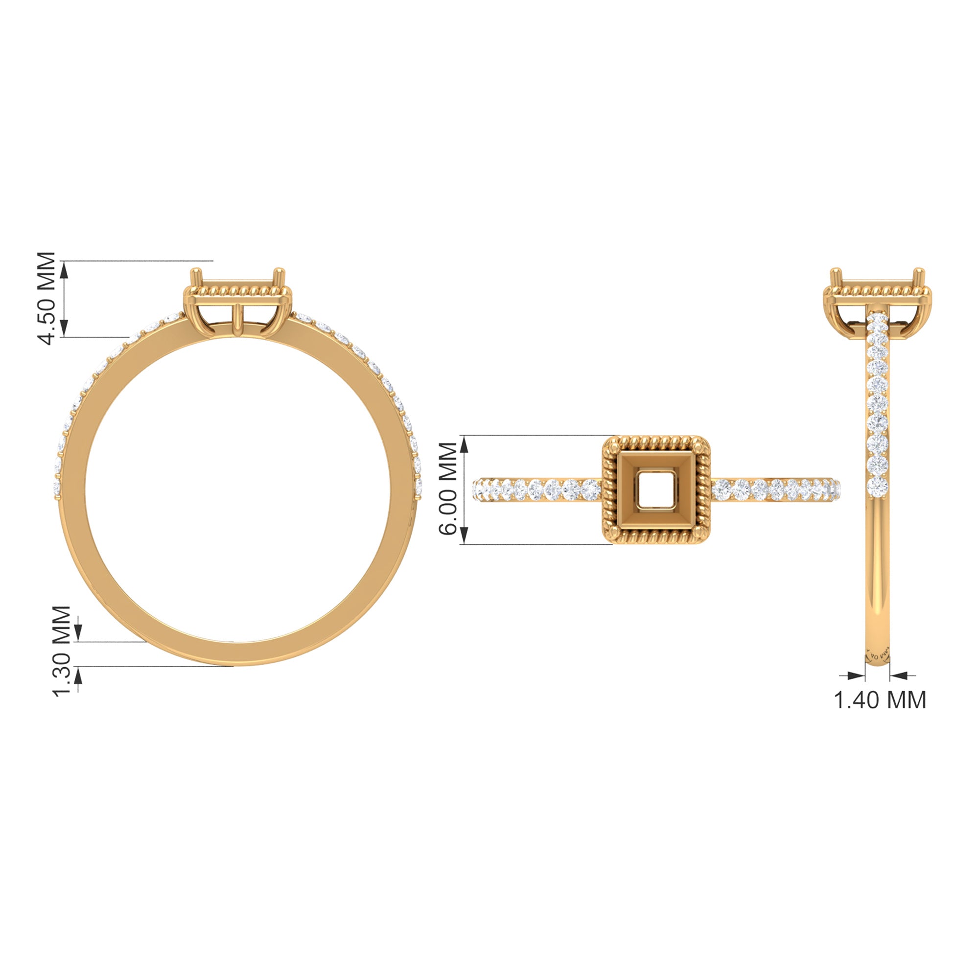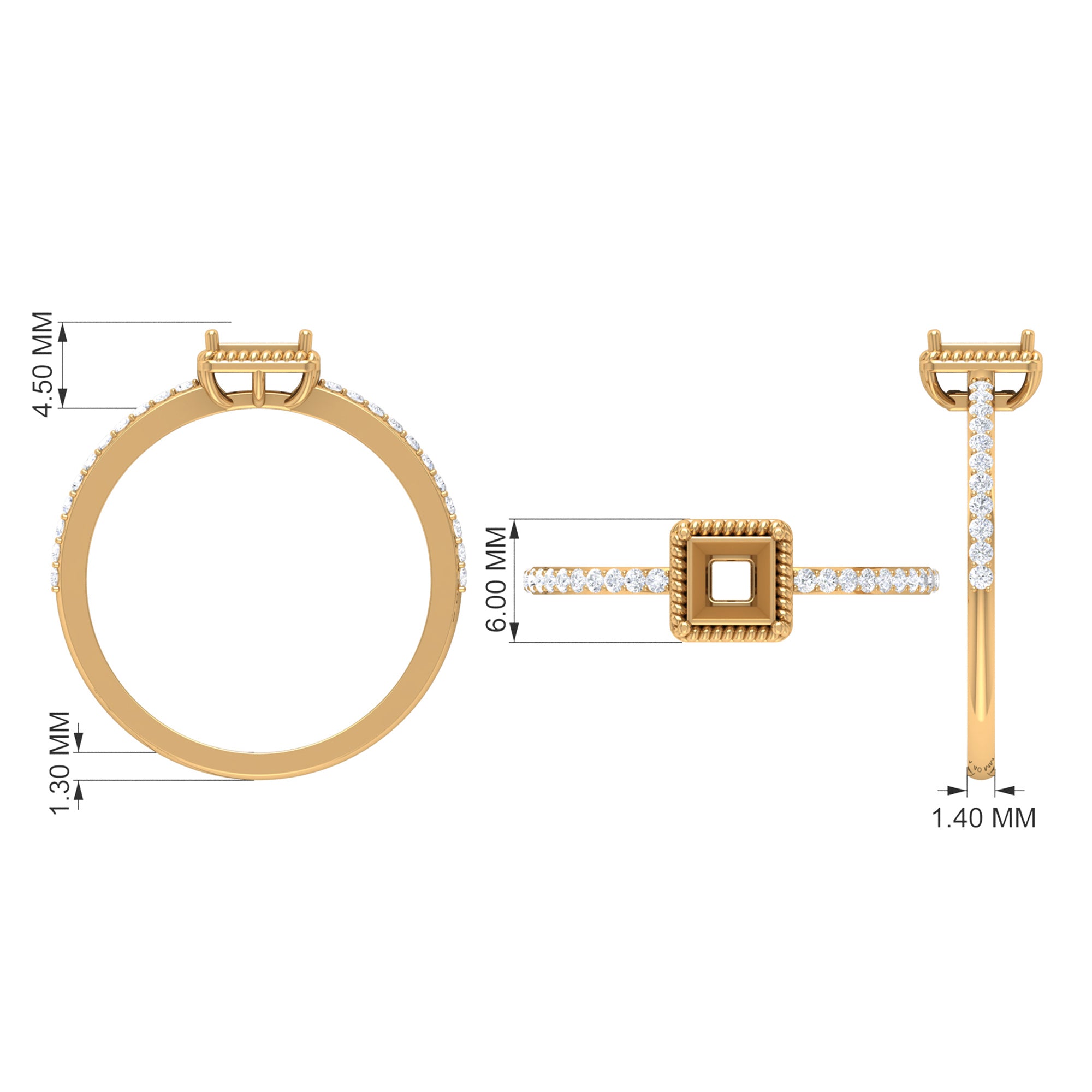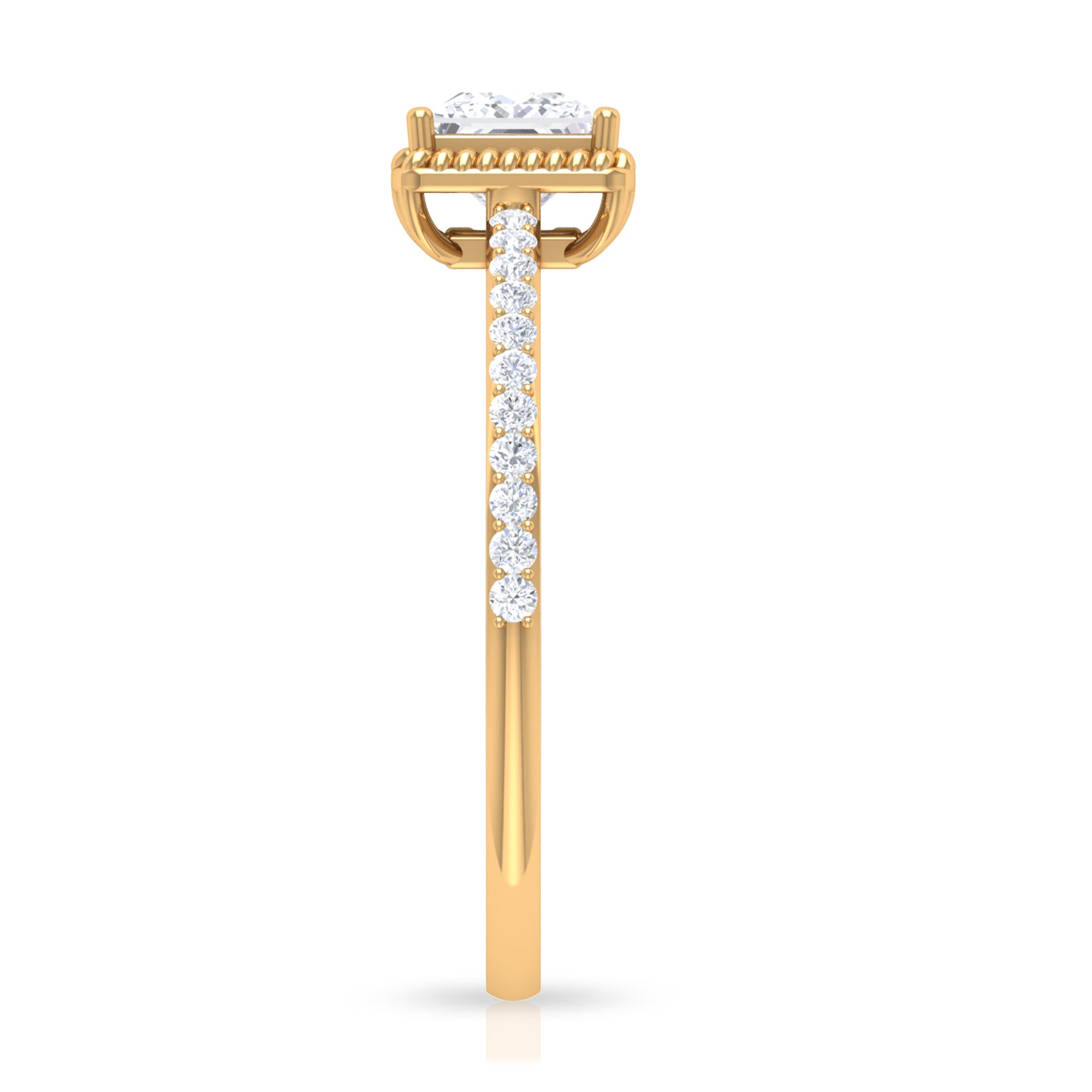 Flaunt in the parties with this Solitaire Ring. This Solitaire Ring is embellished with Princess Cut Zircon set in Peg Head Setting with Rope Frame and Zircon Side Stones, crafted in Gold Metal.