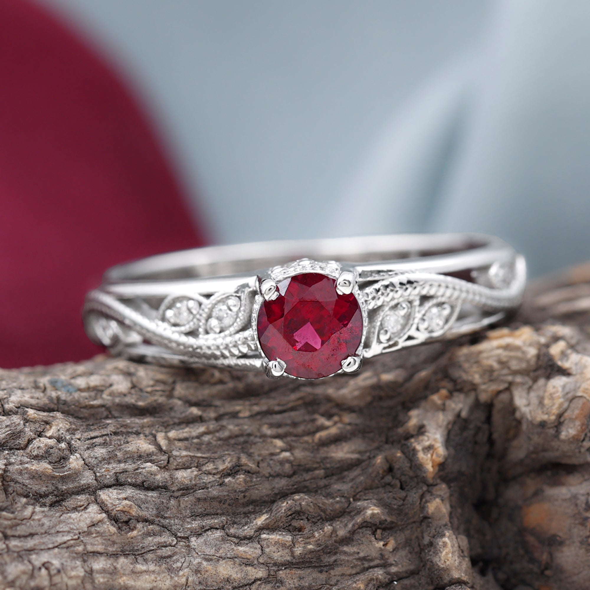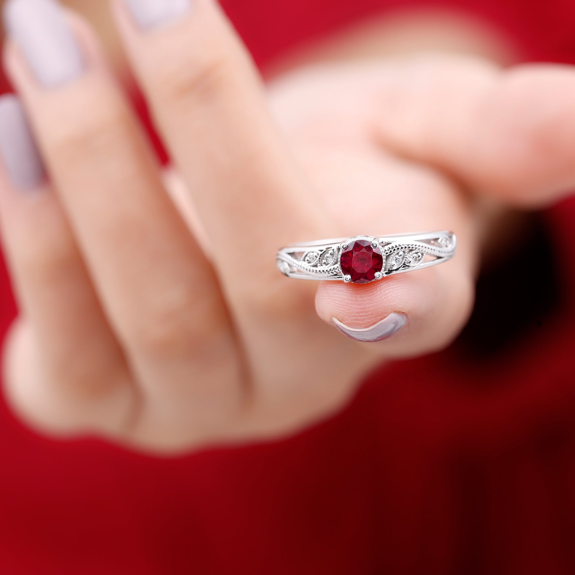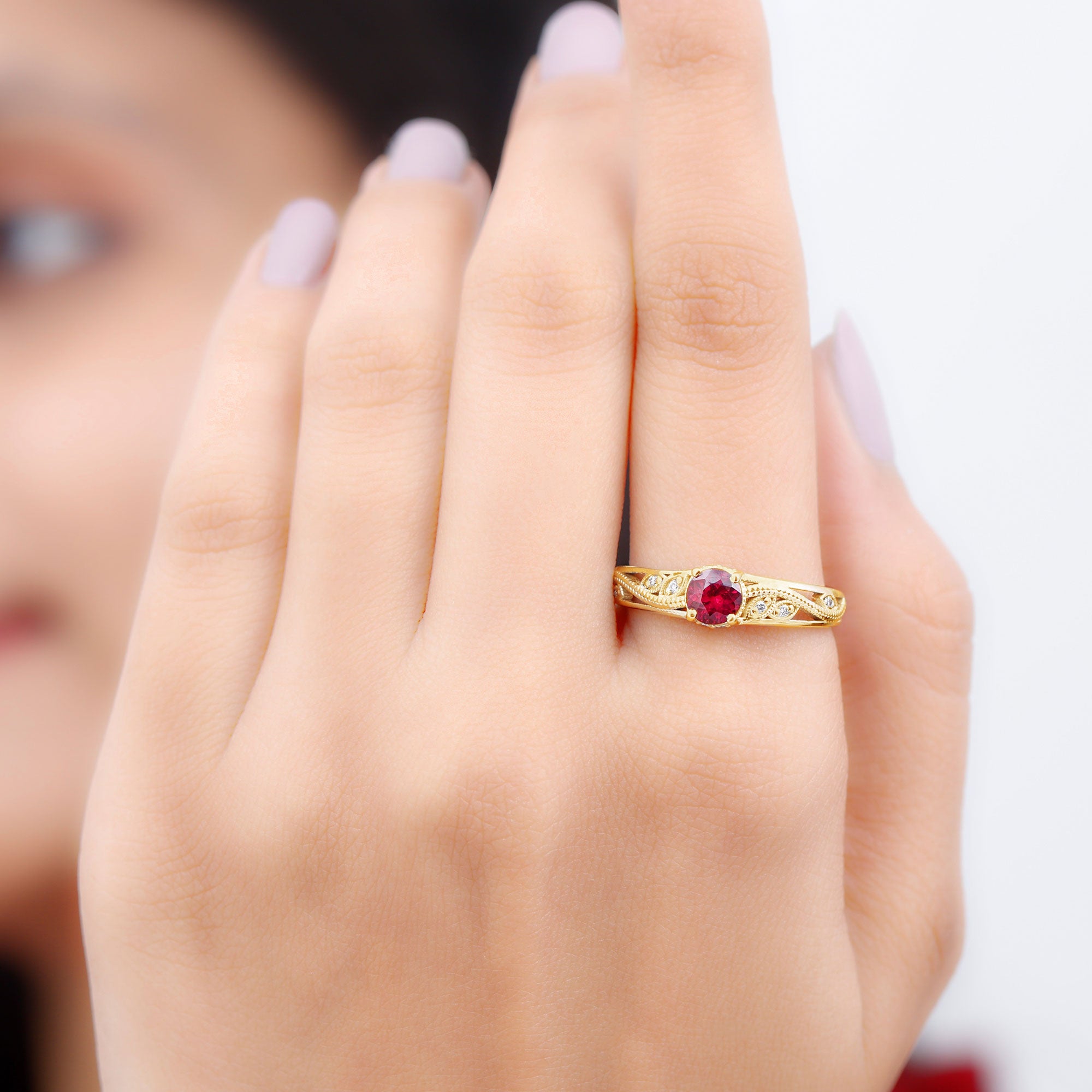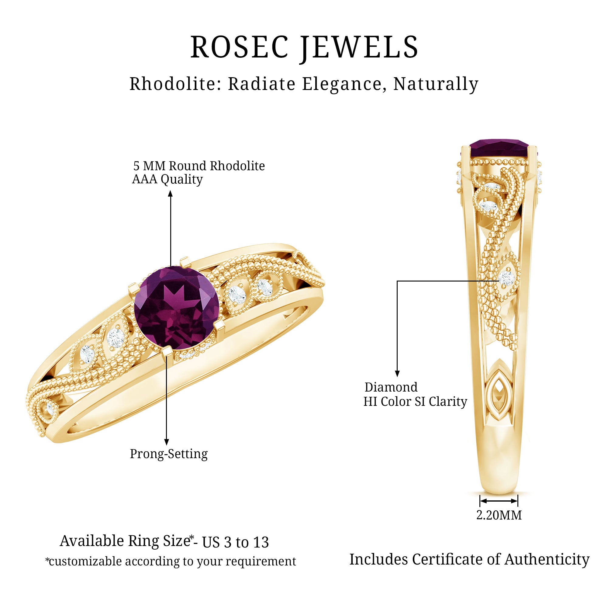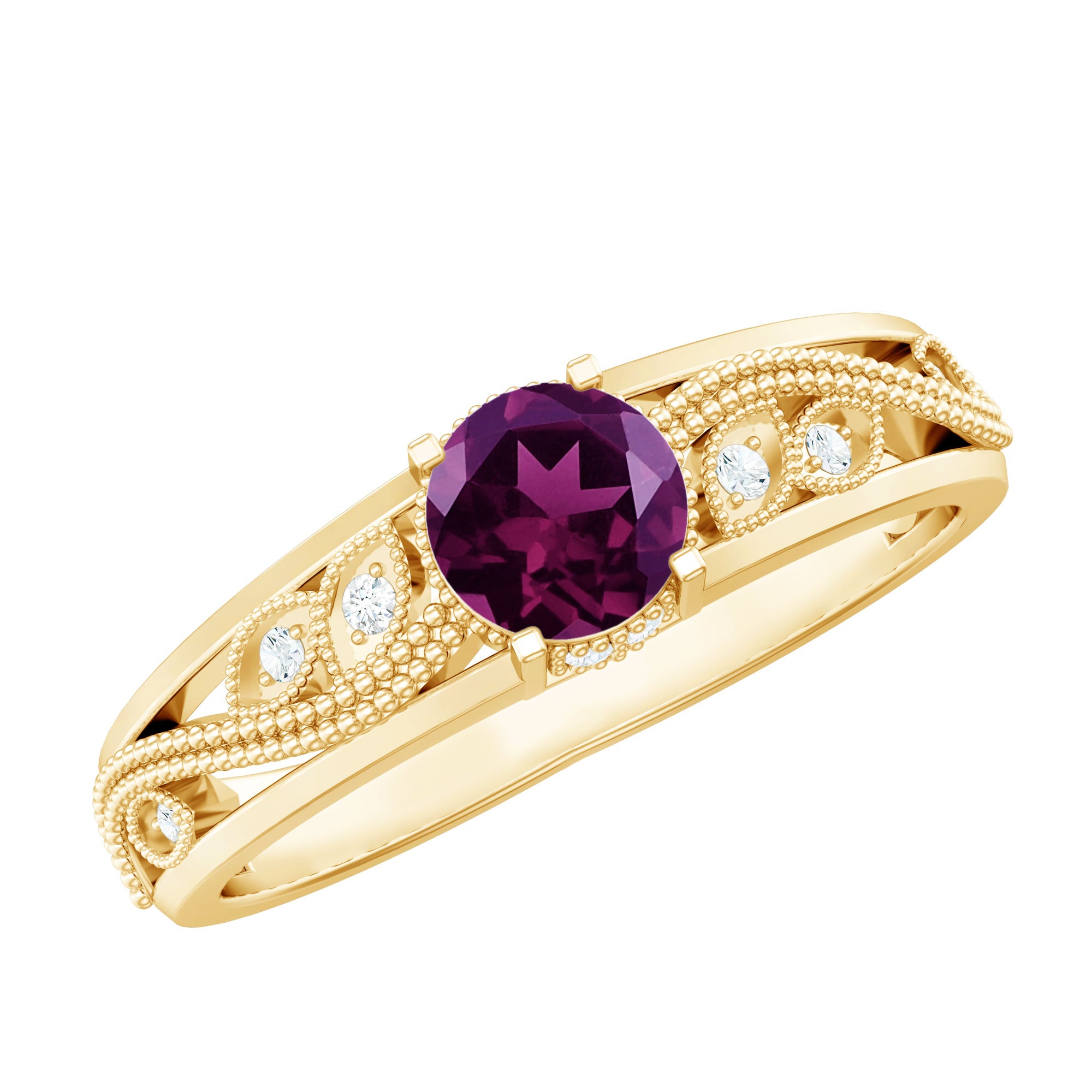 A Phenomenal and Classic Wedding Gold Ring is adorned with 5 MM Round Shaped Rhodolite is set in the center and small Round Shape Diamond enhance the beauty of shank. Solitaire Engagement Ring is composed of Gold. Minimalist Beaded Engraved design ring is a perfect anniversary gift for your partner.