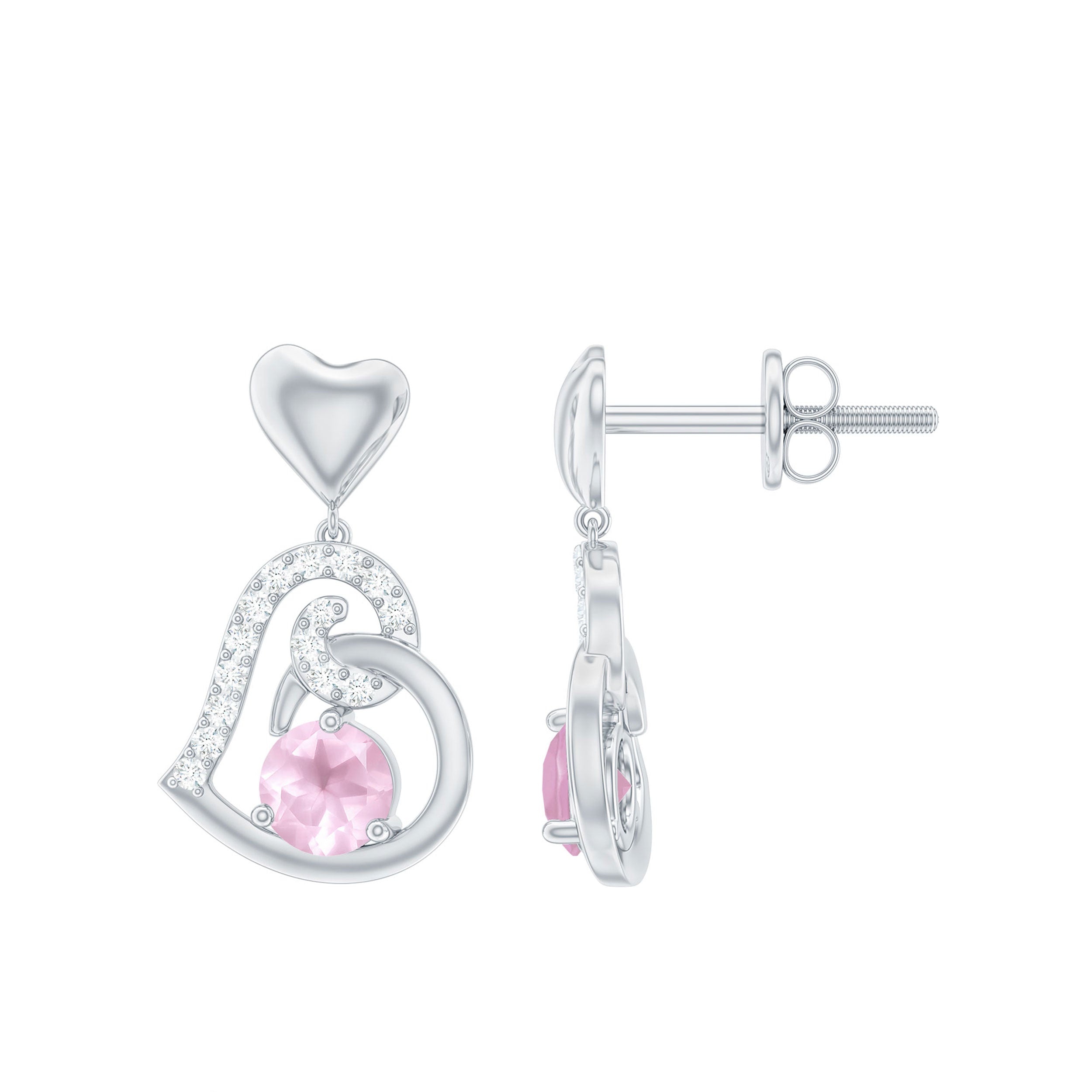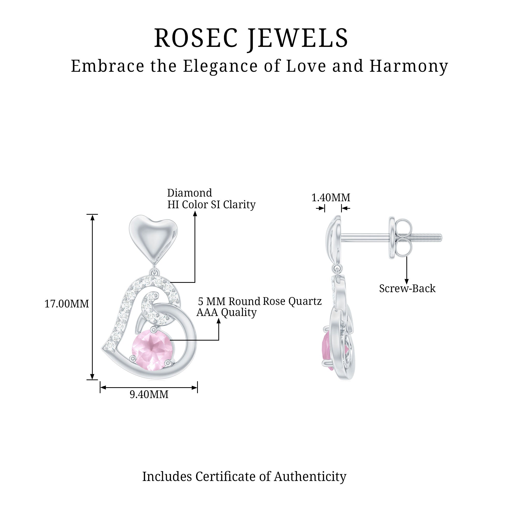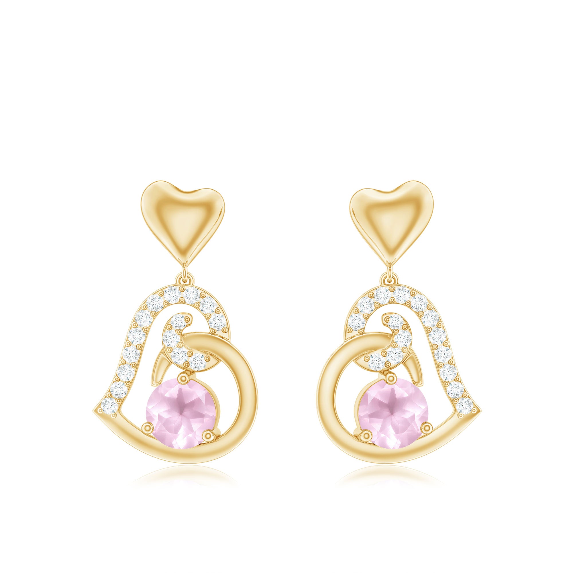 Add a touch of enchantment to your look with these stunning Heart Drop Earrings, crafted in Solid Gold and adorned with a Round Shape Rose Quartz in a 3 Prong Setting, and a Round Shape Diamond in a Surface Prong Setting. Let the brilliance of these precious gemstones light up your world and make you shine.