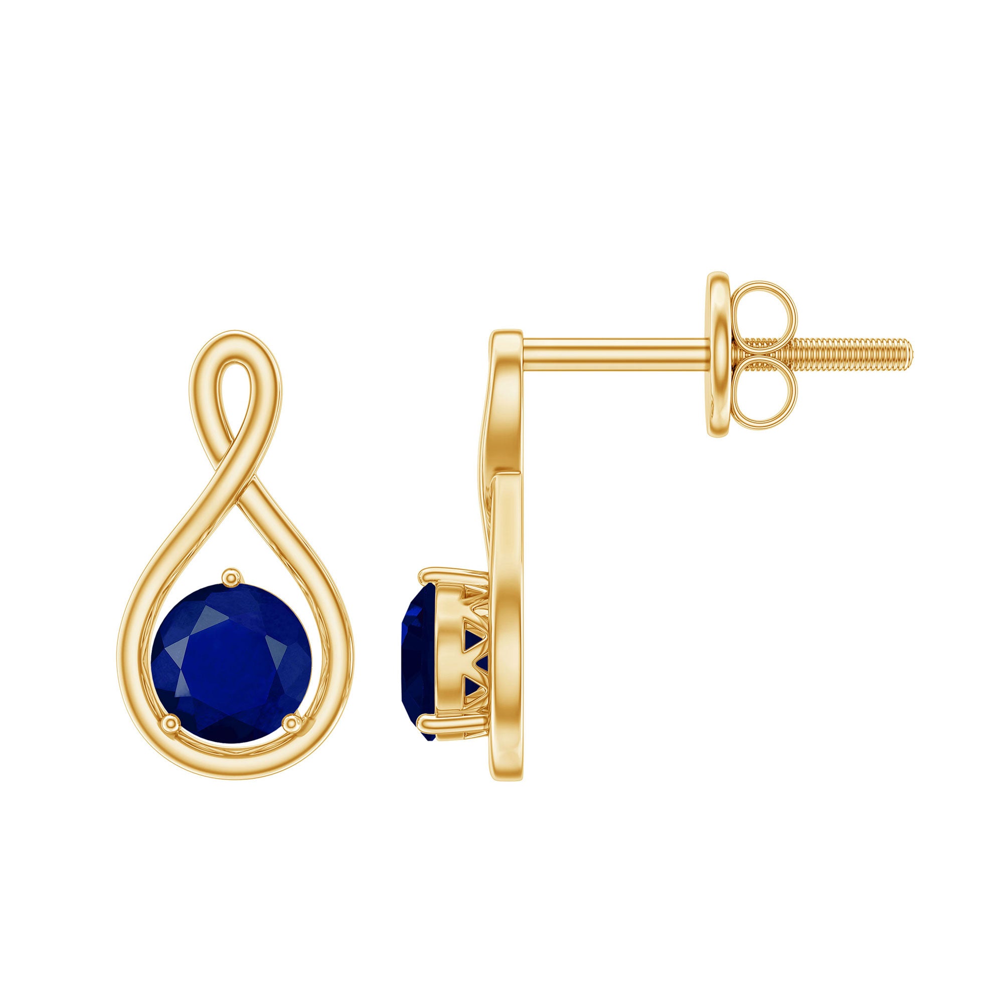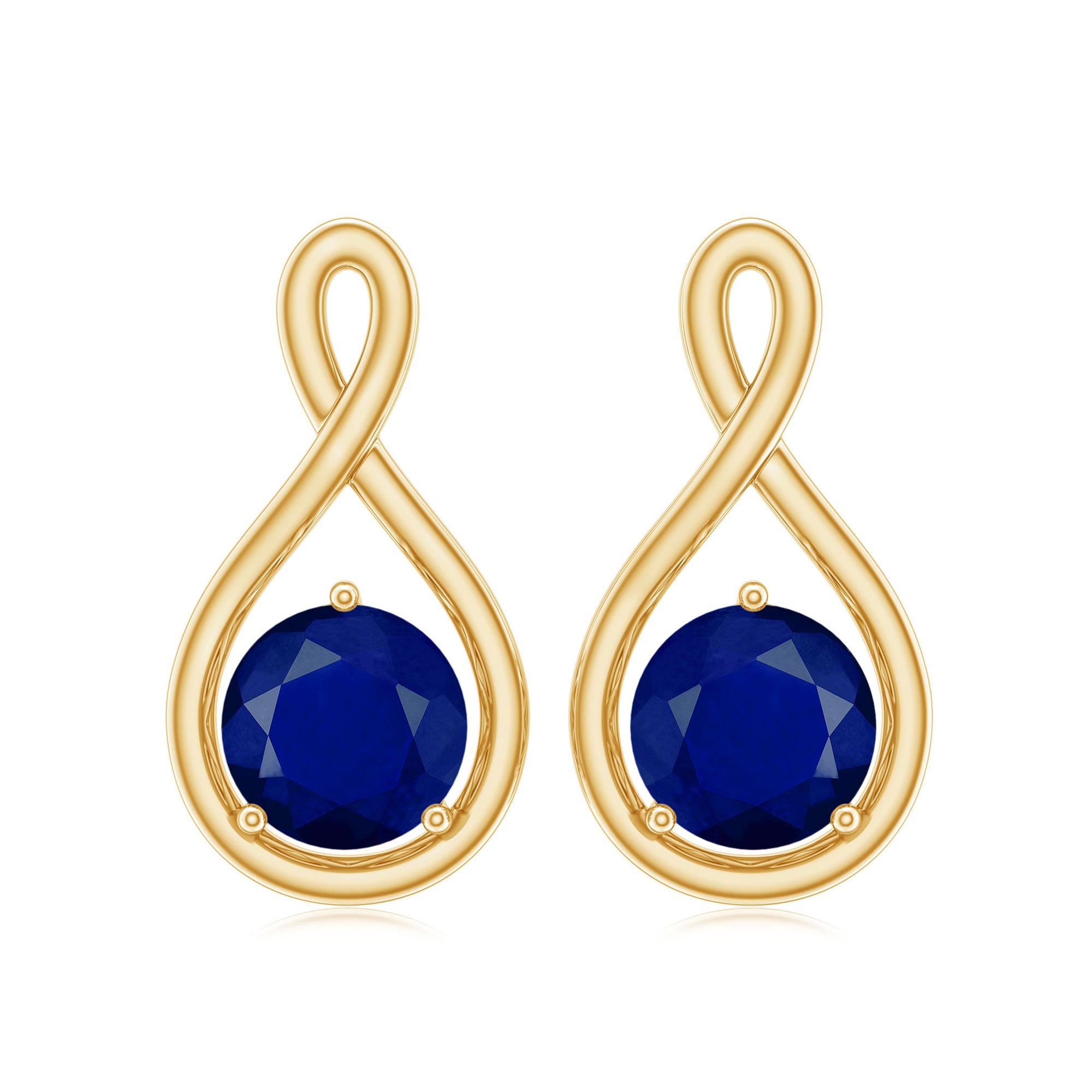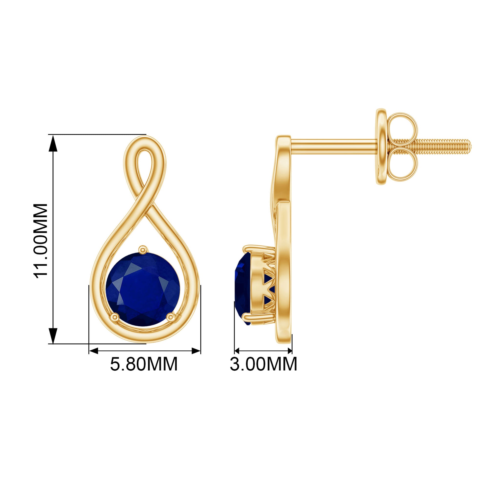 Adorn these beautiful pair of Infinity Earrings, an elegant symbol of endless love and infinite possibilities. These Infinity Stud Earrings are adorned with a stunning Round Cut Blue Sapphire Solitaire, set in the center of the infinity symbol and delicately placed on a gold flower in a secure Prong Setting. Add a touch of sophistication and elegance to any outfit with these exquisite earrings.