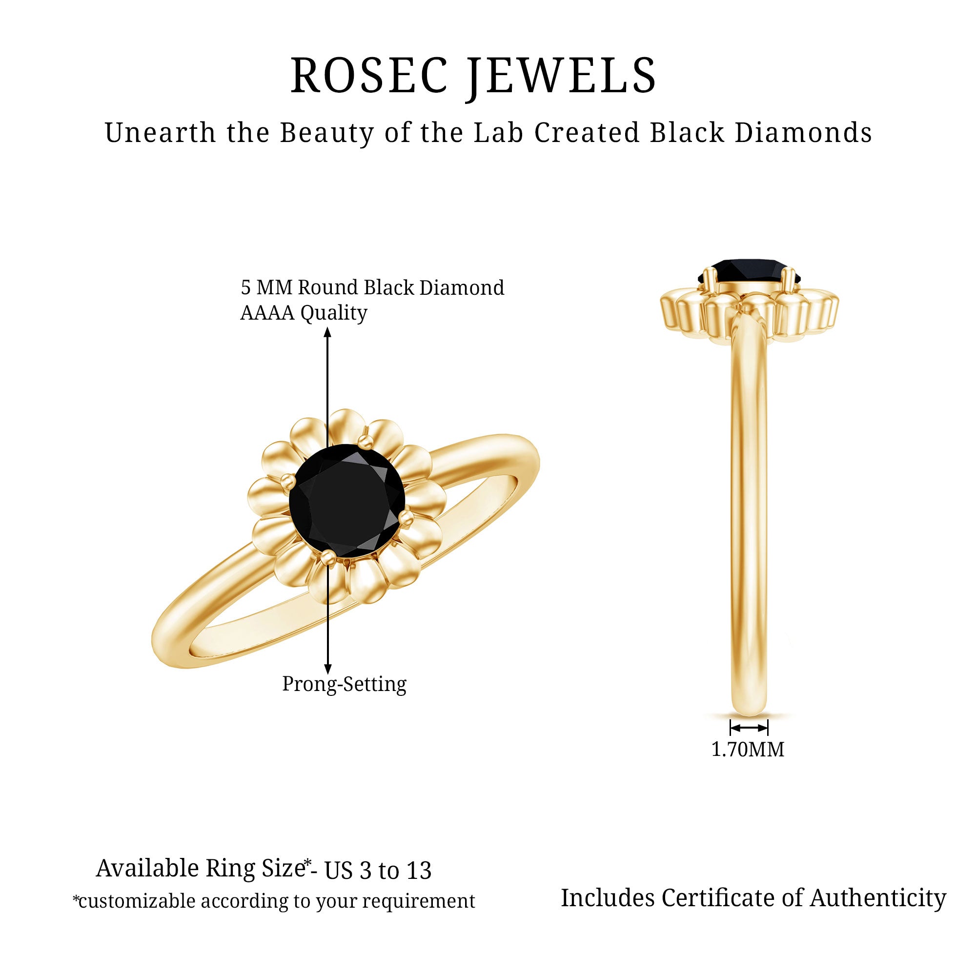 A stunning Solitaire ring featuring a dazzling round cut created black diamond in a golden flower design. The created black diamond is set in a classic prong setting and is surrounded by delicate petals, creating a unique and beautiful piece of jewelry. Perfect for a special occasion, this ring is sure to become a cherished treasure.