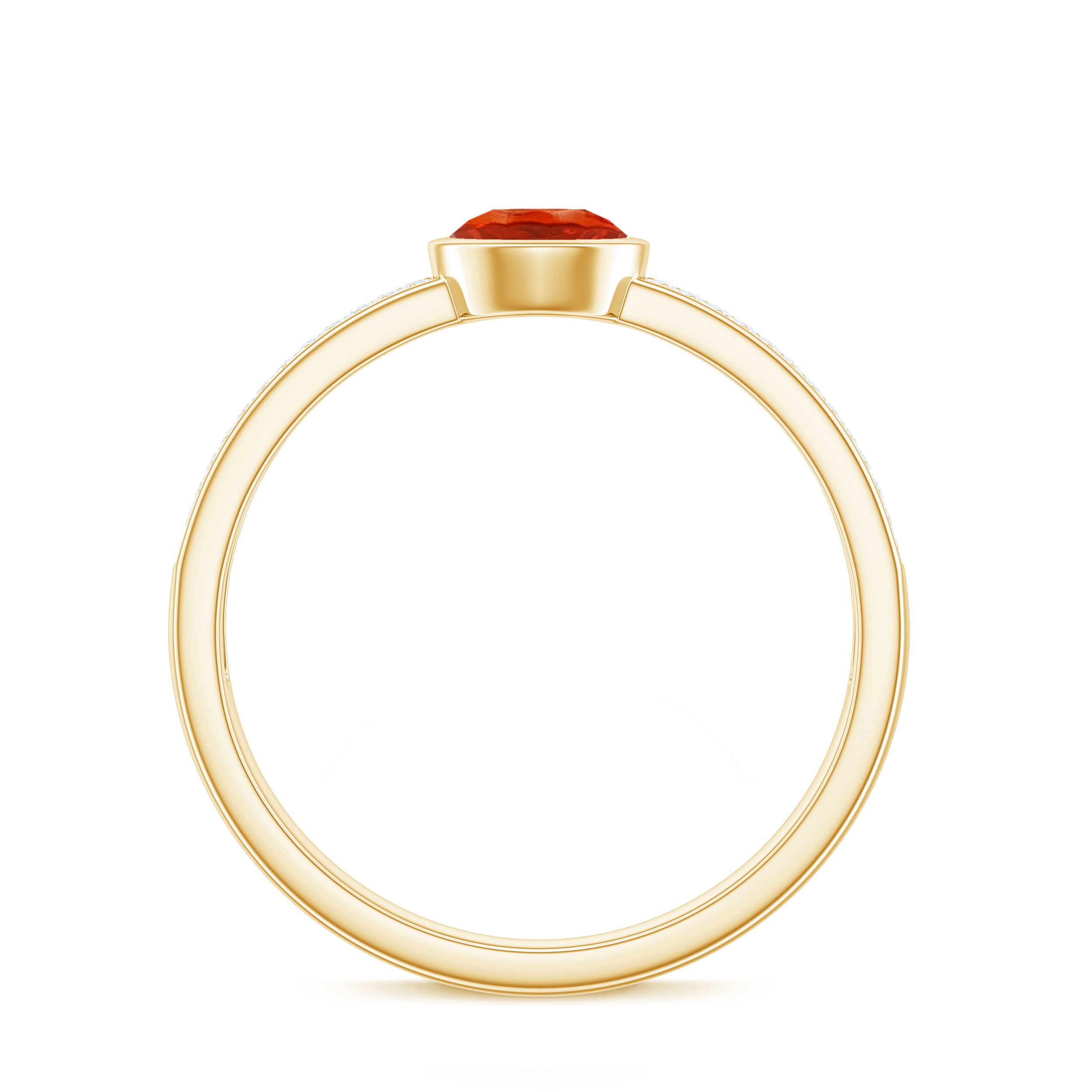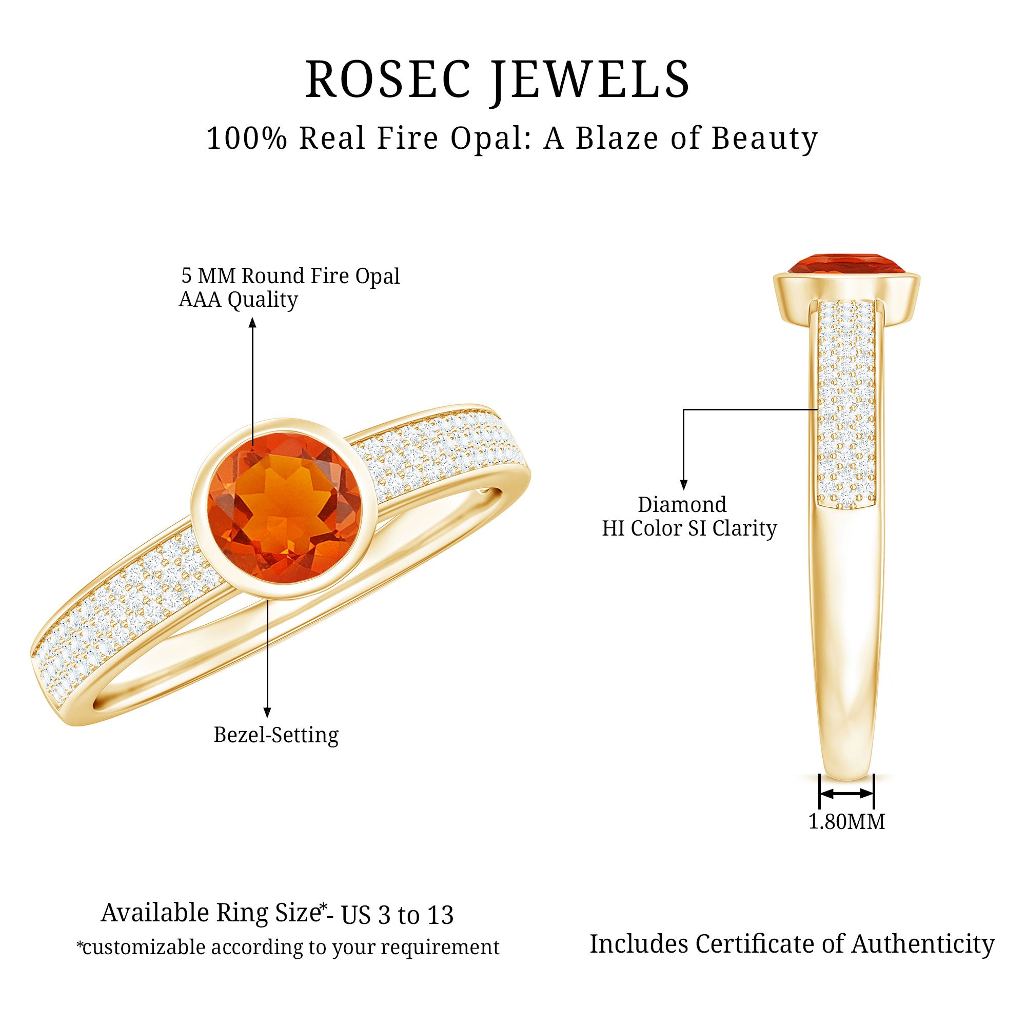 This Fire Opal Engagement Ring lends an air of grace and elegance to your special day. It embellished with Round Shape Fire Opal in Bezel Setting with Diamond Side Stones in Pave Setting. This Fire Opal and Diamond Engagement Ring is beautifully crafted in Gold. Present this Fire Opal Gold Ring to her and make her feel like a princess.