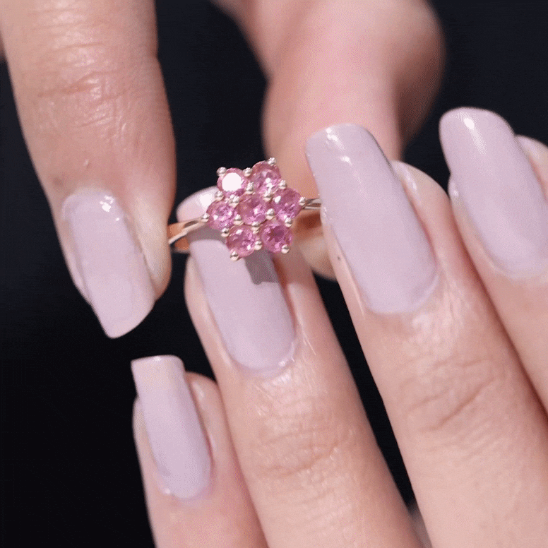 The Classic Flower Ring features a simple yet elegant design with a round pink tourmaline set in a cluster prong setting. This stunning floral arrangement amplifies the rings beauty, which is crafted with Solid Gold.