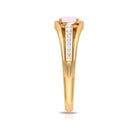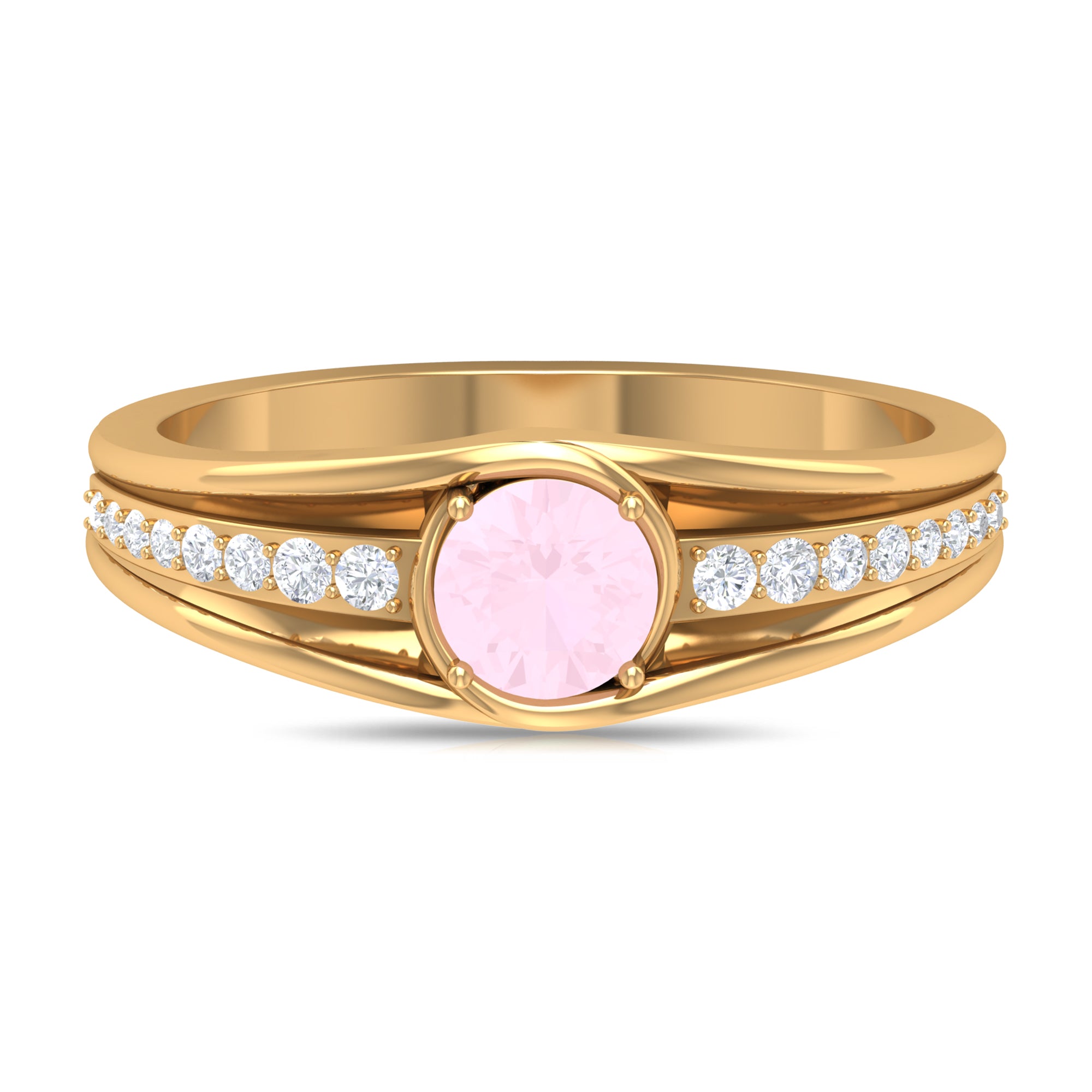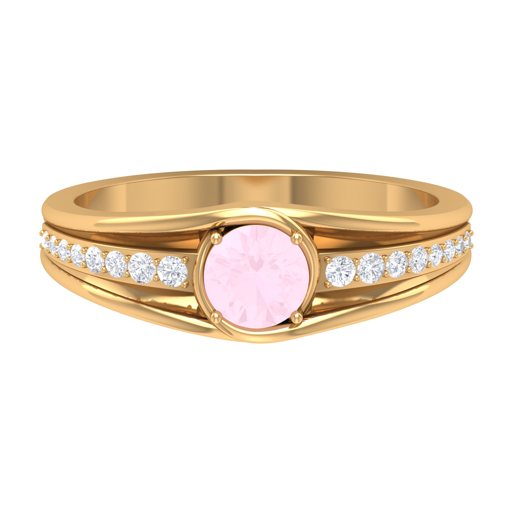 Classic Solitaire Ring For Women is set with Precious Round Shape Rose Quartz as Solitaire and Round Shape Diamond set as Side Stones in Prong Setting. This Gold Solitaire Ring is crafted in Solid Gold.