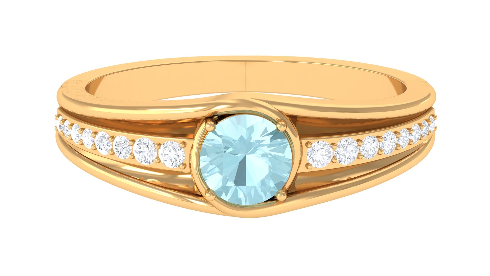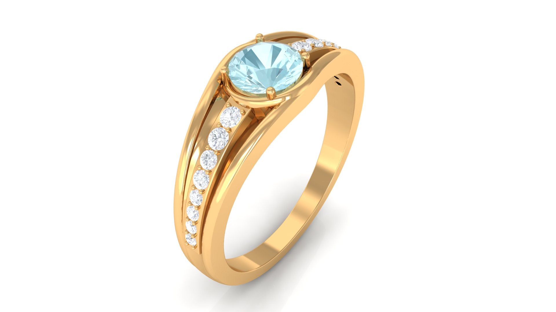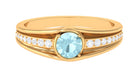 Classic Solitaire Ring For Women is set with Precious Round Shape Sky Blue Topaz as Solitaire in a prong setting and Round Shape Diamond set as Side Stones in a Prong Setting. This Gold Anniversary Ring is crafted in Solid Gold.