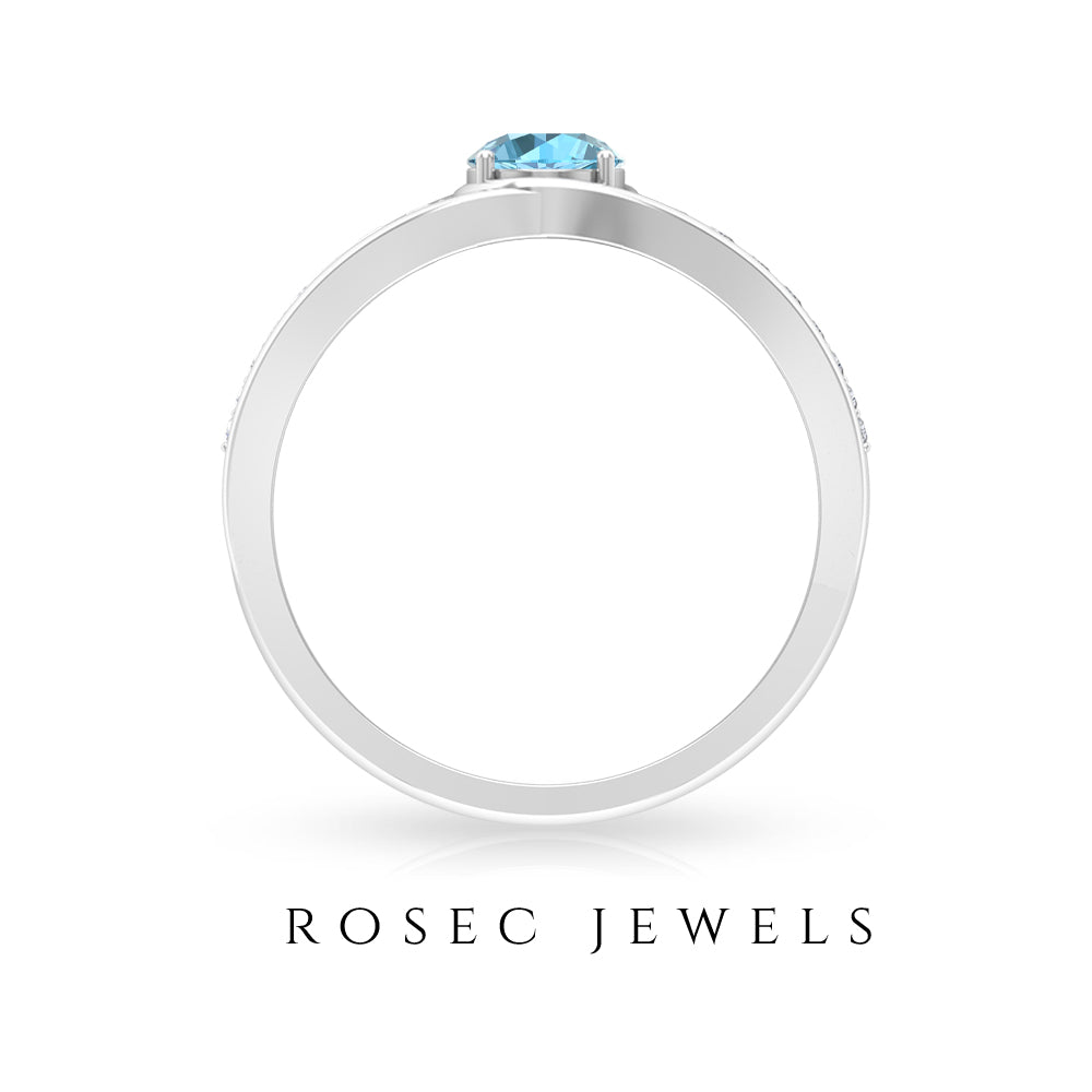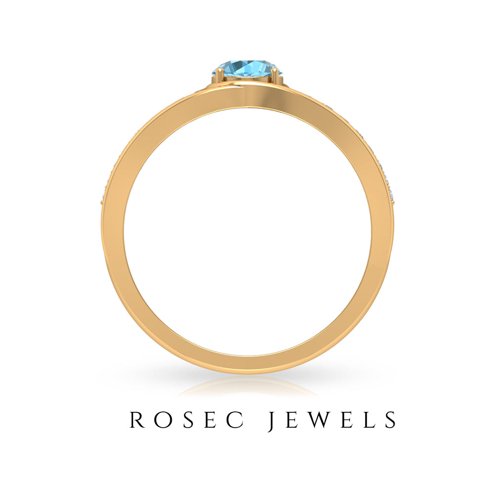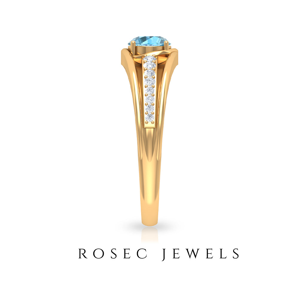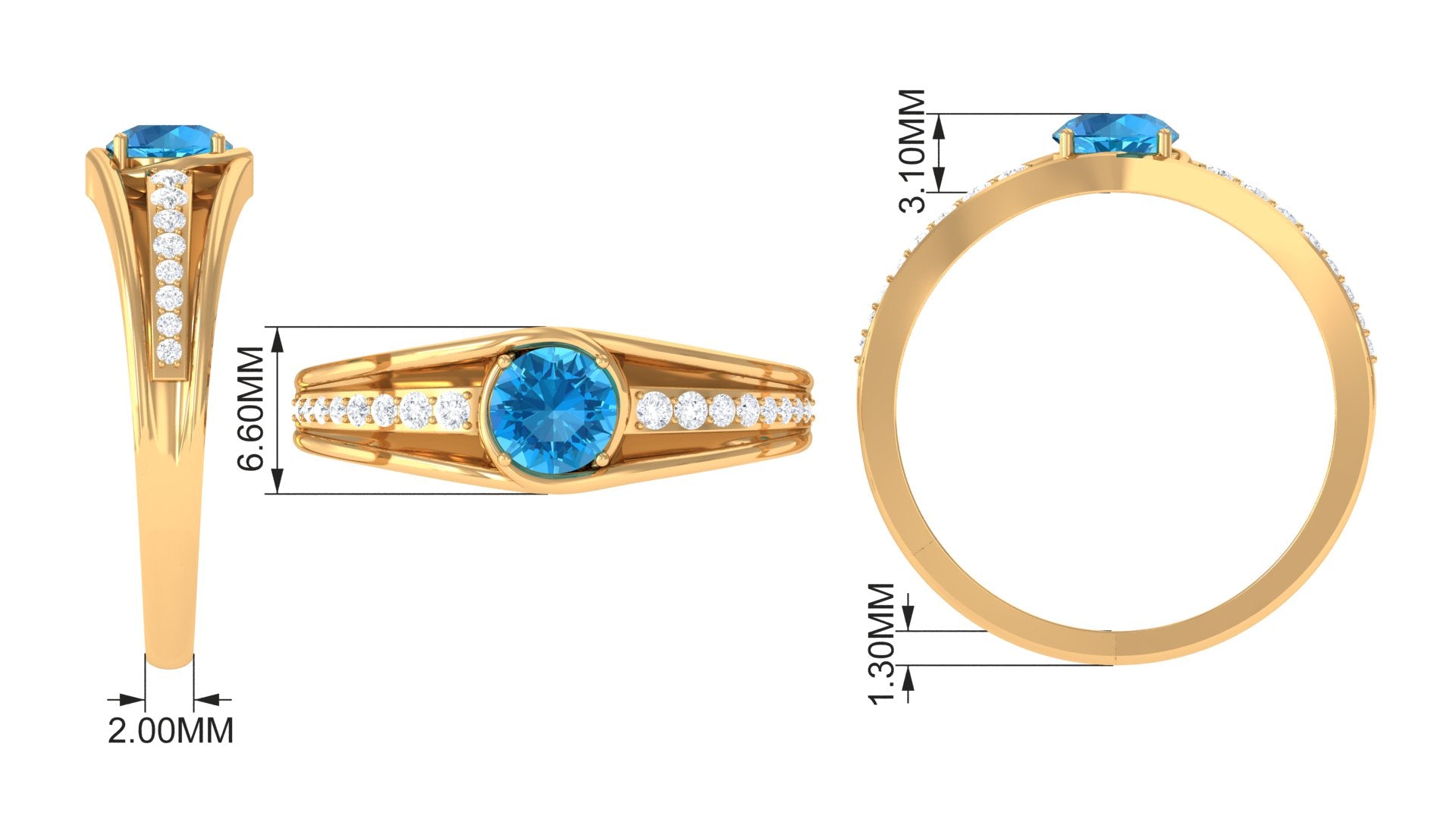 Classic Solitaire Ring For Women is set with Precious Round Shape Swiss Blue Topaz as Solitaire and Round Shape Diamond set as Side Stones in Prong Setting. This Gold Solitaire Ring is crafted in Solid Gold.