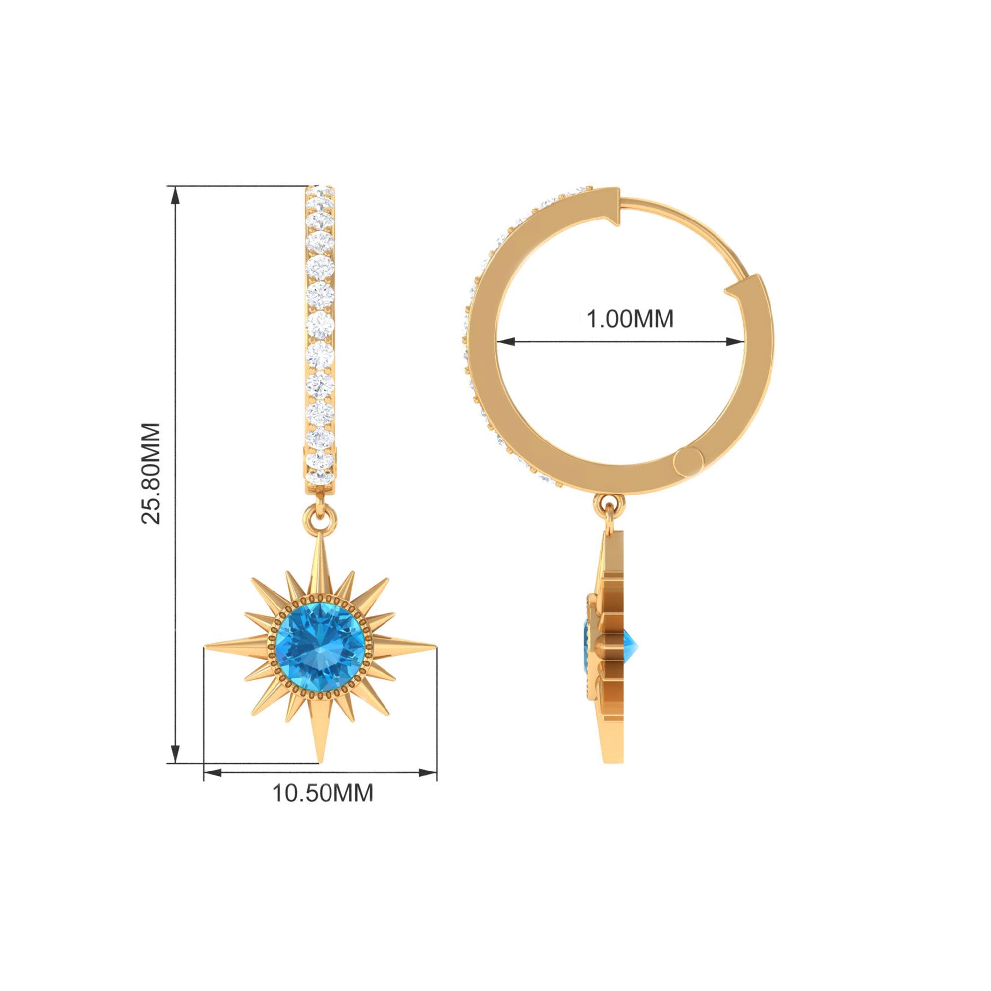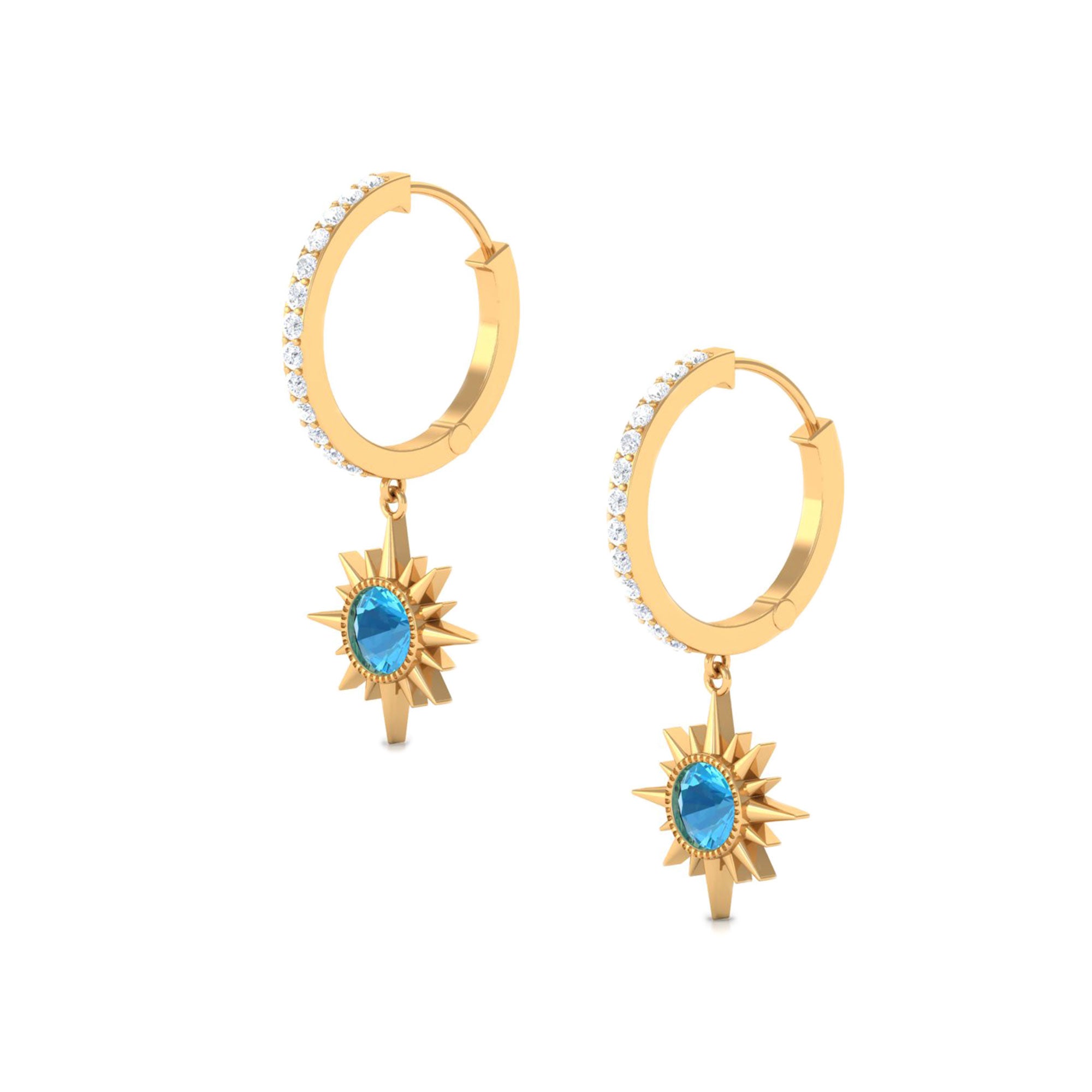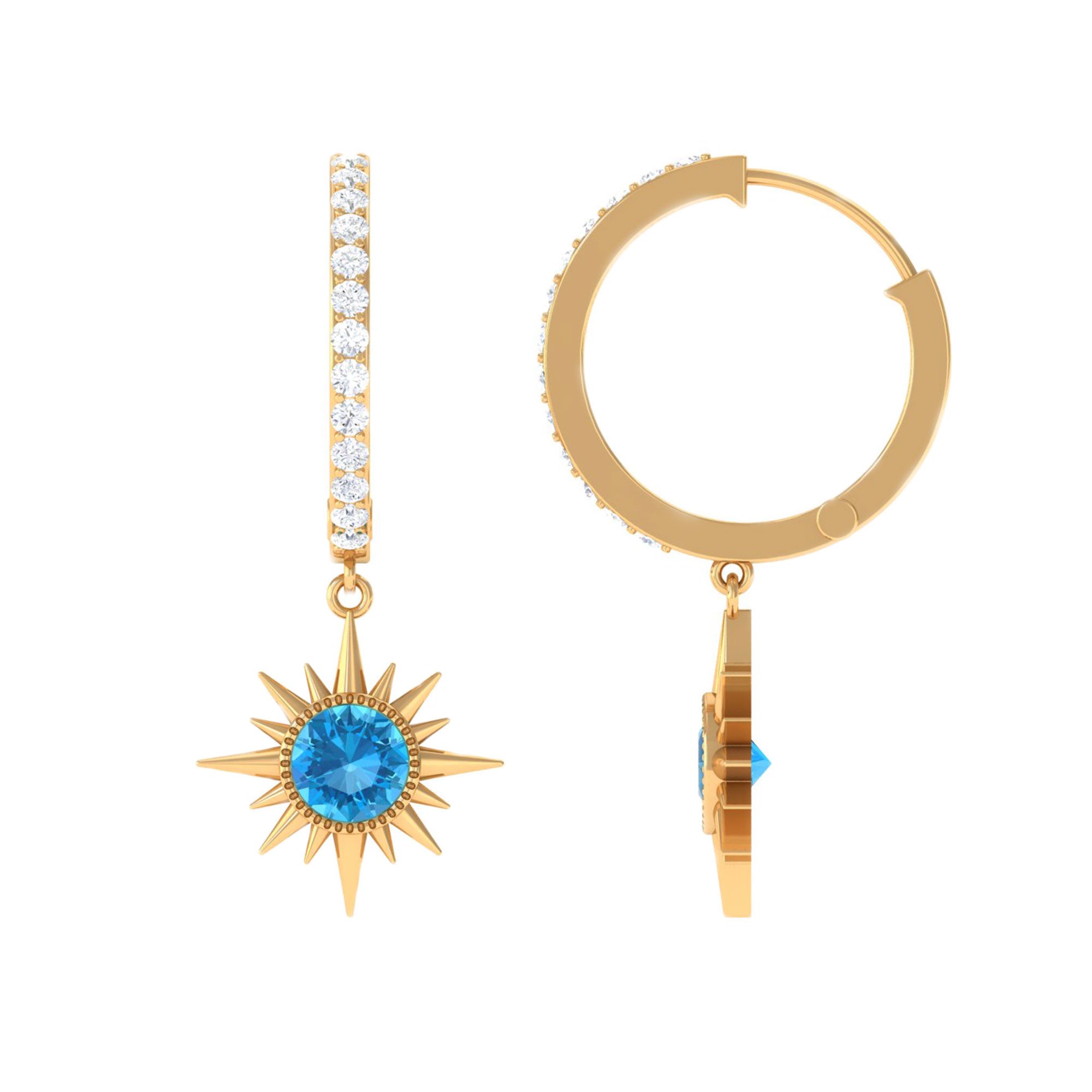 Make a Statement as you flaunt these Sunburst Hoop Earrings with a Swiss Blue Topaz Solitaire embodied in a unique Sunburst design accentuated by Diamond Accent which adds to the look of these Sunburst Hoop Earrings.