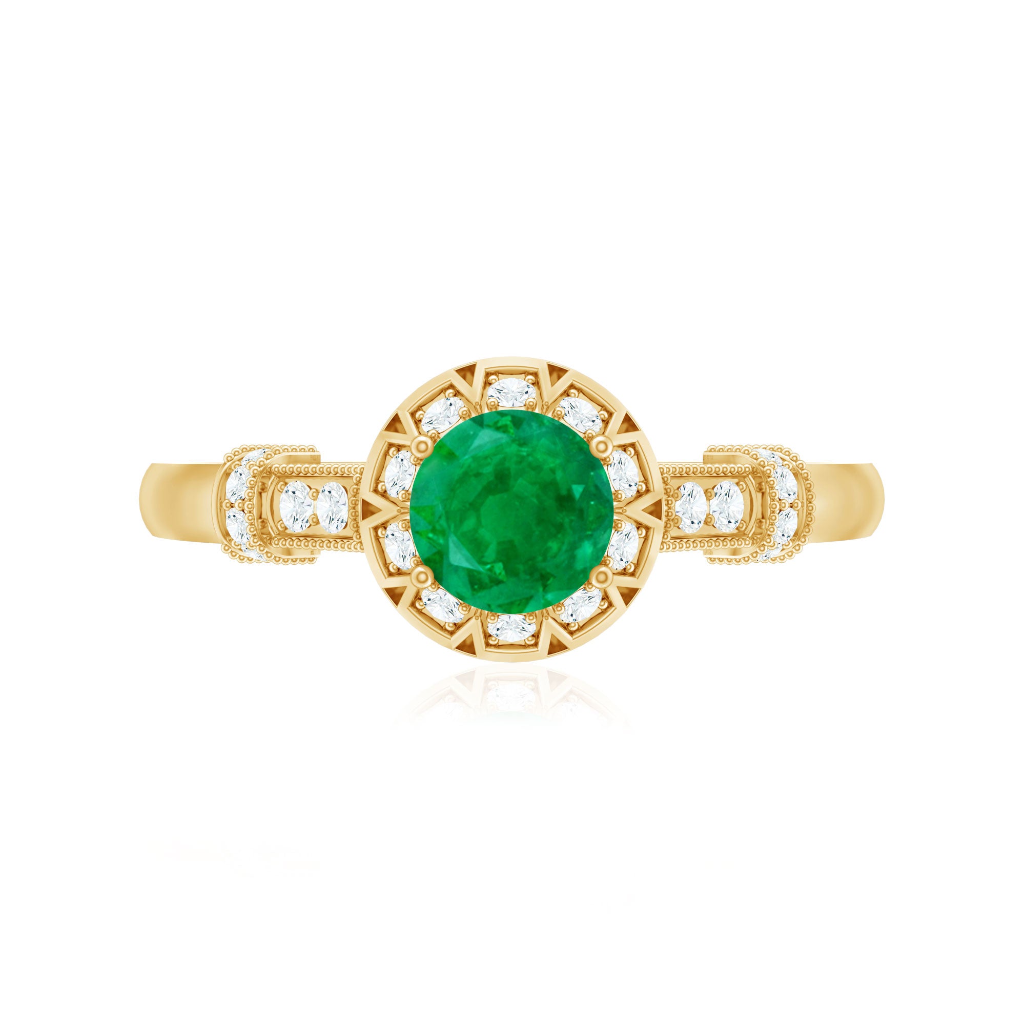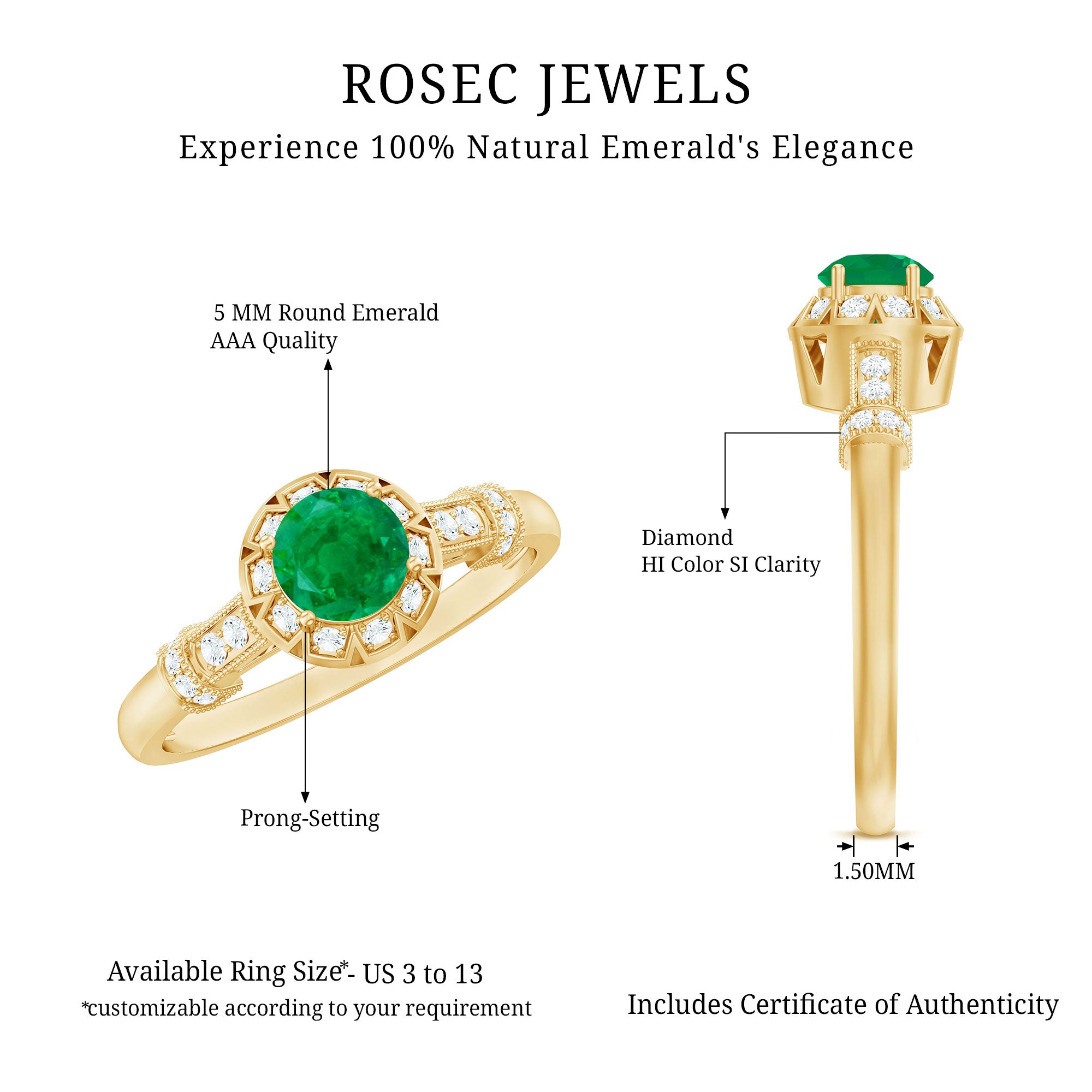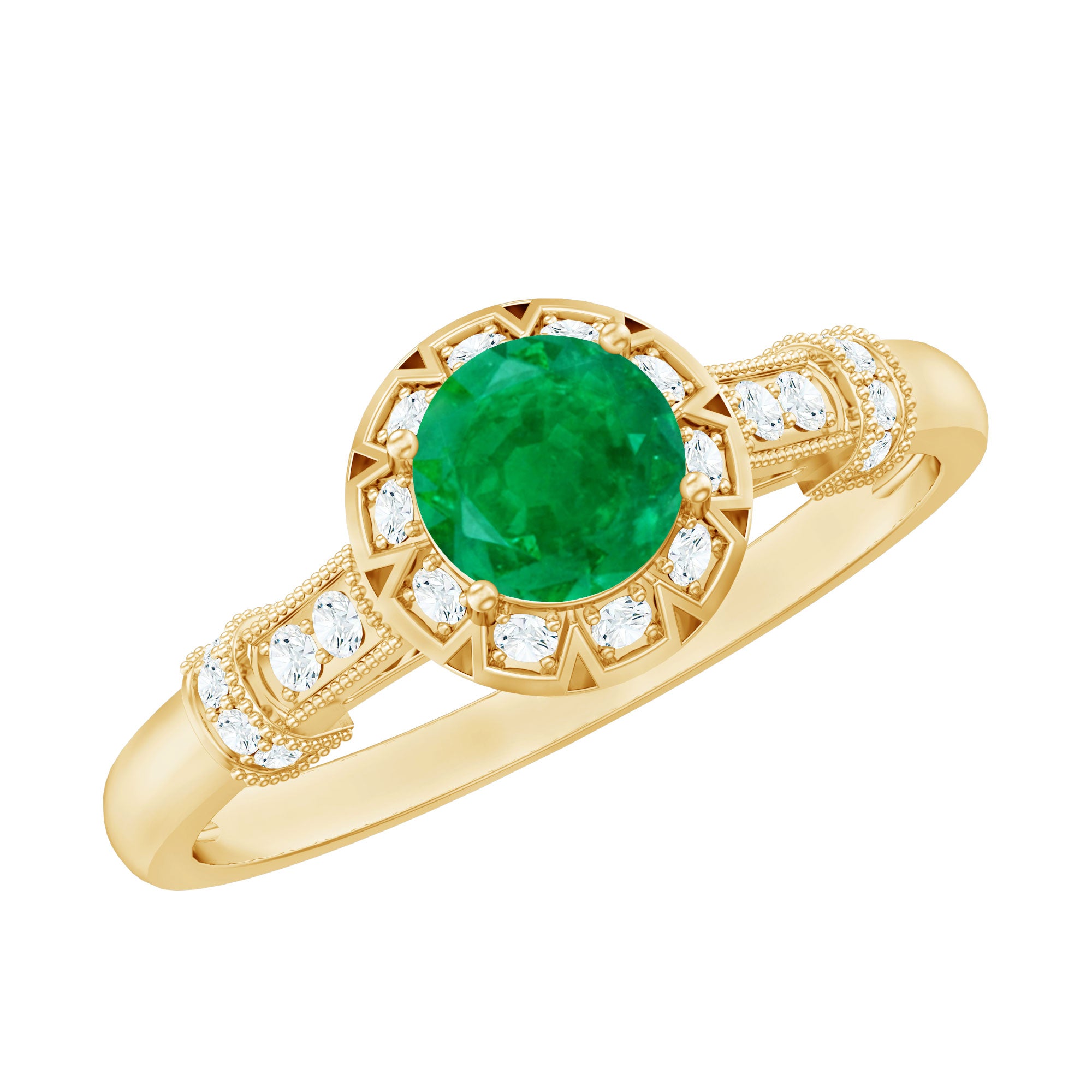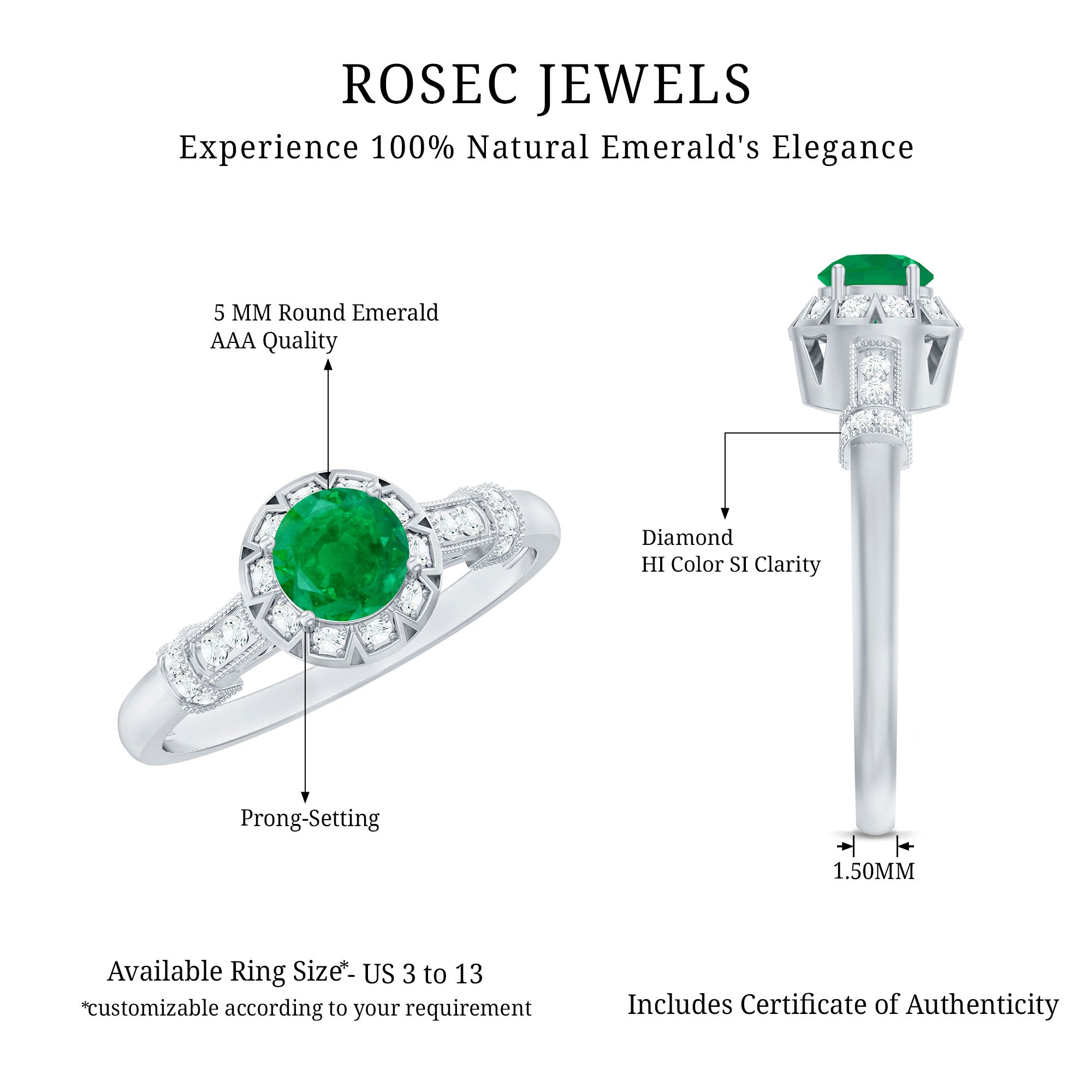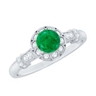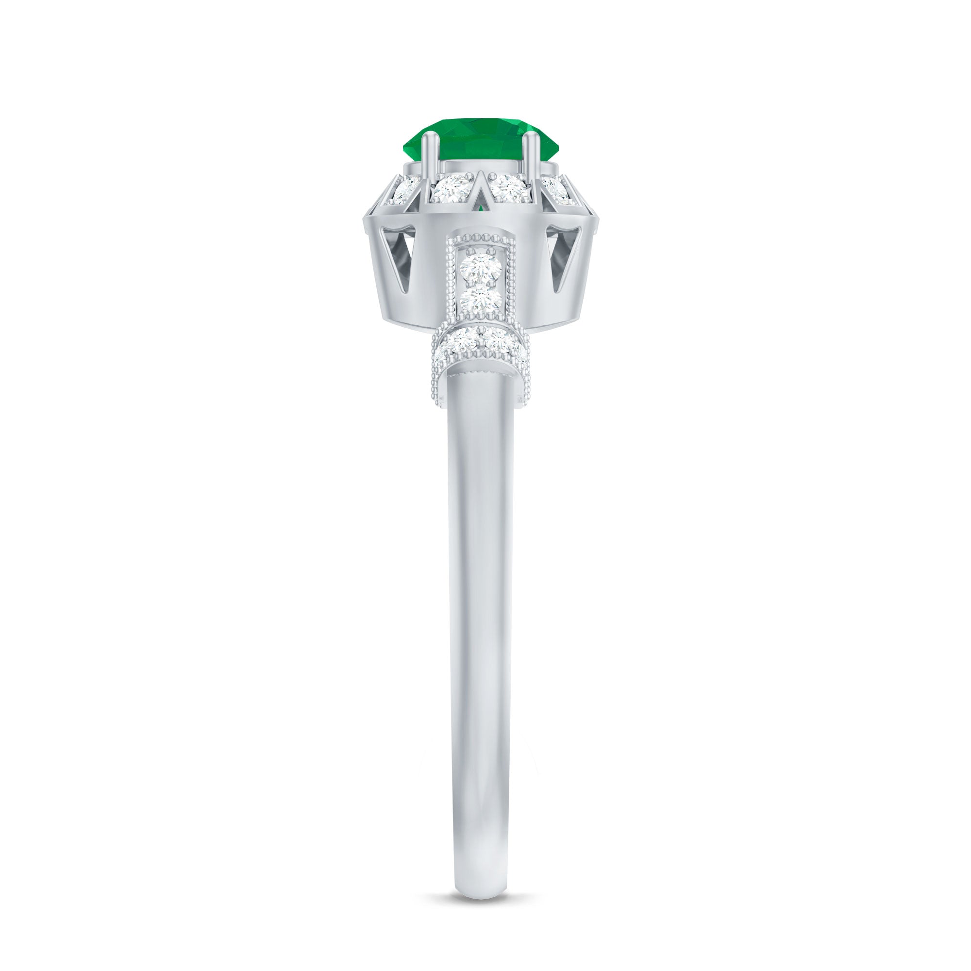 Accentuate your look with this with this Vintage Inspired Emerald Engagement Ring and grab all the attention at the party. The Round Emerald is held in prong setting beautifully exhibiting an effortless charm and the round diamond arranged as accent and side stone are add an extra charm to this fine ring.