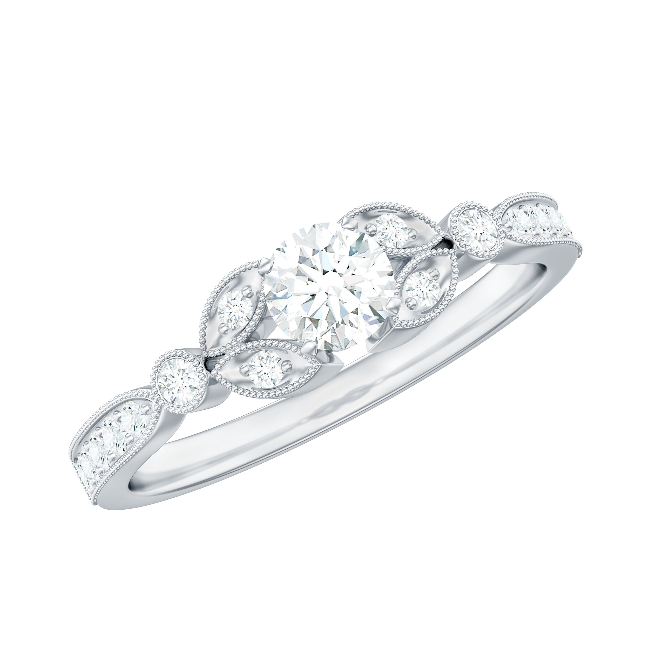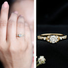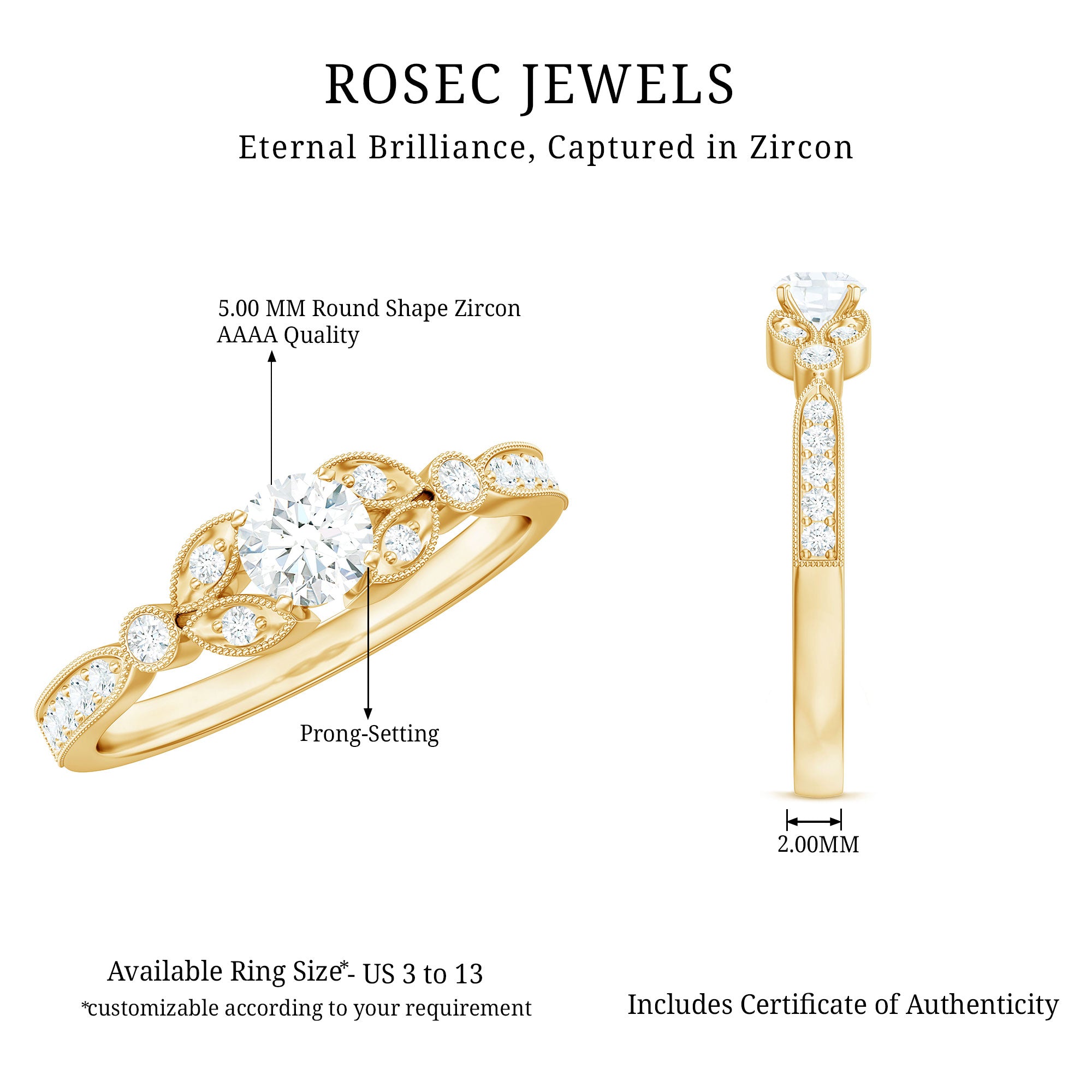 Accentuate your look with this Vintage Zircon Engagement Ring and grab all the attention at the party. The Round Cubic Zirconia is held in square prong setting beautifully exhibiting an effortless charm and the round cz arranged as accent. The Milgrain Gold details are augmenting an opulent appeal of this Cubic Zirconia Ring.