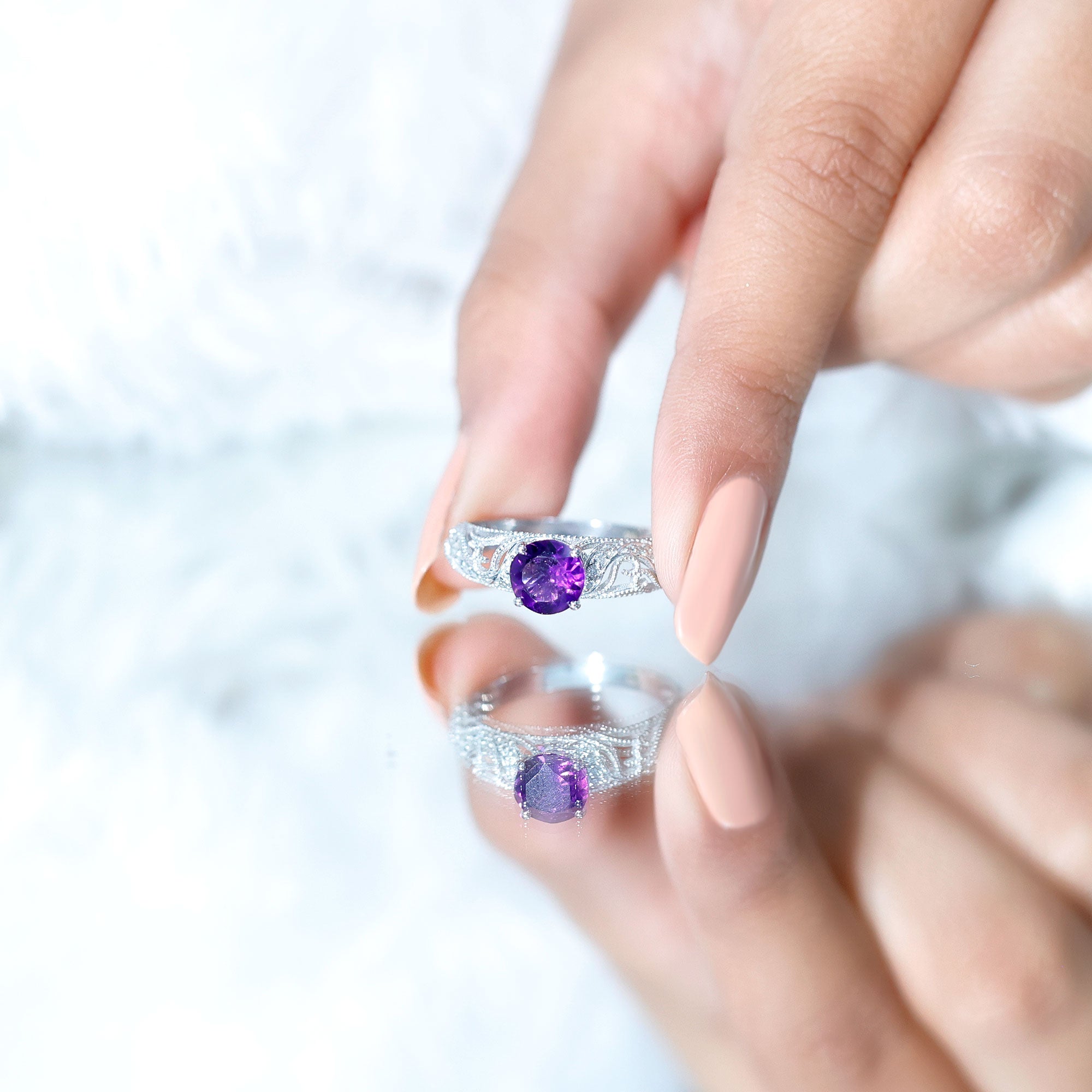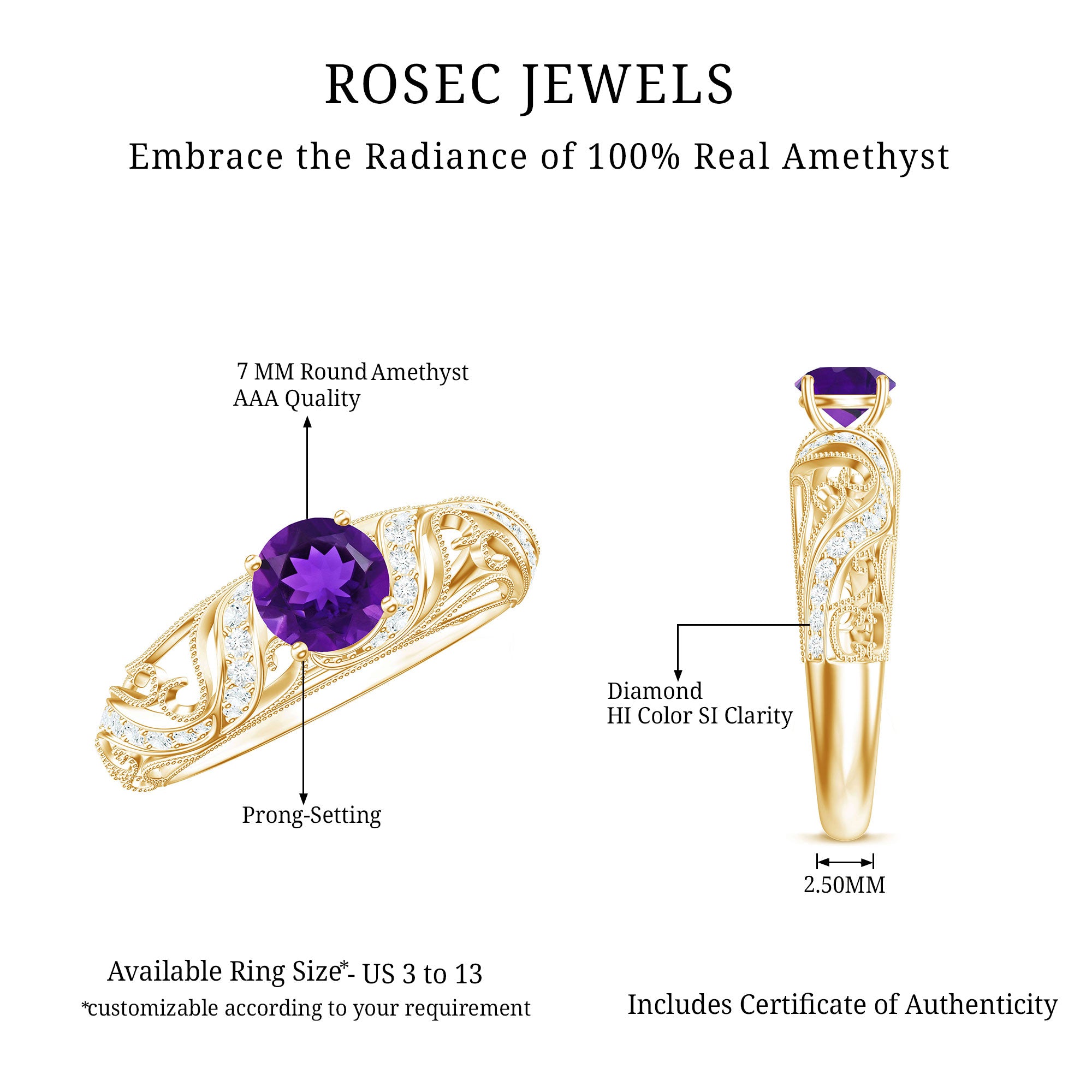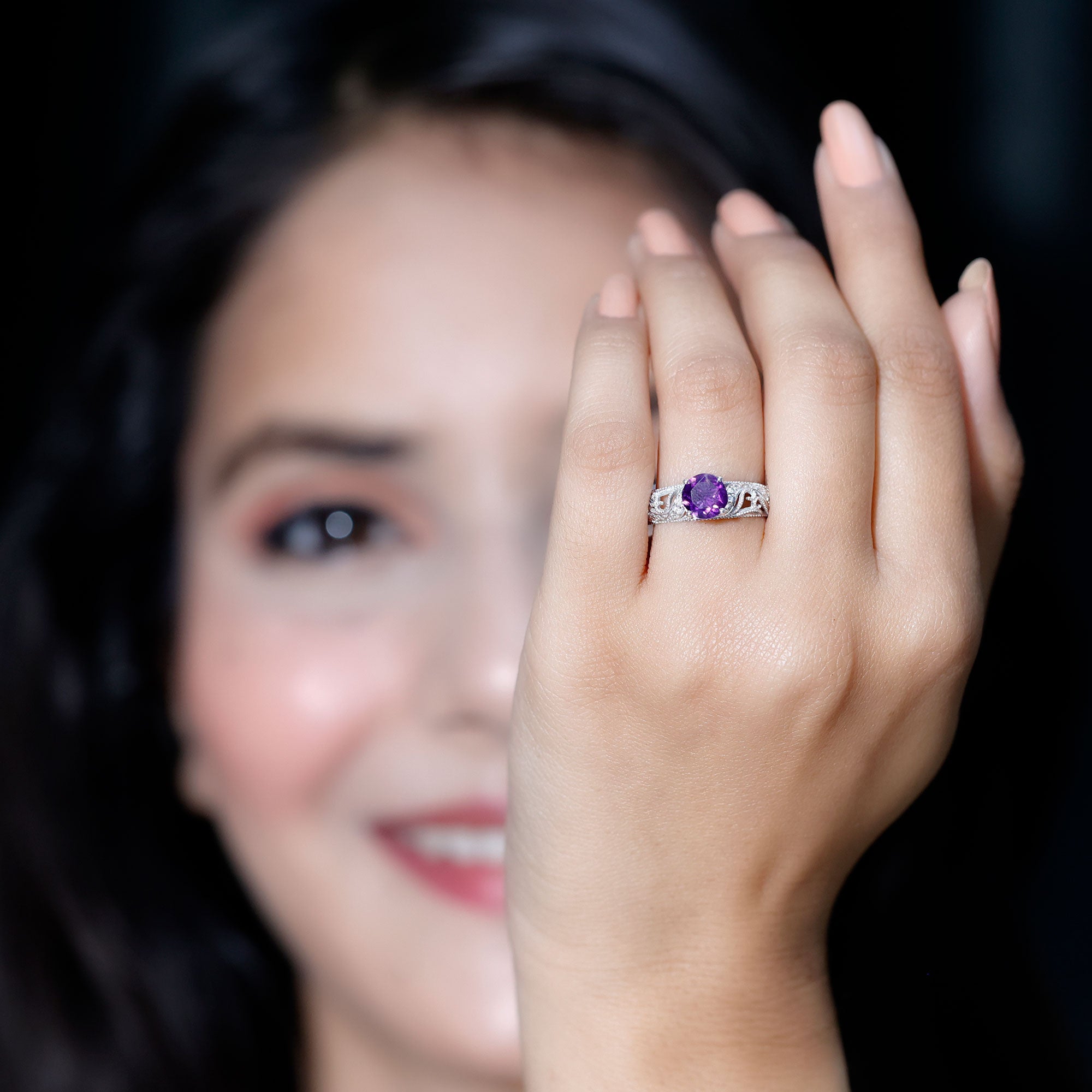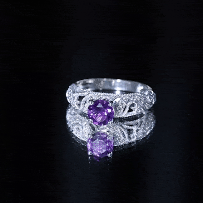 The brightness of Amethyst makes this vintage engagement ring more appealing. The Amethyst Ring is embellished with Round Diamond, glistening on the shank beautifully. The Amethyst Diamond Engagement Ring is accentuated with Beaded detailing, make your significant feel more precious with this Amethyst Ring.