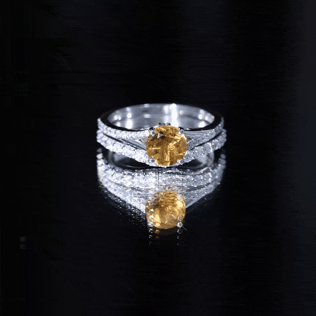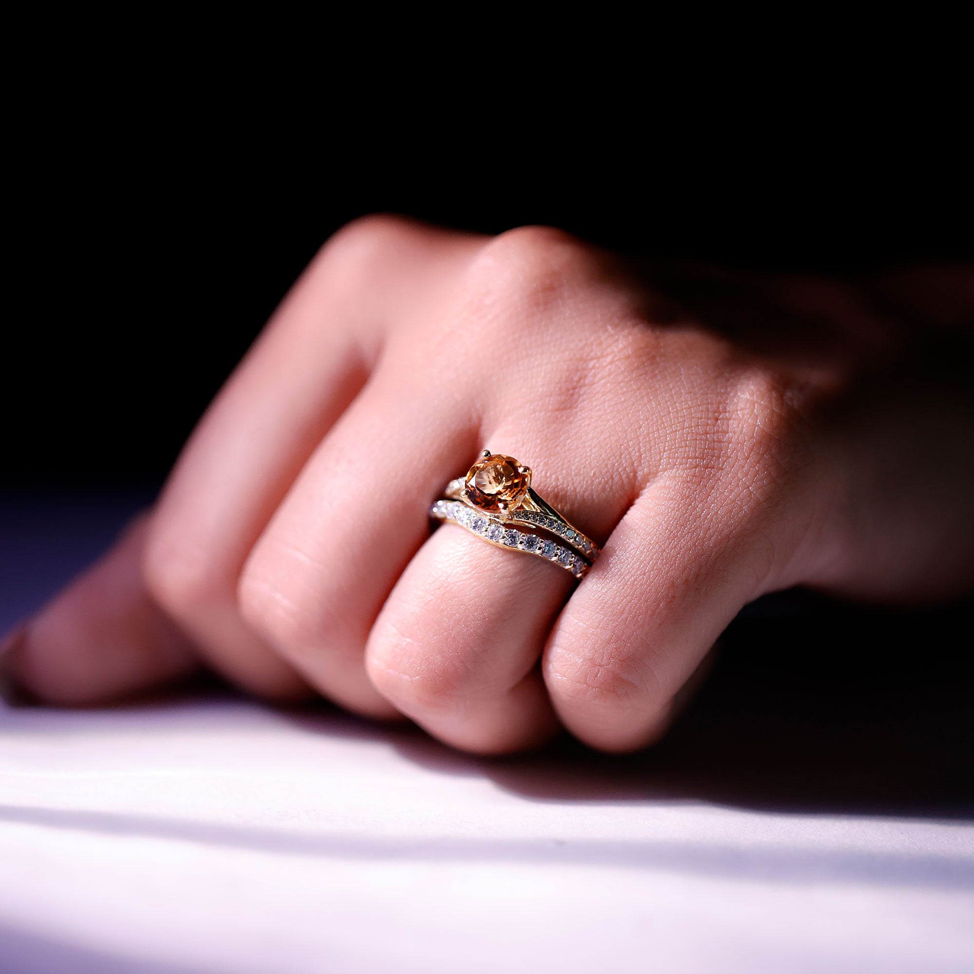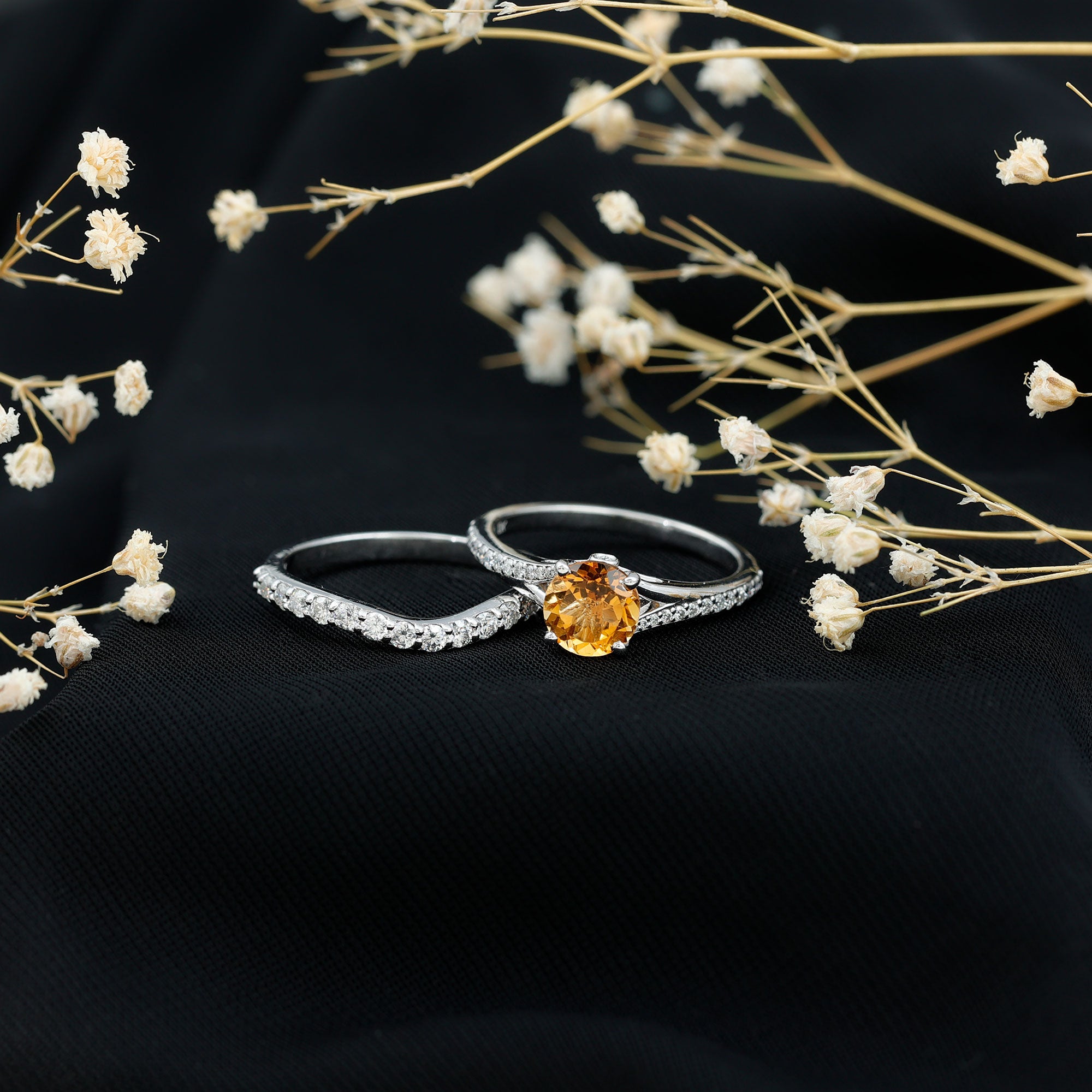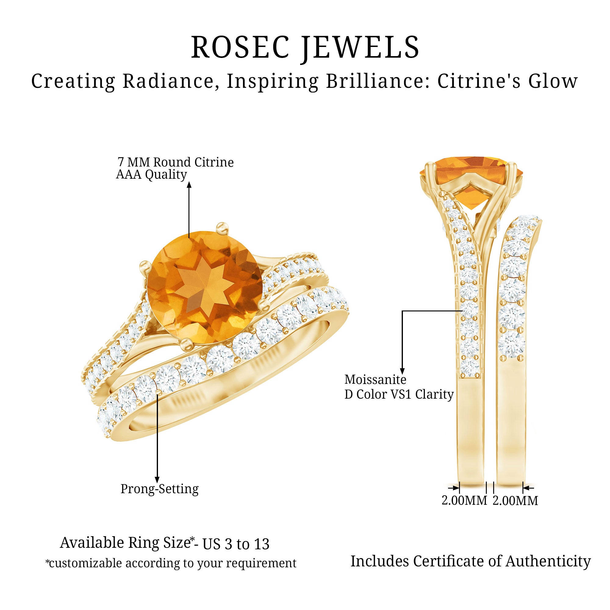 Adorned in Gold, it is a Wedding and Engagement Set featuring a Round Cut Citrine embellished in Prong Setting with Round Brilliant Moissanite embellished in Pave Setting.