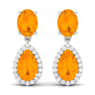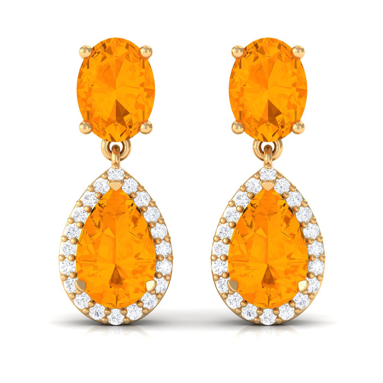 Jewelry has the power to be the one little thing that makes you feel unique. These Teardrop Earrings are embellished with Pear and Oval Cut Fire Opal and Round Shape Diamond Halo in Prong Setting. These Fire Opal Dangle Earrings are available in gold. Tell your story by wearing these Beautiful Designer Bridal Earrings.