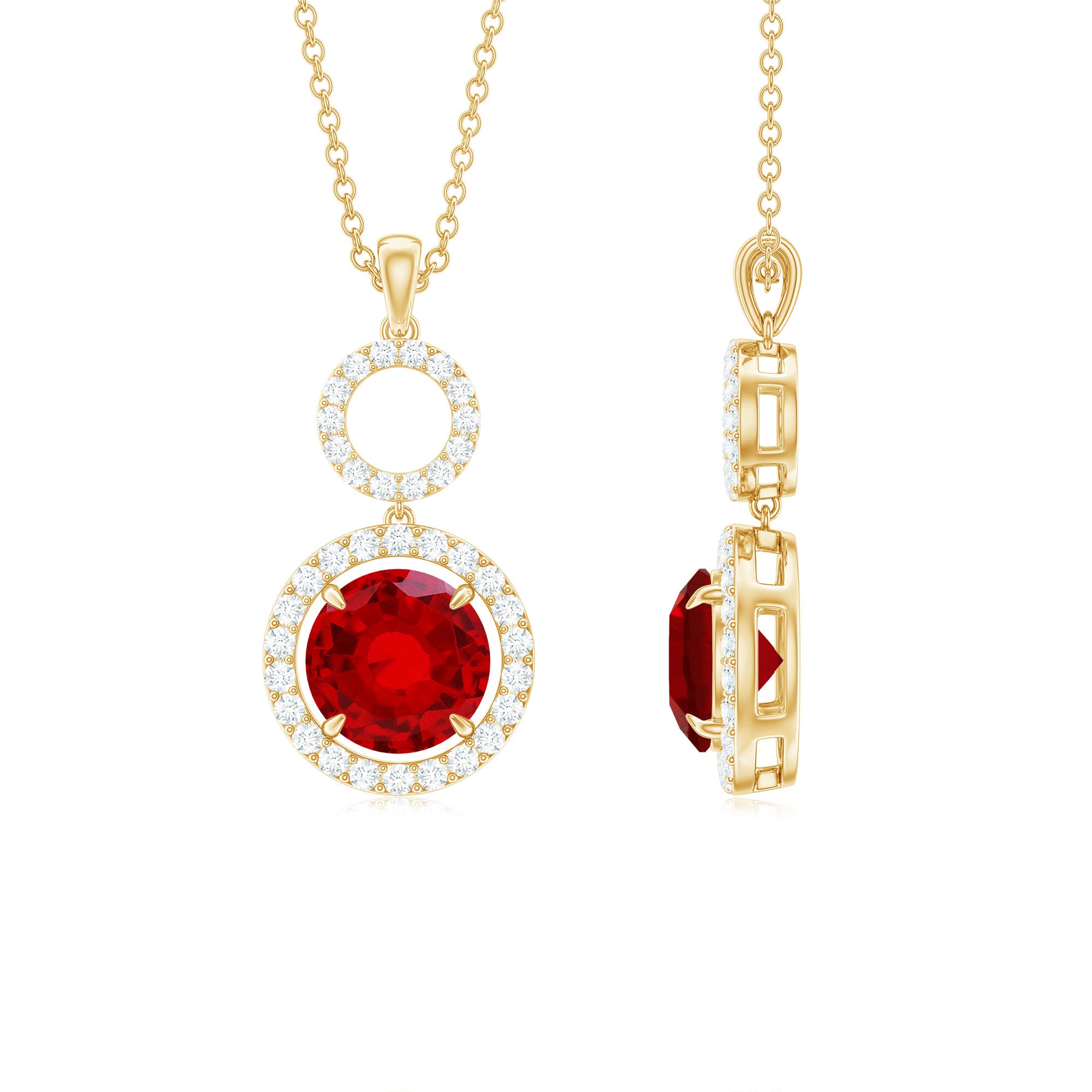 Elevate your style with this exquisite Created Ruby Pendant. Featuring a Brilliant Round Shape Created Ruby in a Claw Setting with Diamond Halo and Open Circle, this pendant necklace is a stunning addition to your jewelry collection. Crafted in Gold, this dangle pendant makes for a lovely surprise for your beloved.