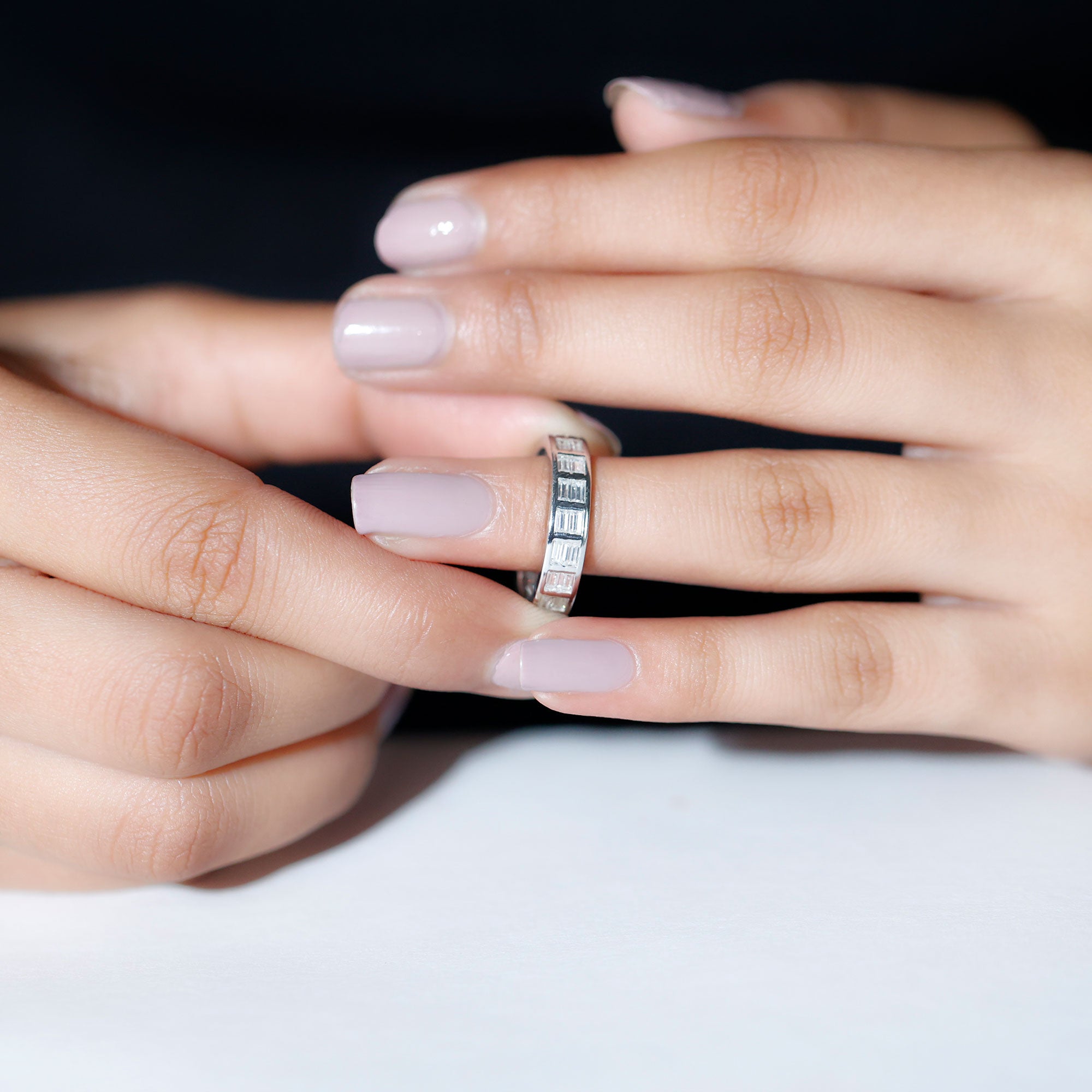 Stylish, distinctive Cubic Zirconia Band Ring which you can wear as an everyday staple or as an office jewelry also. The Baguette Cut Zircon in Channel Setting on Two Row Band Ring adorns this elegant jewelry. The options are endless with this Eternity Band Ring, you can also stack with your other rings too. How will you wear yours? The ring carries a total weight of 3 Carat. All our gemstones are certified and undergoes strict quality check.