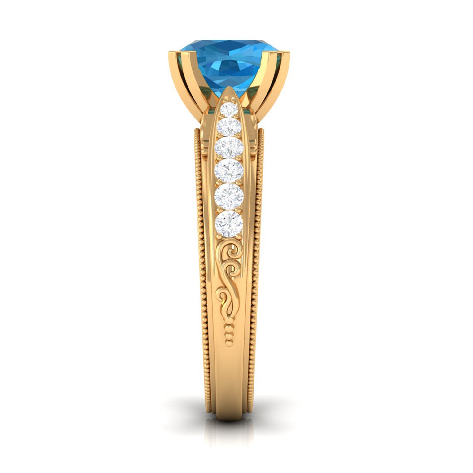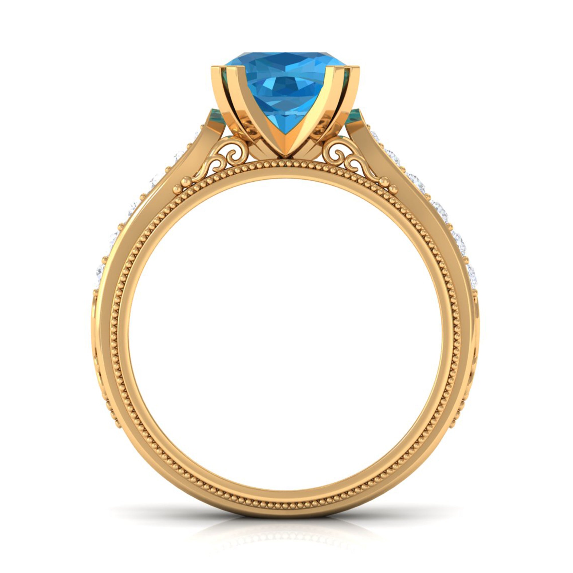 This engagement ring features an 8mm cushion-cut solitaire of Swiss blue topaz, complemented by Diamond accents and a distinctive milgrain design to enhance its overall appearance.