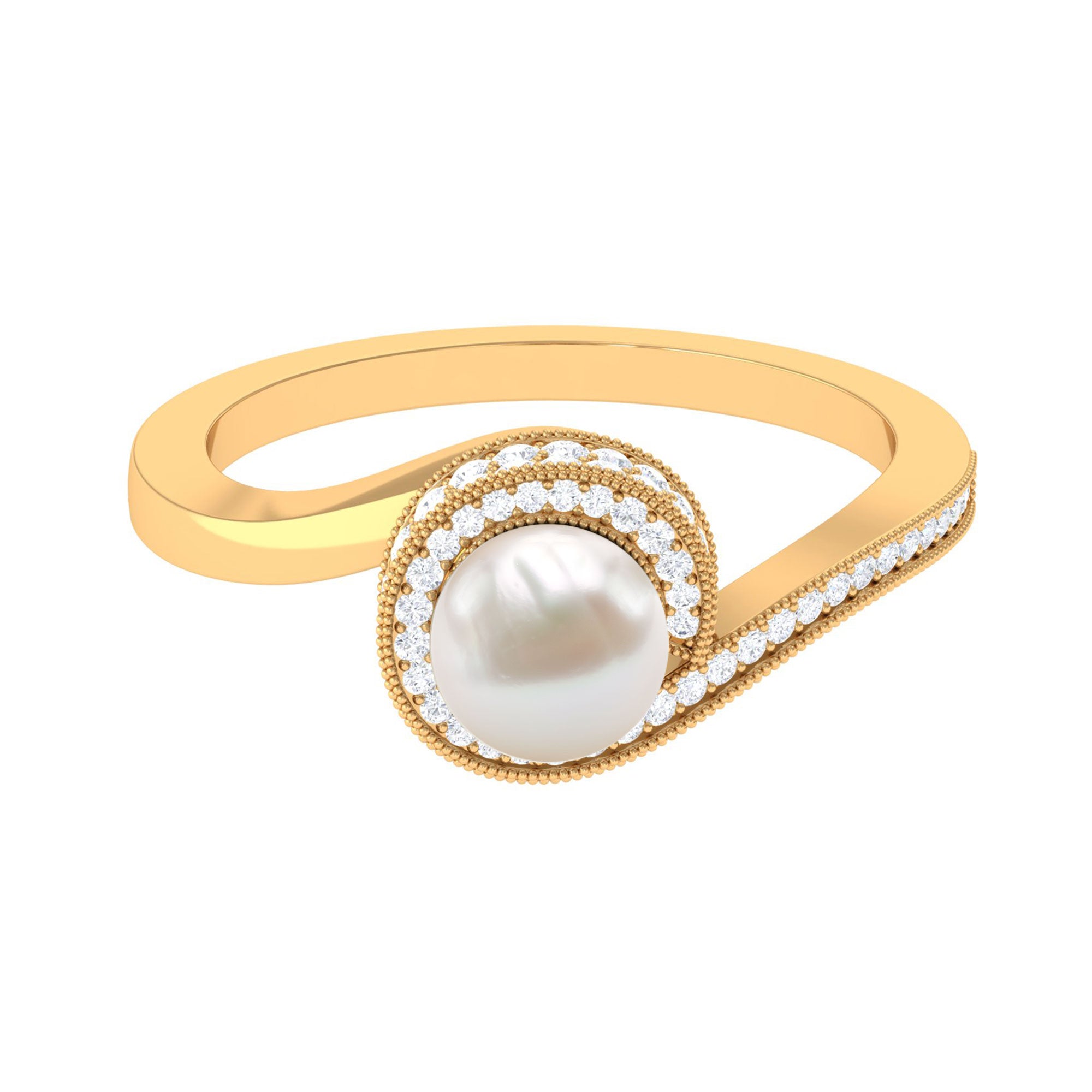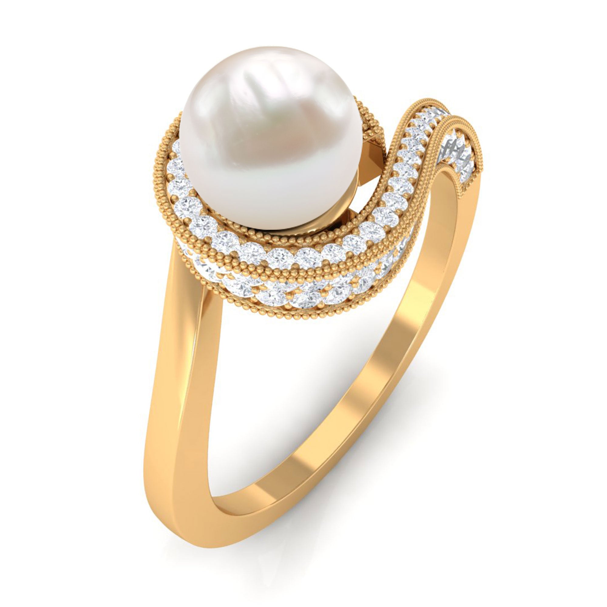 Elevate your style with our beautiful Bypass Engagement Ring, featuring a stunning Round Shape Freshwater Pearl at its center, accented with a shimmering Diamond halo and intricate beaded detailing. Crafted in gold, this Freshwater Pearl with Diamond Halo Ring exudes a luxurious and sophisticated charm, perfect for making a stylish statement on any occasion. With its elegant design and premium quality materials, this ring is sure to become a cherished addition to your jewelry collection, adding a touch of radiance and beauty to your everyday look.