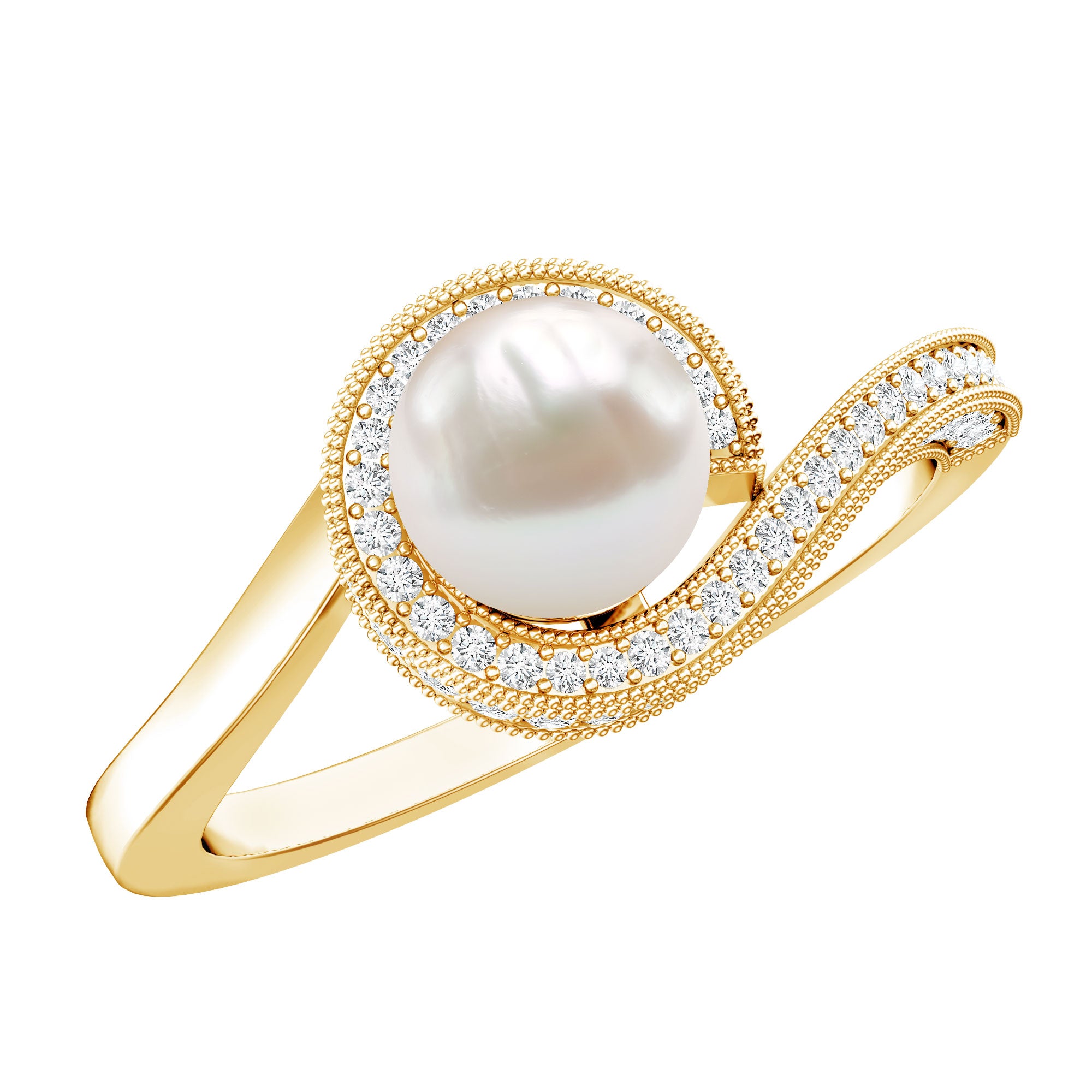 Elevate your style with our beautiful Bypass Engagement Ring, featuring a stunning Round Shape Freshwater Pearl at its center, accented with a shimmering Diamond halo and intricate beaded detailing. Crafted in gold, this Freshwater Pearl with Diamond Halo Ring exudes a luxurious and sophisticated charm, perfect for making a stylish statement on any occasion. With its elegant design and premium quality materials, this ring is sure to become a cherished addition to your jewelry collection, adding a touch of radiance and beauty to your everyday look.