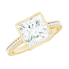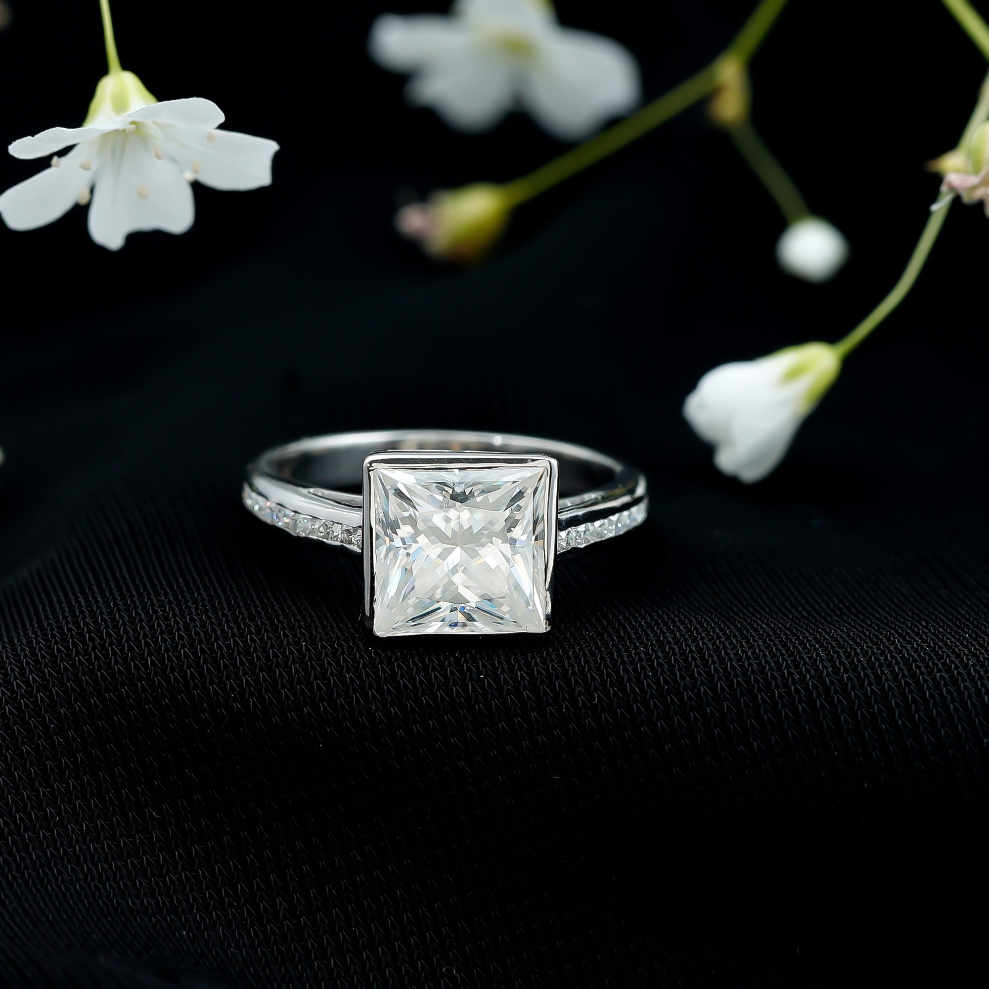 If she wants something to say Look at me! I am here. then a 3-carat engagement ring is the perfect fit for the statement chic but classic woman. With a gorgeous 8x8 mm princess cut centre stone of Moissanite with a brilliance and fire immeasurable to a natural diamond. Set in a modern bezel, it balances the line between refined and relaxed, perfect for everyday wear. Crafted with a certified Moissanite D-VS1 graded for quality, meaning its colourless and very clean to the eye. This ring will make each moment memorable, whether that be proposing, re-exchanging vows, or just wanting to celebrate your love.So why moissanite (in case you havent heard): moissanite is diamond-like darkness at about 1/10-th the price and (for the most part) a much better moral choice than a traditional diamond. These Moissanite rings for women are an excellent option when you desire an outstanding ring without sacrificing either beauty or quality. This one brings a modern feel with timeless meaning, whether youre loving Moissanite engagement rings or the structure of a bezel engagement ring. This is one to save in the case that you are looking for unique Moissanite diamond engagement rings. This engagement ring with a princess-cut is not simply an ornament, it is a piece of love, designed to sparkle along with you every day.