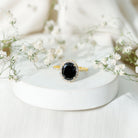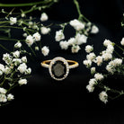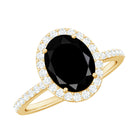 Delicate Created Black Diamond Engagement Ring is crafted in Gold, it has Diamond arranged both as Halo and as Side Stone to accentuate the ring. This Classic Oval Shape Created Black Diamond Ring is a perfect Gemstone Engagement Ring. Exhibiting high brilliance and charm, this Engagement Ring is a piece of fine jewelry.