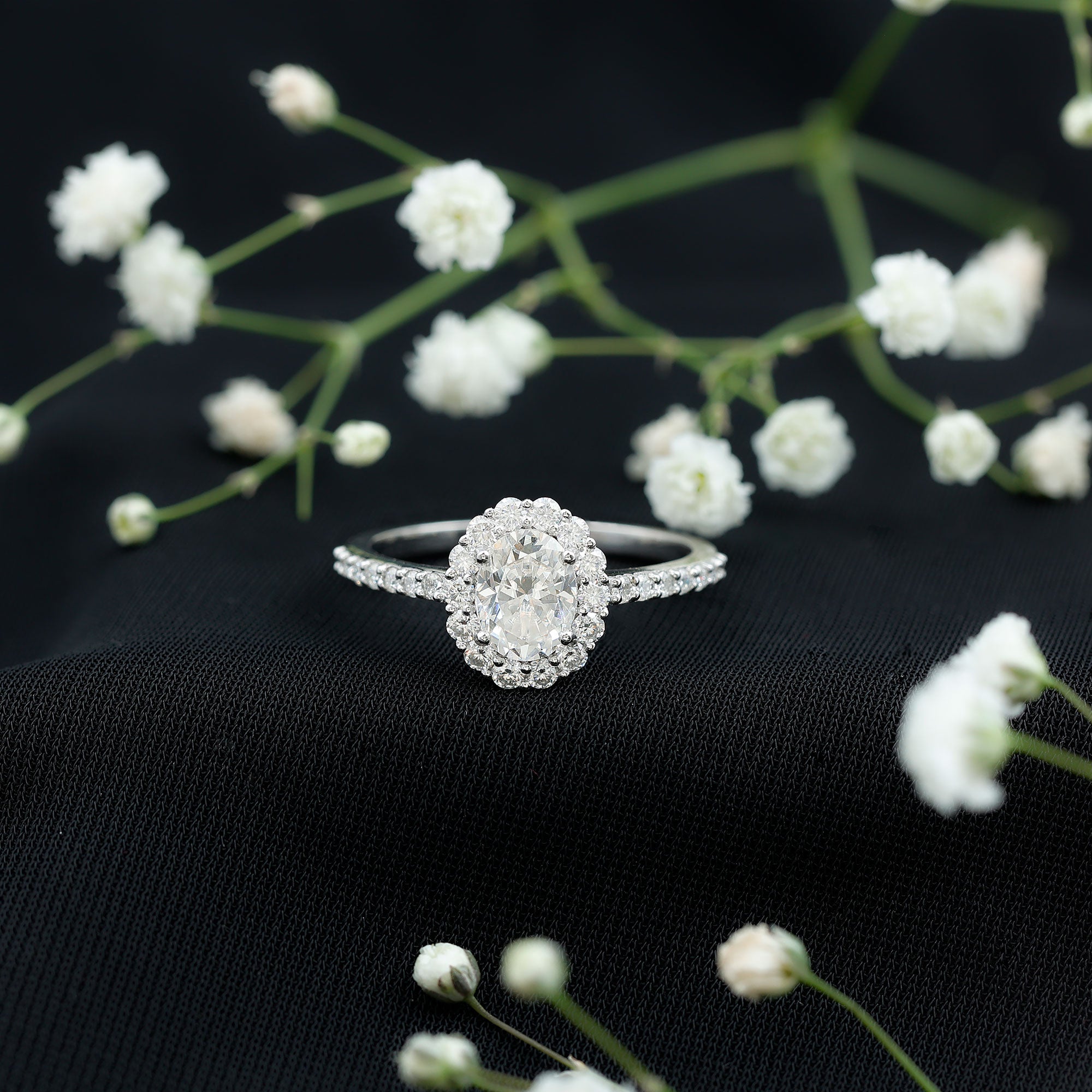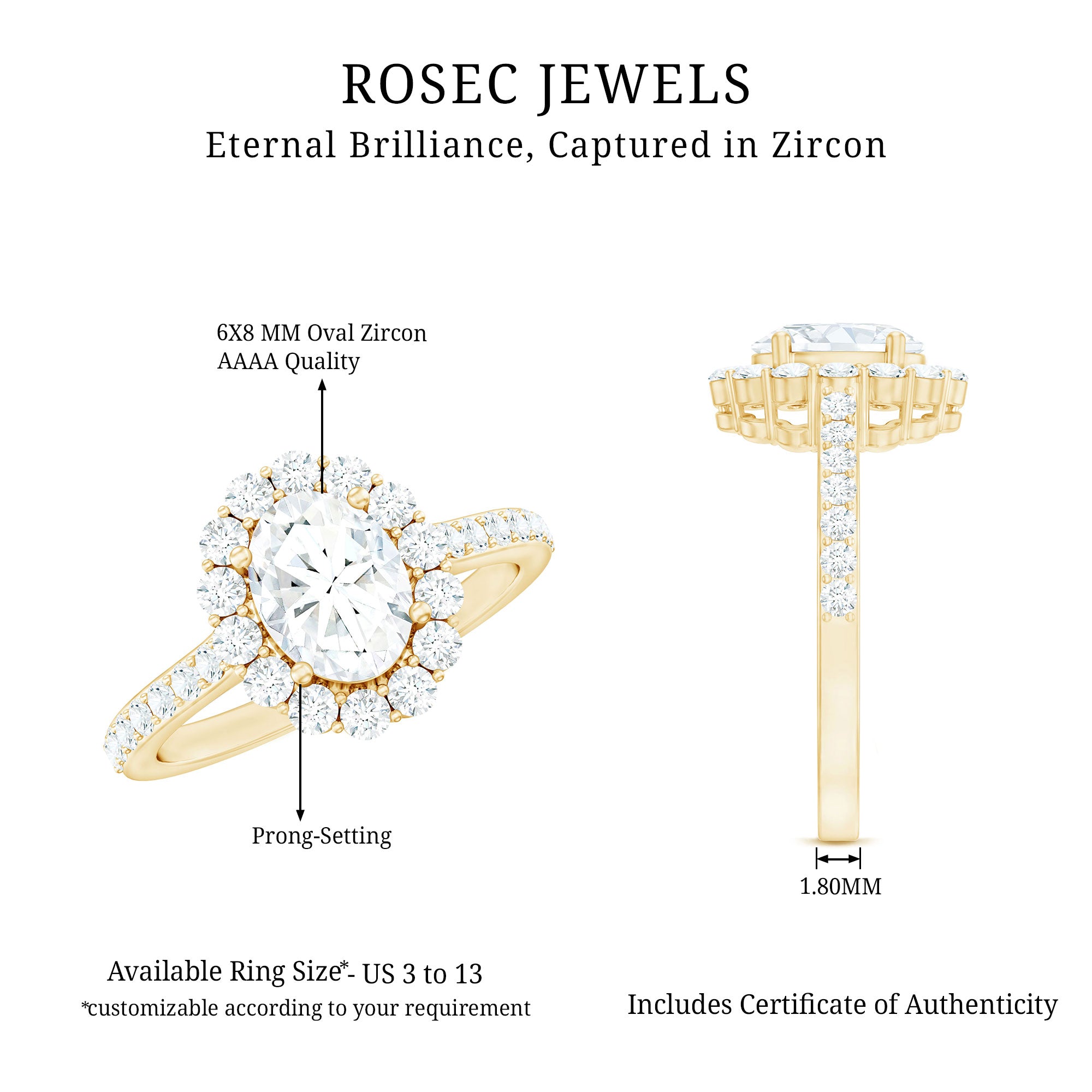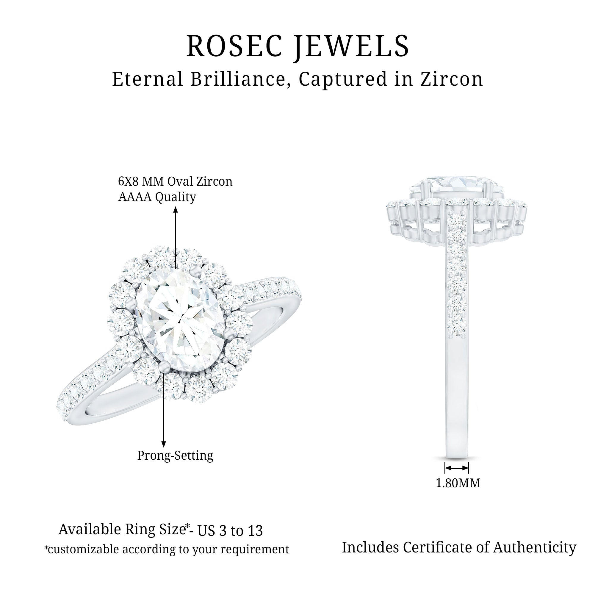 This classic halo ring showcases a stunning oval zircon stone in prong setting. The center stone is surrounded by a halo of smaller zircons that enhance its beauty and create a truly breathtaking effect. The oval shape of the stone is a timeless design that adds a touch of sophistication and elegance to any outfit. Whether youre looking for a stunning engagement ring, a special gift for a loved one, or just a beautiful piece of jewelry to wear on a special occasion, this halo ring is a perfect choice.