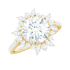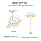 Make a statement with this stunning ring, featuring a round zircon center stone surrounded by a delicate floral halo of marquise and round cubic zirconia gems. The classic design adds a touch of femininity to this bold piece, making it the perfect choice for those who want to add a touch of glamour to their look.