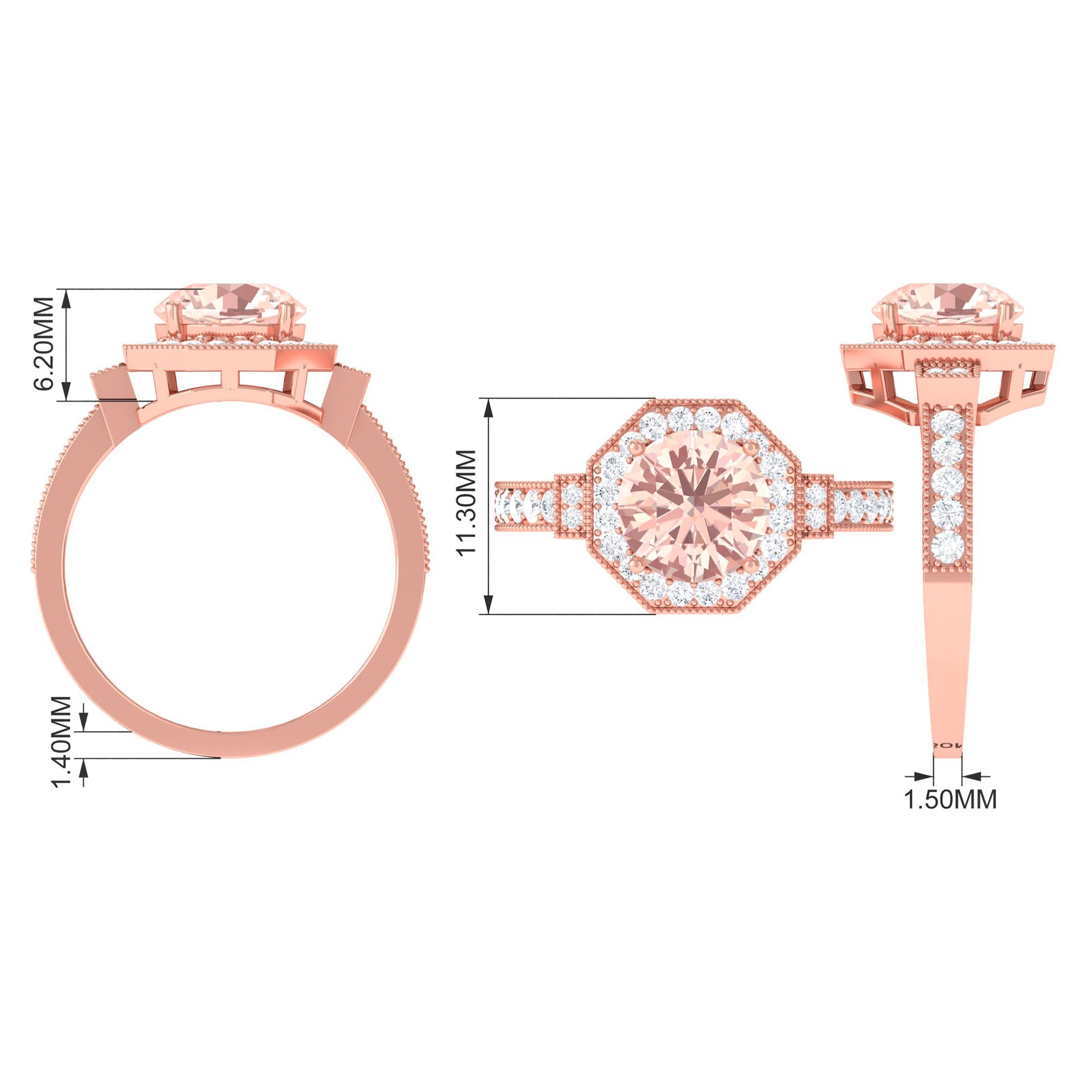 This Vintage Inspired Morganite Engagement Ring features a dazzling Round Cut Morganite at its center, beautifully accentuated by Moissanite accents. Crafted from Gold, this exquisite piece of jewelry is the perfect way to show your love and affection to your beloved.