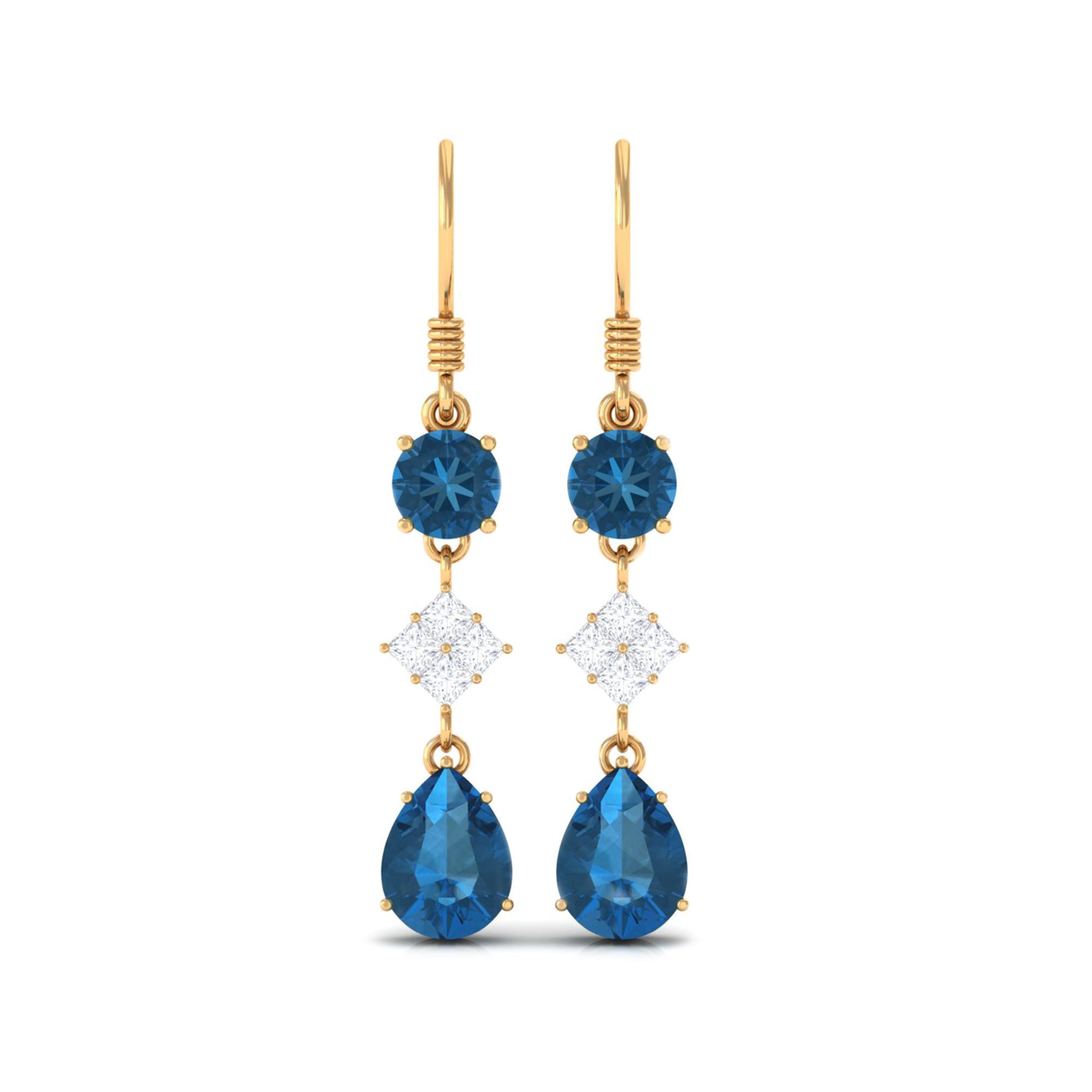 Make a statement with these radiant London Blue Topaz Dangle Earrings. The earrings feature a combination of pear and Round Shape London Blue Topaz in a dangle style, accented by princess cut Diamond stones. Crafted in gold, these earrings are the perfect accessory for women born in December. Adorn yourself with these eye-catching earrings and exude wealth and style. Upgrade your jewelry collection with these must-have dangle earrings.