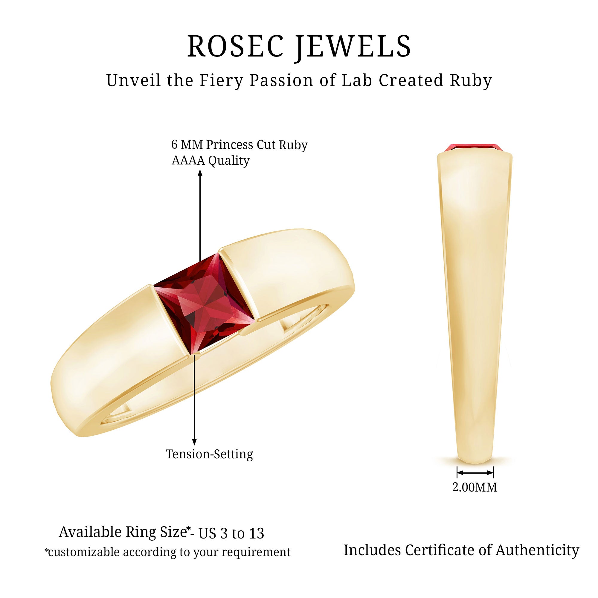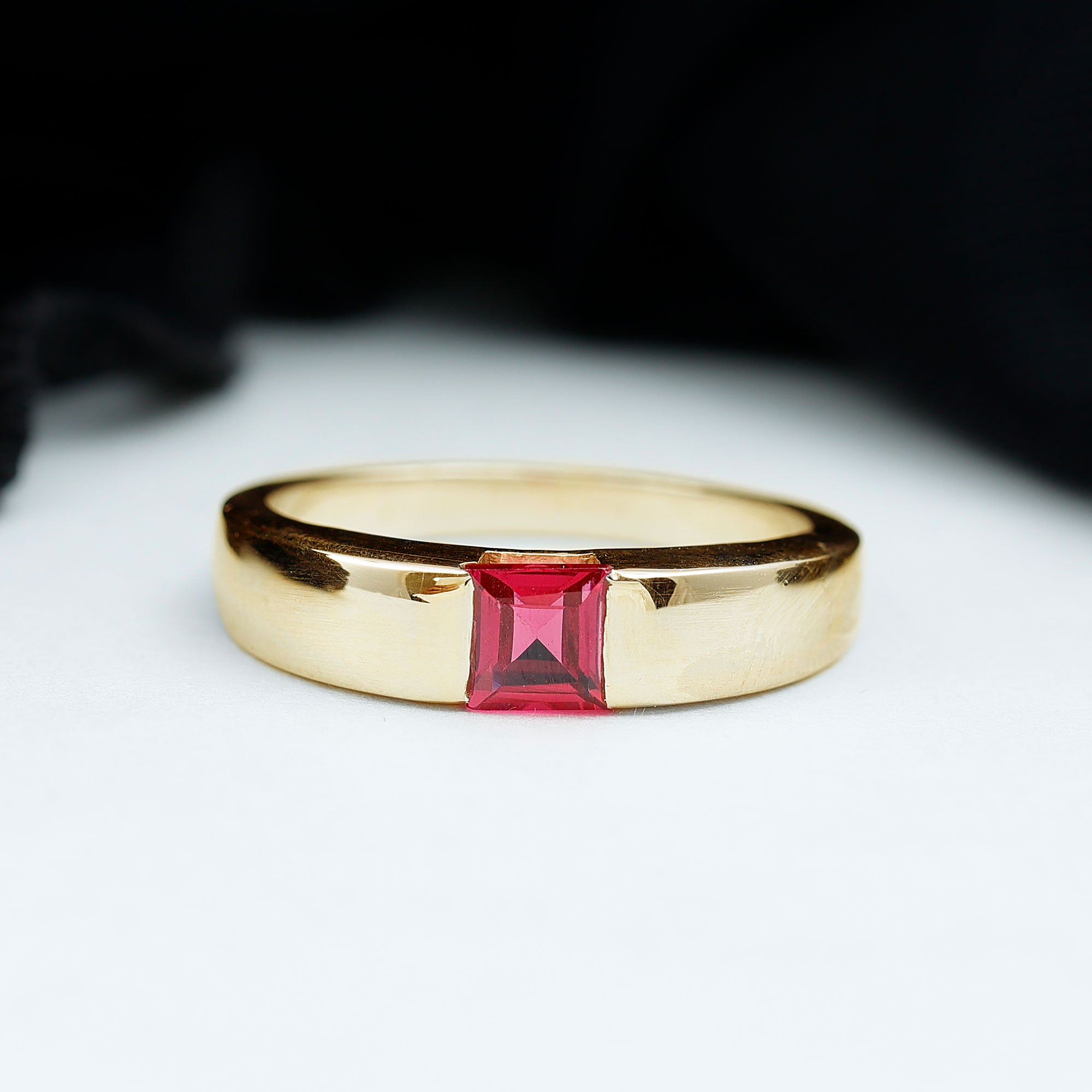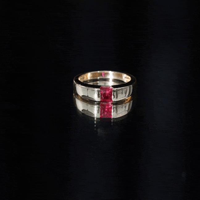 The Solitaire Engagement Ring features a 4.5 MM Princess Cut Lab Created Ruby set with Tension Mount Setting. The Solid Gold crafted Unisex Engagement Ring is a perfect piece to propose your love with.