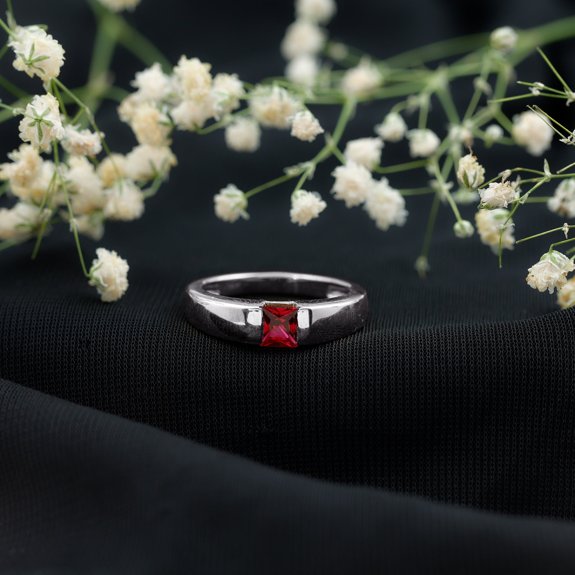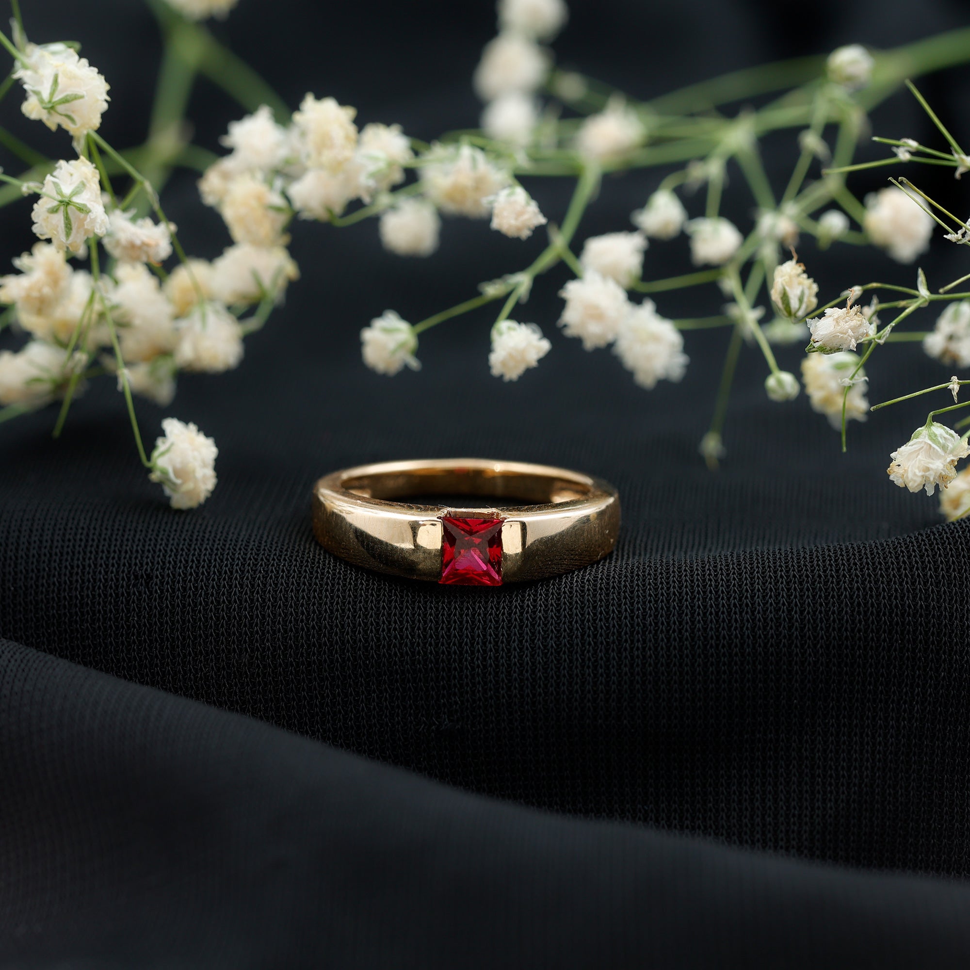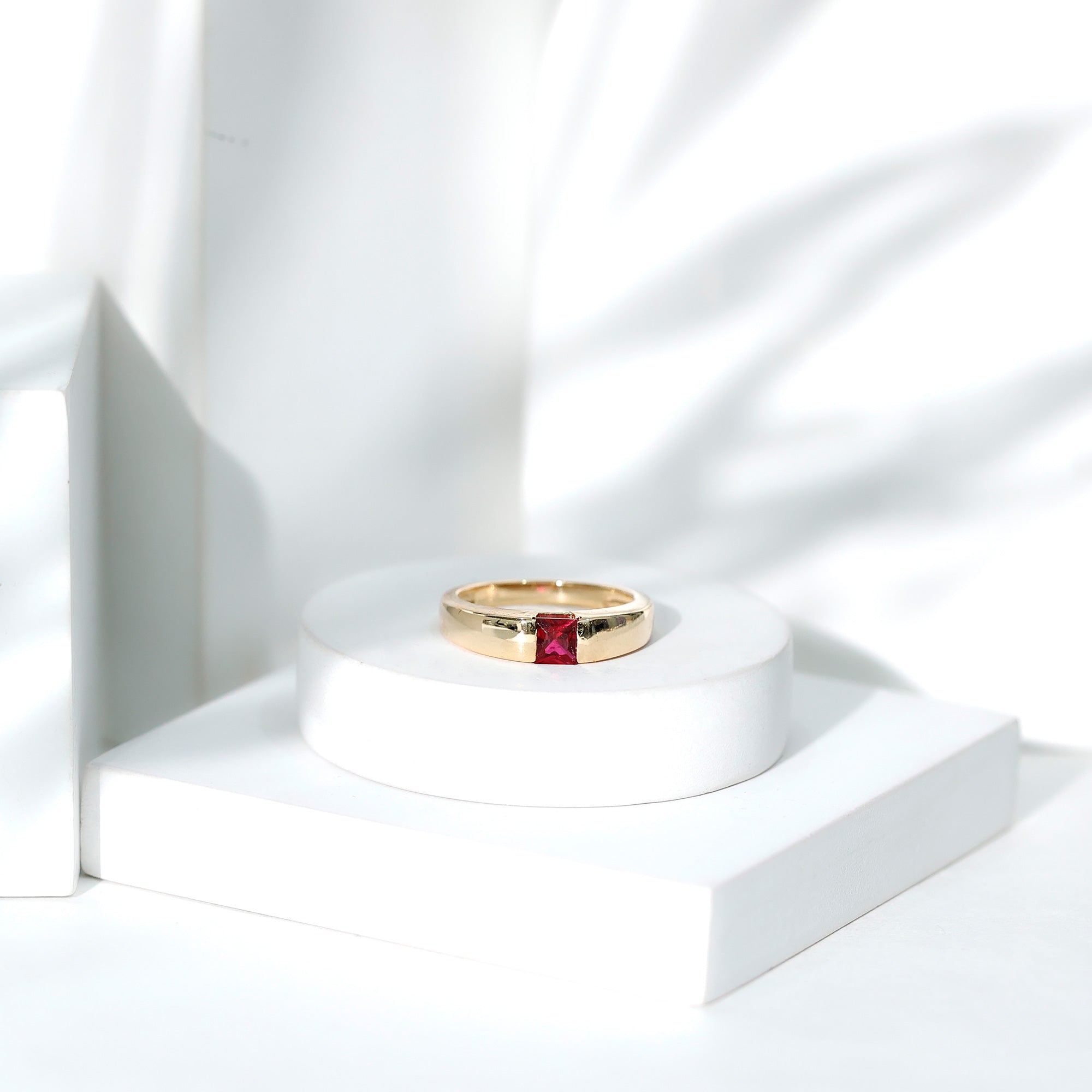 The Solitaire Engagement Ring features a 4.5 MM Princess Cut Lab Created Ruby set with Tension Mount Setting. The Solid Gold crafted Unisex Engagement Ring is a perfect piece to propose your love with.