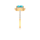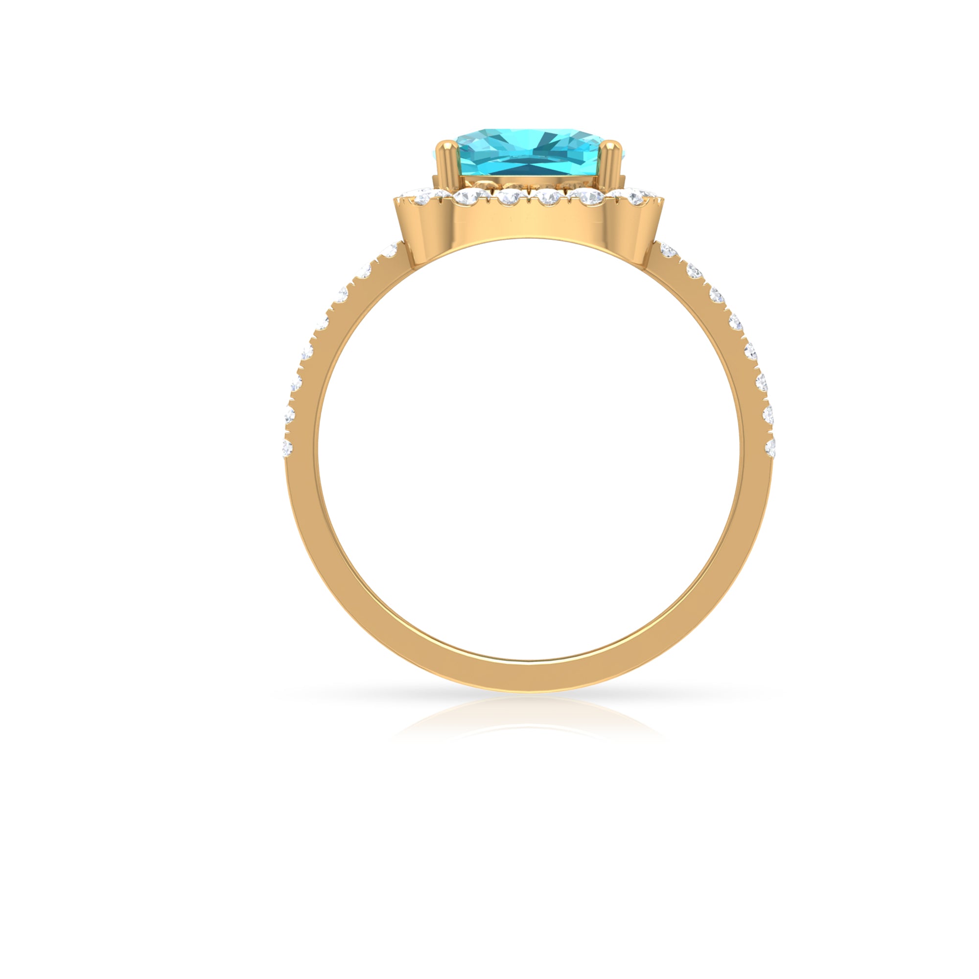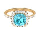 The Engagement Ring is an eye-catching Solid Gold Jewelry. It has Cushion Cut Swiss Blue Topaz set as a Solitaire in Prong Setting and Brilliant Round Shape Diamond as Halo and Side Stones. Grab this Engagement Ring for your lady love as your birthday present.