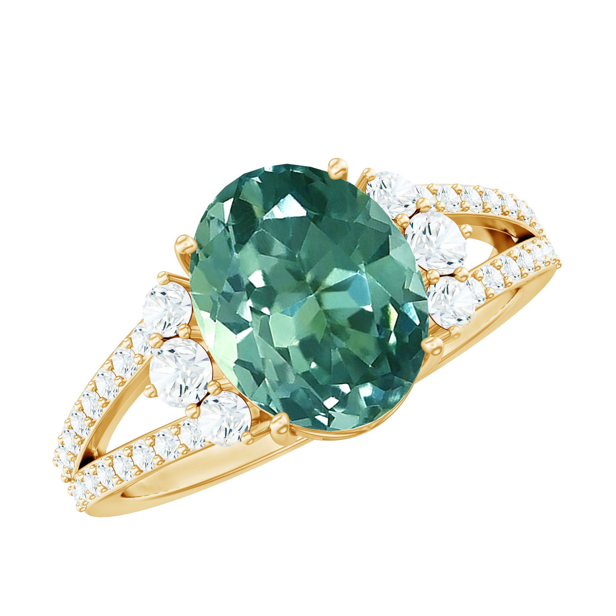 Start a beautiful new chapter with this eye-catching Green Sapphire Engagement Ring, designed to stand out with color, sparkle, and lasting charm. The ring showcases an impressive 8X10 MM oval shaped lab created green sapphire secured in prong setting, highlighting its vibrant hue. With a total gemstone weight of 4 carats and AAAA quality, the sapphire delivers bold color, excellent durability, and a look that is made to be worn and admired often. Adding extra brilliance, the split shank is decorated with petite round moissanites that shimmer with every movement. These D-VS1 quality moissanites bring sparkle and elevate the design, creating a stunning contrast against the lush green gemstone. The combination of vivid color and bright accents gives the Green Sapphire and Moissanite Ring a confident and modern appeal while keeping the look timeless. Thoughtfully crafted for everyday comfort and long-term wear, this Oblong Engagement Ring blends beauty with strength. Its distinctive design makes it a standout choice for marking a meaningful milestone or celebrating a lifelong promise. Whether worn daily or saved for special moments, this Split Shank Ring tells a story of love, commitment, and individuality - making your special day feel even more unforgettable.